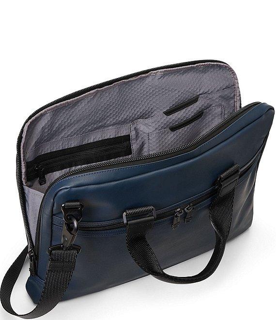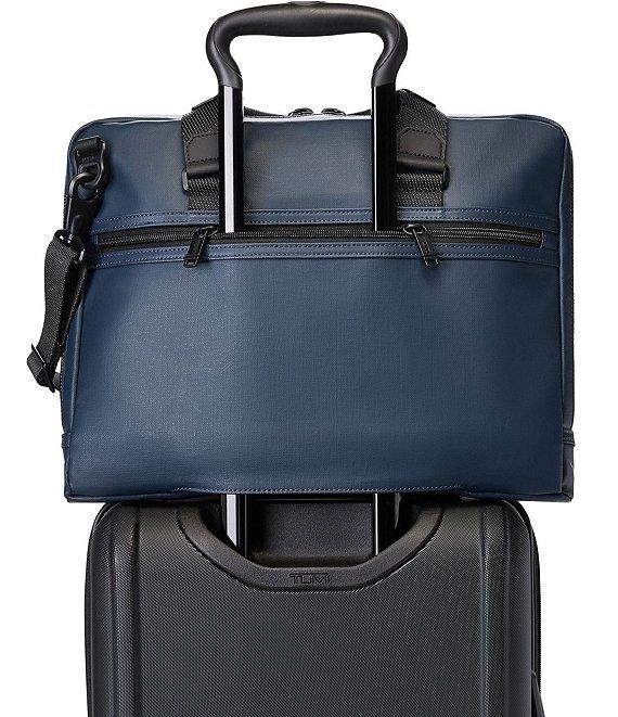 From Tumi, this brief features: Exterior Features: Zip entry to main compartment Top handles with leather accent Detachable shoulder strap Add-a-Bag sleeve Daisy chain loop system Tumi compatible (Sold separately, learn more below) 2 front L-zip pockets Luggage tag Monogram patch Front quick-access pocket with hidden magnetic snap closure Back zip pocket Interior Features: Key leash Pen loop 2 card pockets Media pocket Zip pocket Open pocket Padded tablet pocket Padded laptop compartment (fits up to a 15 PC or 16 MacBook screen), Tumi Tracer This modern brief offers all the pockets you need to go to and from the office. It's crafted with Italian coated canvas developing character and softness the more you wear it. Imported.