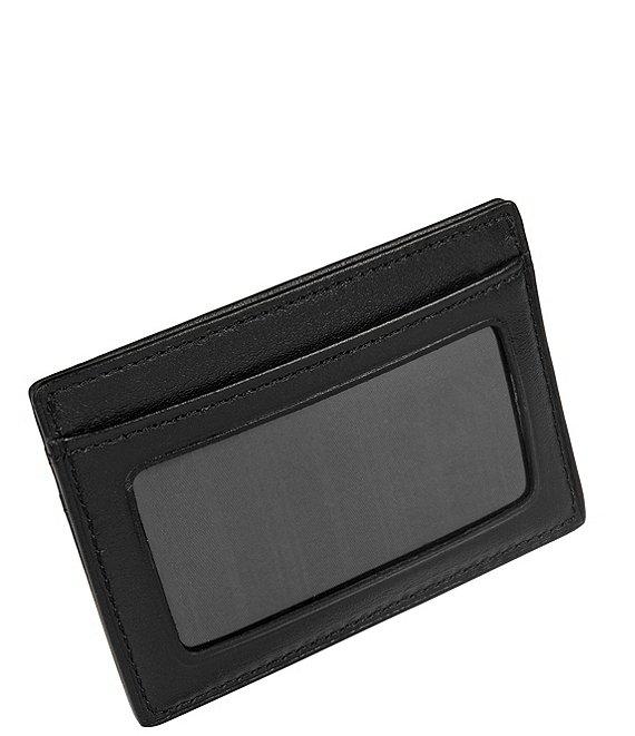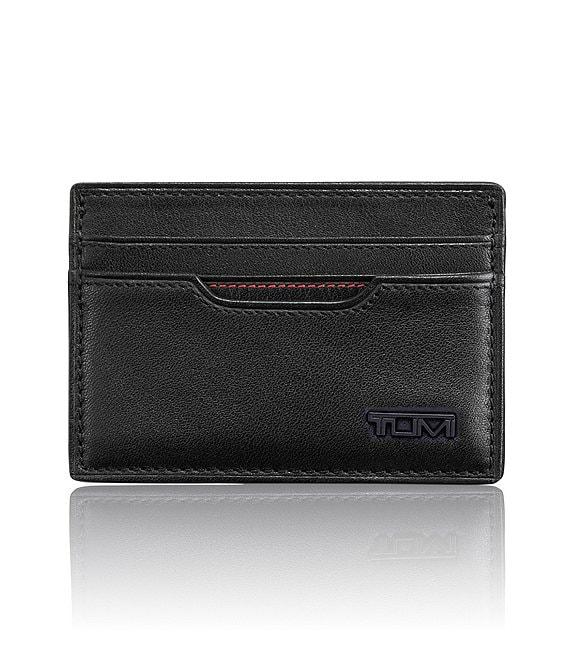 From Tumi, this Delta collection card case features: interiors with contrasting stitch detailing ballistic nylon spine easy-access front card pockets and a bill section with leather back wall ID window on one side; card slots on the other center section Tumi ID Lock -- a proprietary technology incorporated into the design of this product that protects personal data encoded on most IDs, credit cards and passports comes in an elegant gift box 2.75" x 4" x .375" soft, full-grain napa leather Imported.
