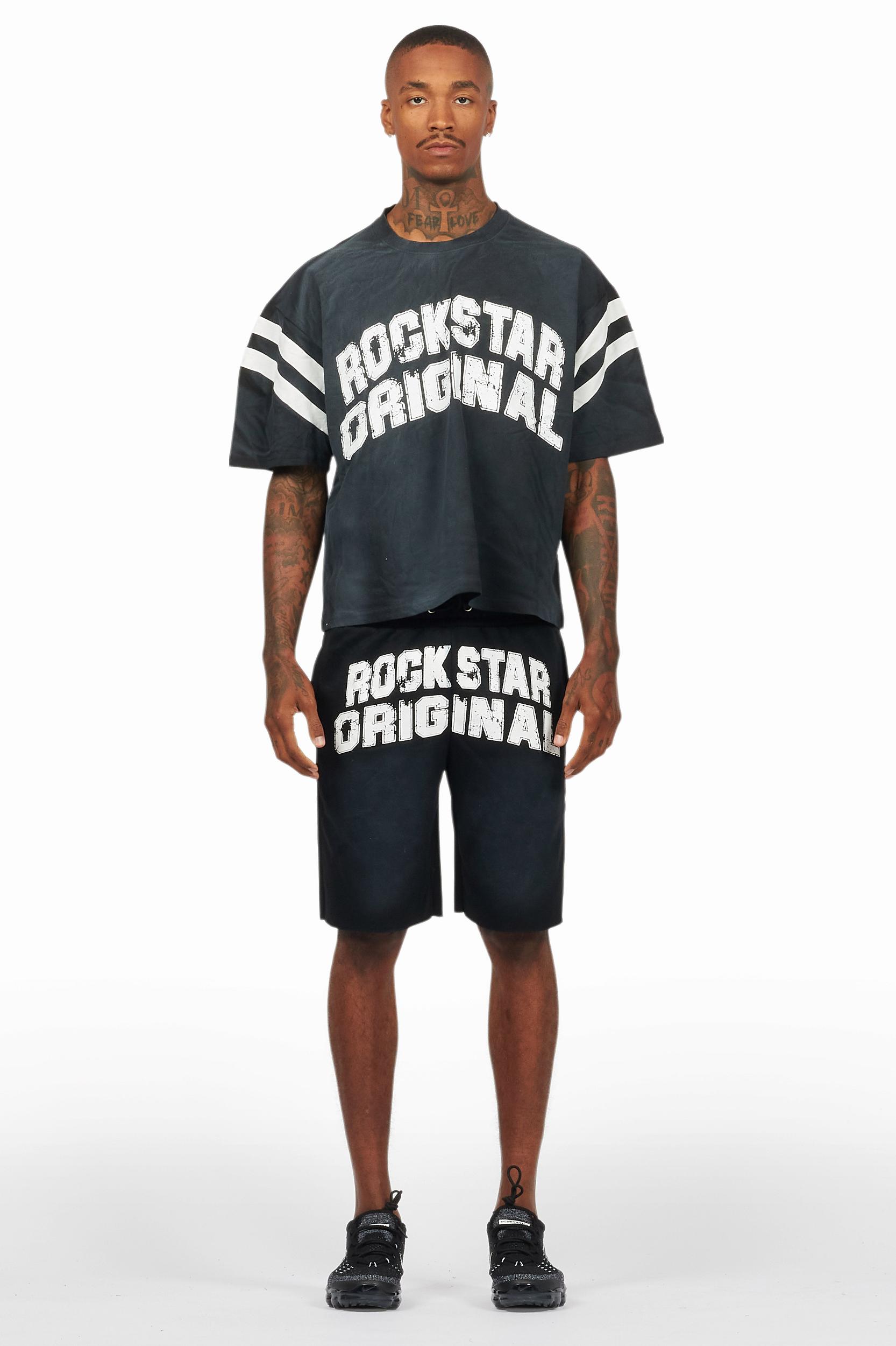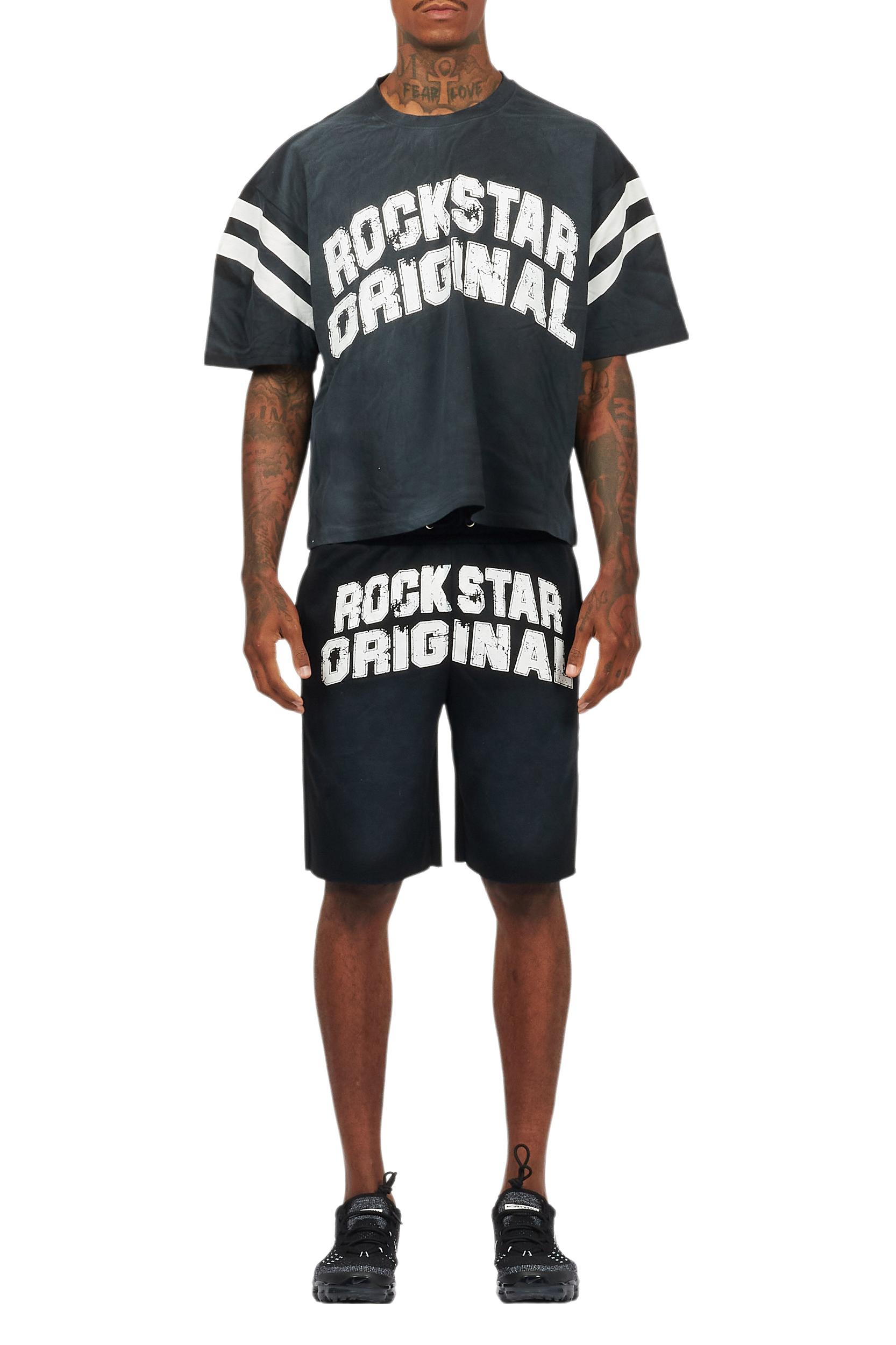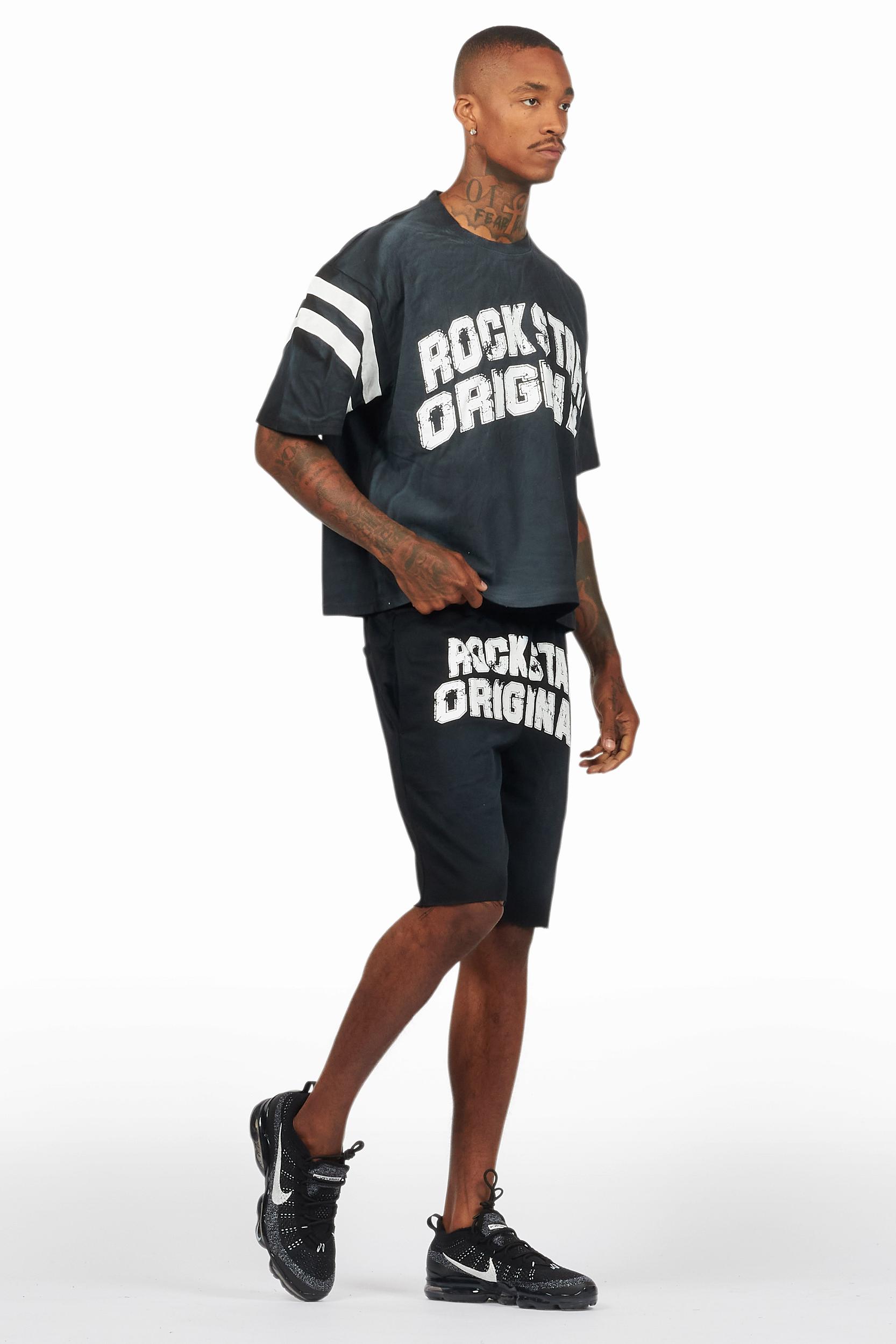 An urban two-piece athleisure tee and short set for men in black. Designed with organic cotton and custom detailing for a lightweight everyday set. Crew neckline Short sleeves Pullover style Boxy-fit Drawstring waistband Mid-rise waist line Dual slant pockets Barrel-leg trousers Custom RSO graphics