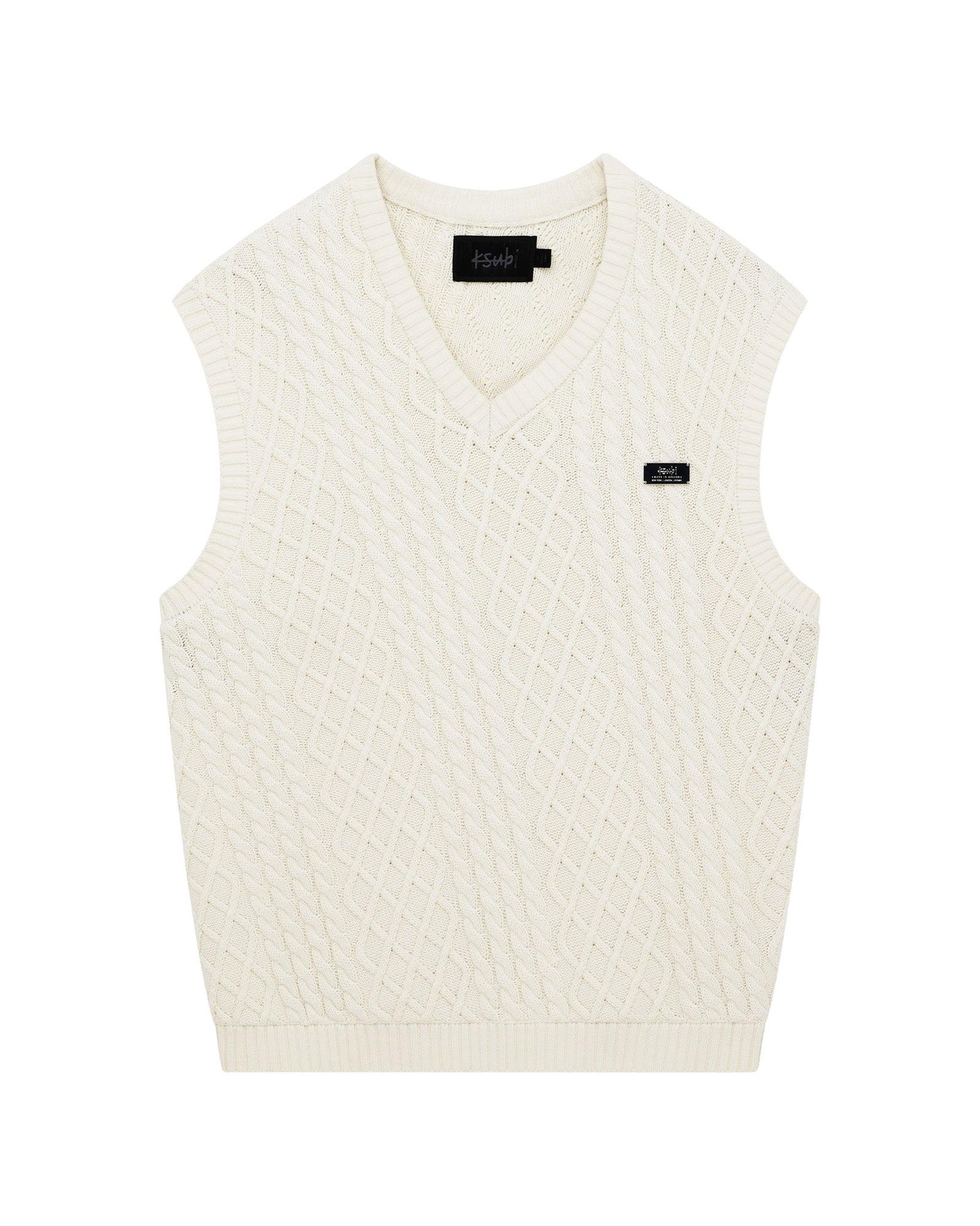 The Turncable Knit Vest Vintage White is a boxy fit, sleeveless vest featuring a v-neckline and ribbed hem. Knitted from 100% cotton yarn in a diagonal cable pattern, it's finished with a Ksubi metal plate on the chest and T-box riveted branding.