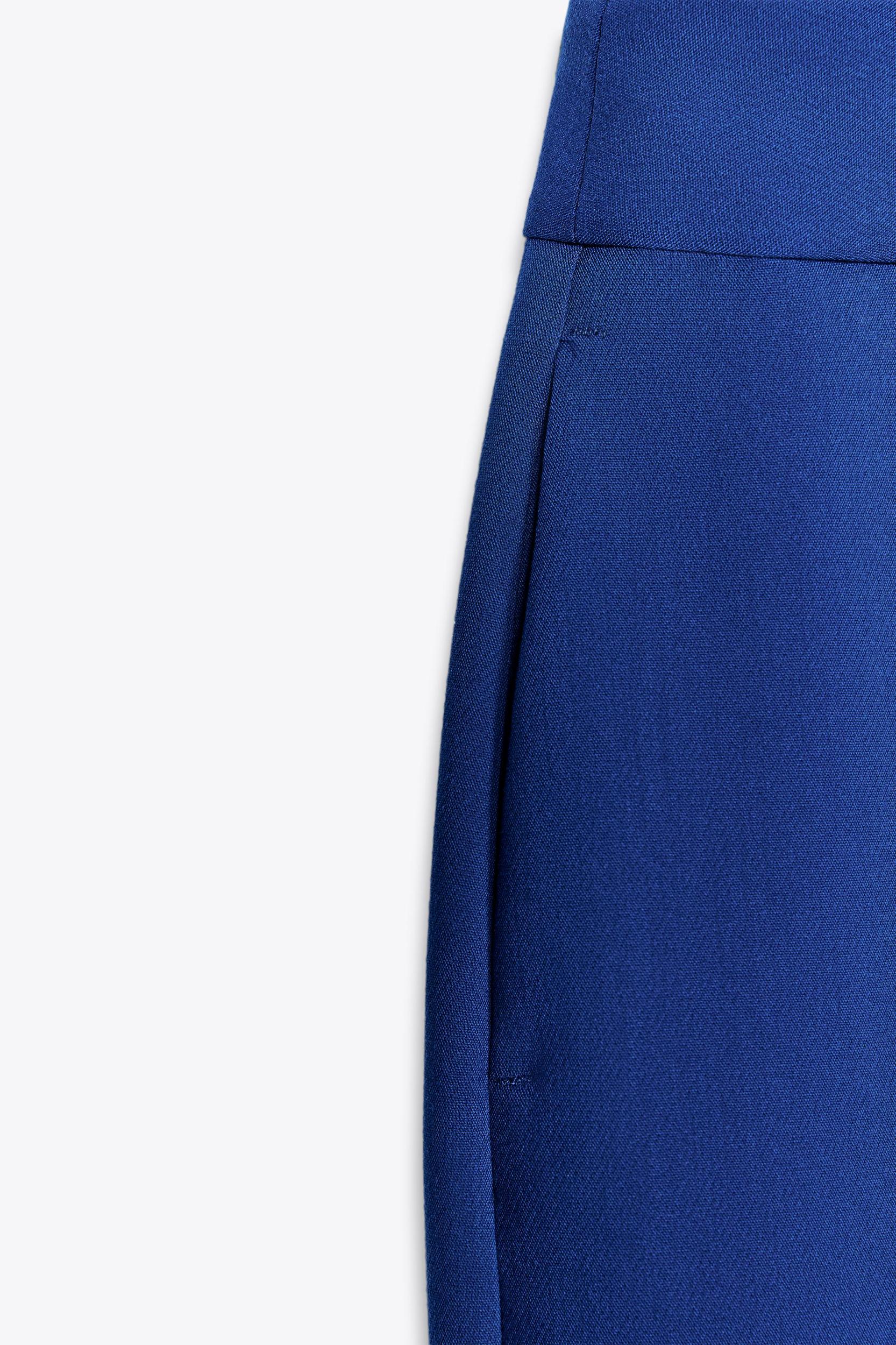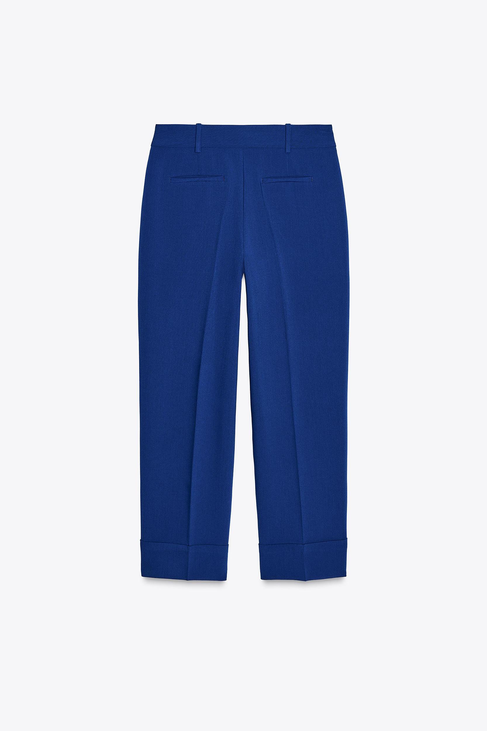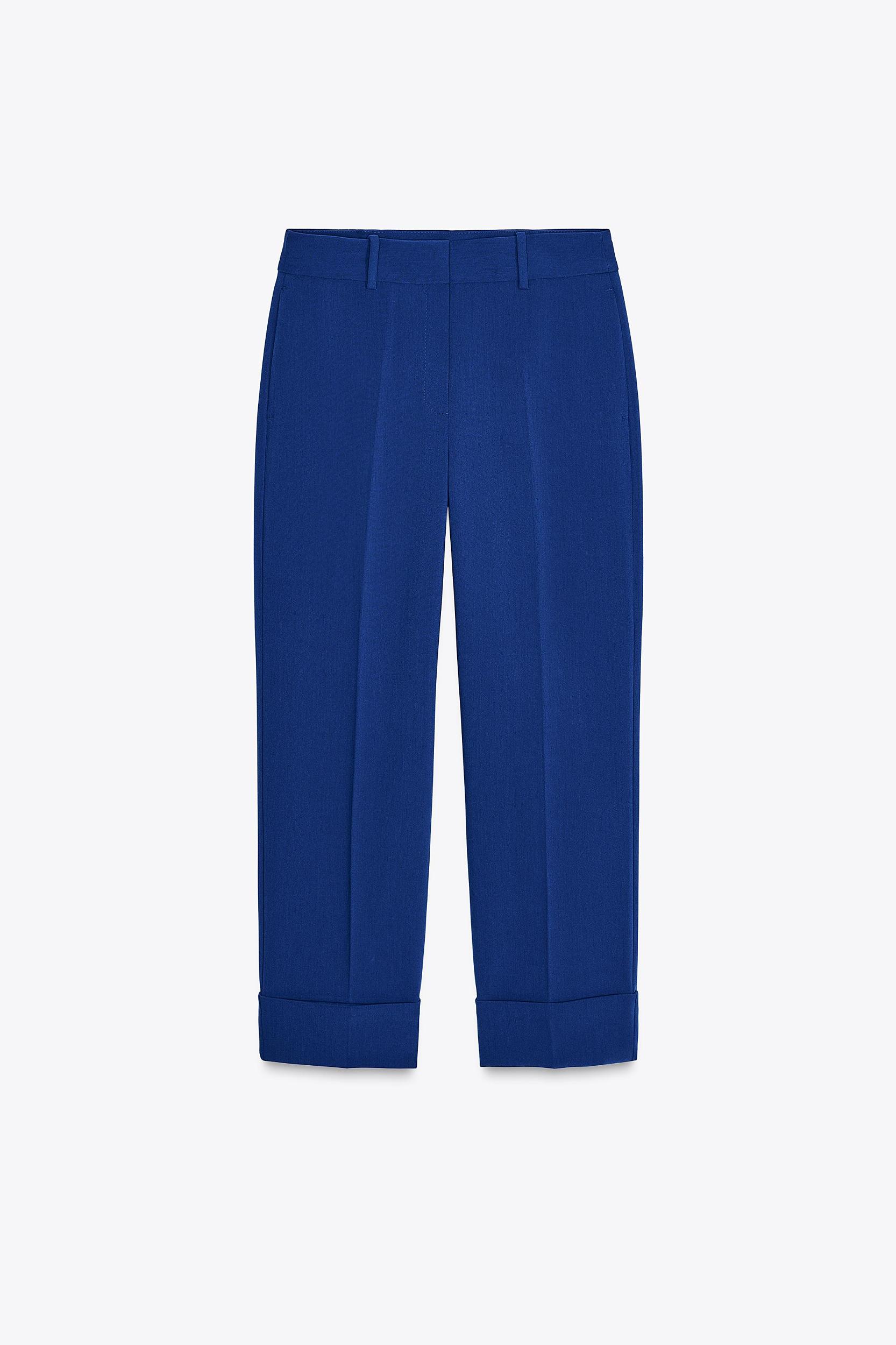 Pants with a high waist with front pockets and false back welt pockets. Straight legs with cuffs. Front zip, interior button and hook closure.