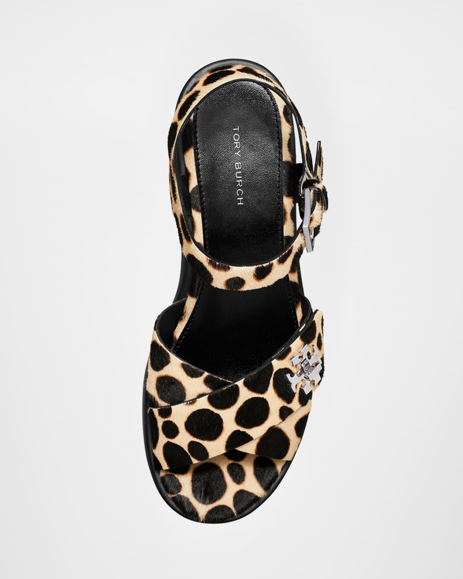 Tory Burch platform sandals in animal printed calf hair (Vietnam) and leather with silver-tone Double T hardware 2.00 in / 50 mm block heel Open toe Crisscross vamp Buckle ankle strap Lightweight, flexible EVA outsole Lining: Leather Spot clean Imported