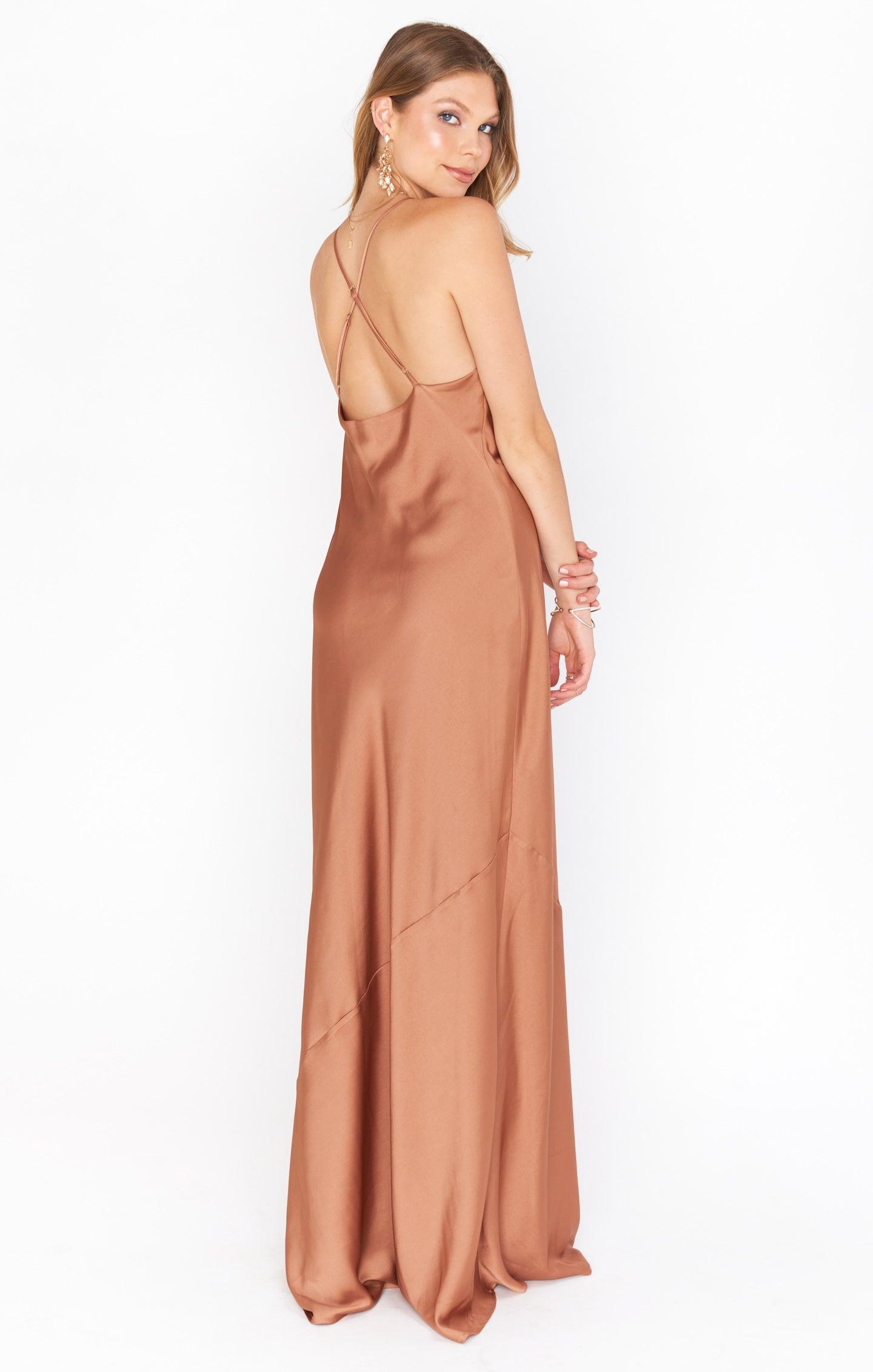 The Tuscany is a floor length slip dress drapes in the most flattering way from being cut on the bias. The cowl neckline is ultra chic for a range of bust sizes with a bult in shelf bra lining and criss cross straps that help you feel secure. Whether you're a bridesmaid, bride, or guest this new maxi will be a formal dress you keep going back to.