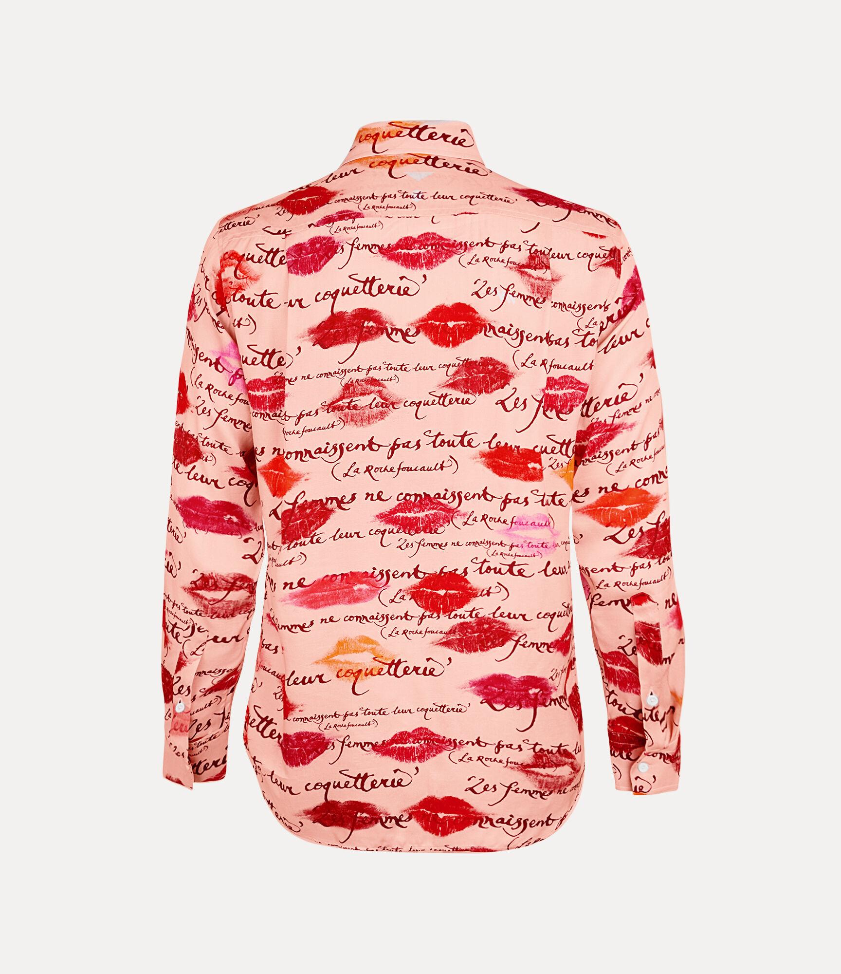 Our Tuxedo shirt features an exaggerated pointed collar, complete with a concealed button placket. The piece is adorned with the ‘Kisses’ artwork, inspired by our 'Boudoir' perfume packaging, layered with Vivienne's hand-written ‘Les Femmes Ne Connaissent Pas Toute Leur Coquetterie’ motif.