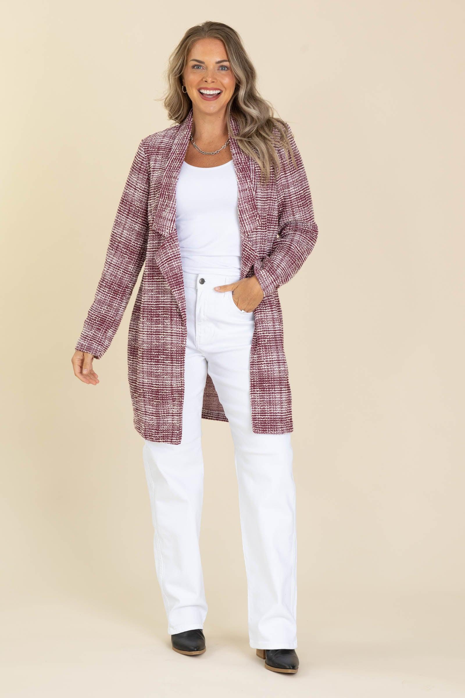 Product Details Colors: Wine, White/ Black, White/ Lavender, White, Pink, Black Print: Two-Tone Neckline: Open Front Sleeve: Long Sleeve Hemline: Straight Brand: Dear Scarlett Material and Care 79% Polyester 18% Cotton 3% Spandex Hand Wash Cold Hang/Line Dry Size and Fit Small: Bust 36" Waist 34" Length 35.5" Medium: Bust 38" Waist 36" Length 36" Large: Bust 40" Waist 38" Length 36.5" X Large: Bust 42" Waist 40" Length 37" 1X Large: Bust 44" Waist 42" Length 37.5" 2X Large: Bust 46" Waist 44" Length 38" 3X Large: Bust 48" Waist 46" Length 38.5" Erica is 5’7” and wearing her true size small