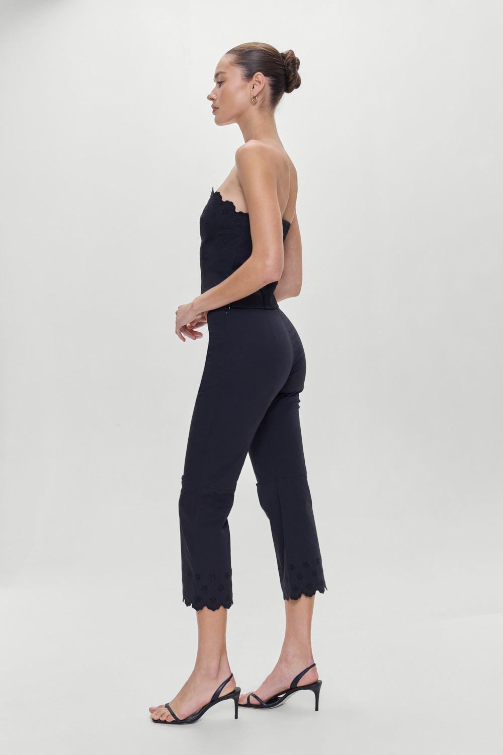 Description The Twilight capri pants are a new favorite with their crisp poplin feel and low rise fit. Complete the look with the Twilight corset top. Details Special embroidery on the hem Side seam zipper Fabric 98% Cotton + 2% Spandex Model Size & Fit This style runs true to size Anna is wearing a size Small Height 5' 10" (178cm) Bust 32" (81), Waist 23.5” (59.7cm), Hips 34.5” (87.6cm)