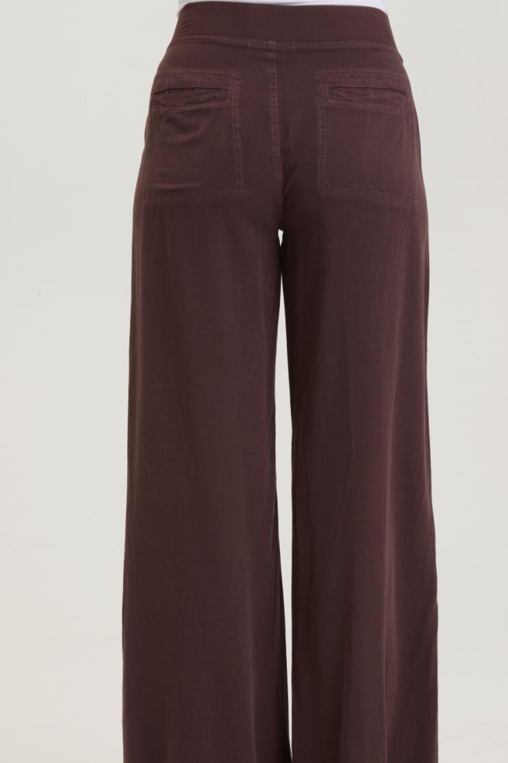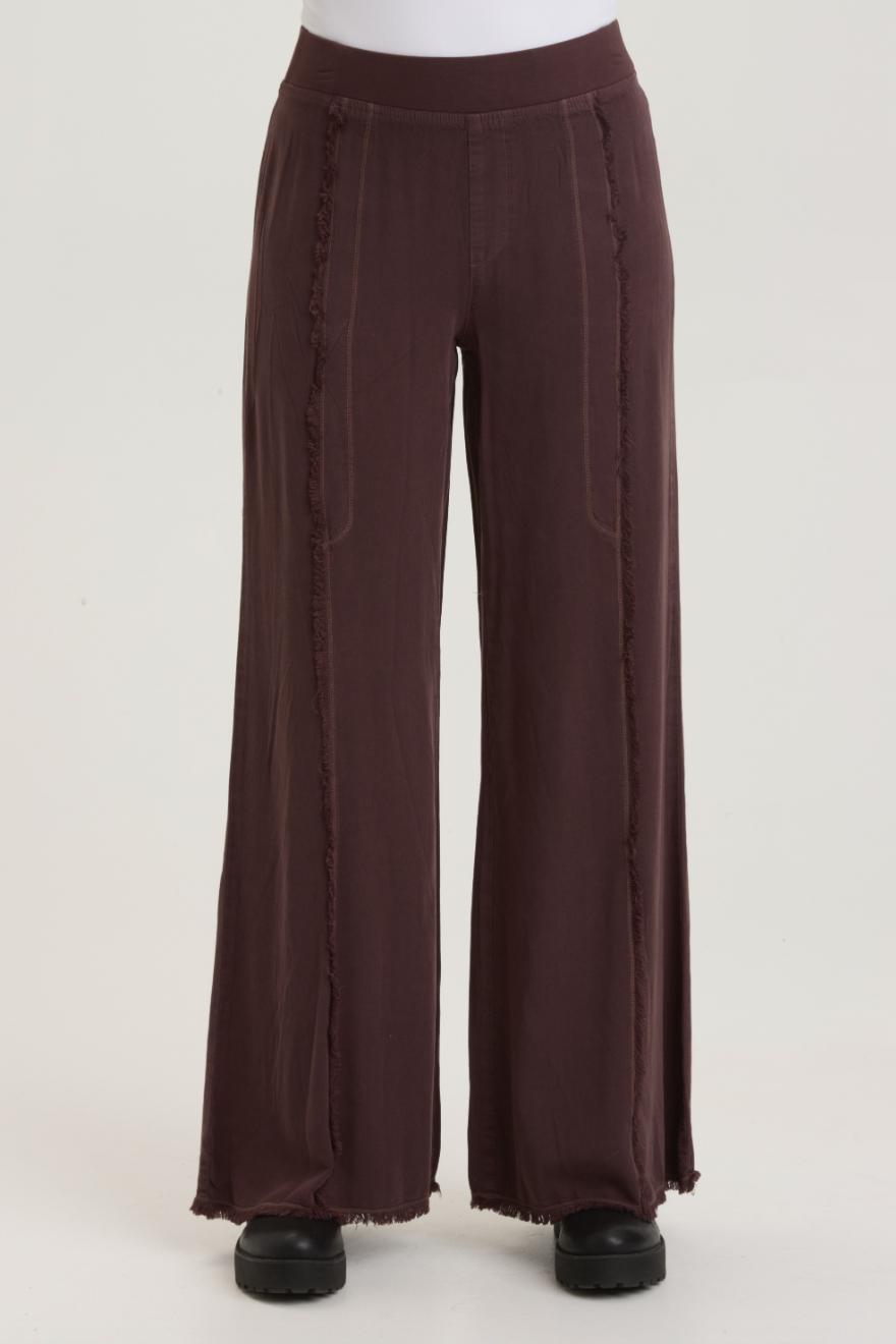Long pant with a banded waist and raw edge detail on front of the pant and hem. Rear slit pockets. Pair with the Twill Safari Jacket in Sarsaparilla.