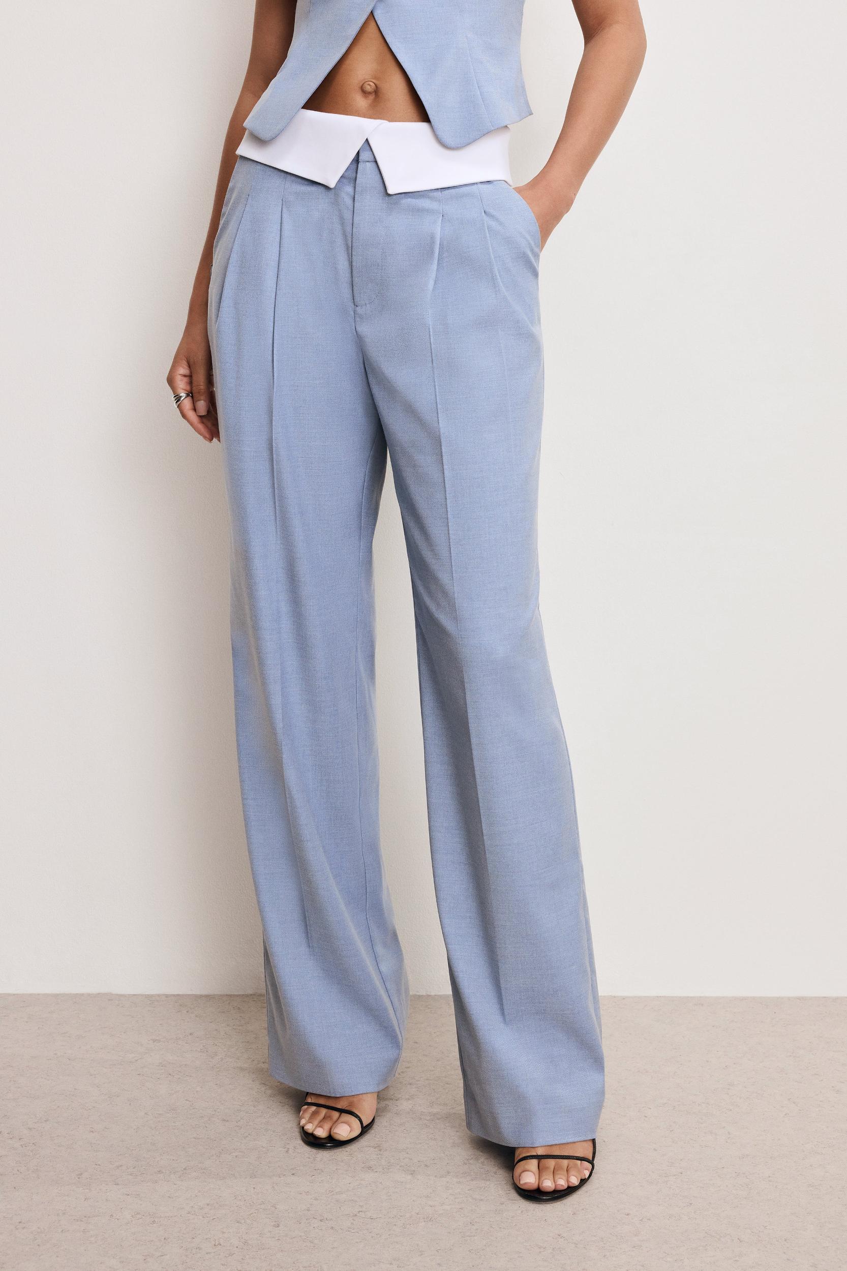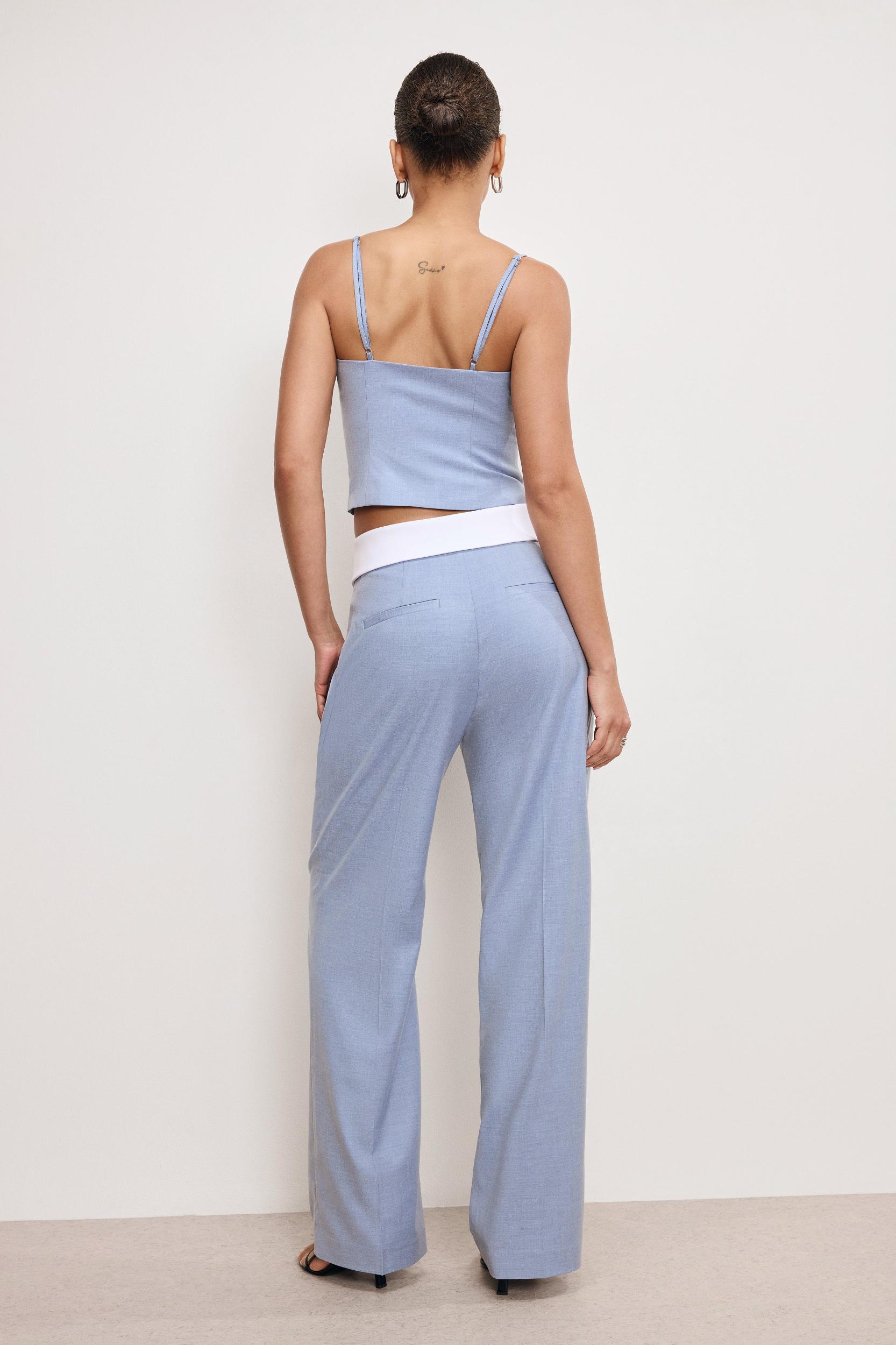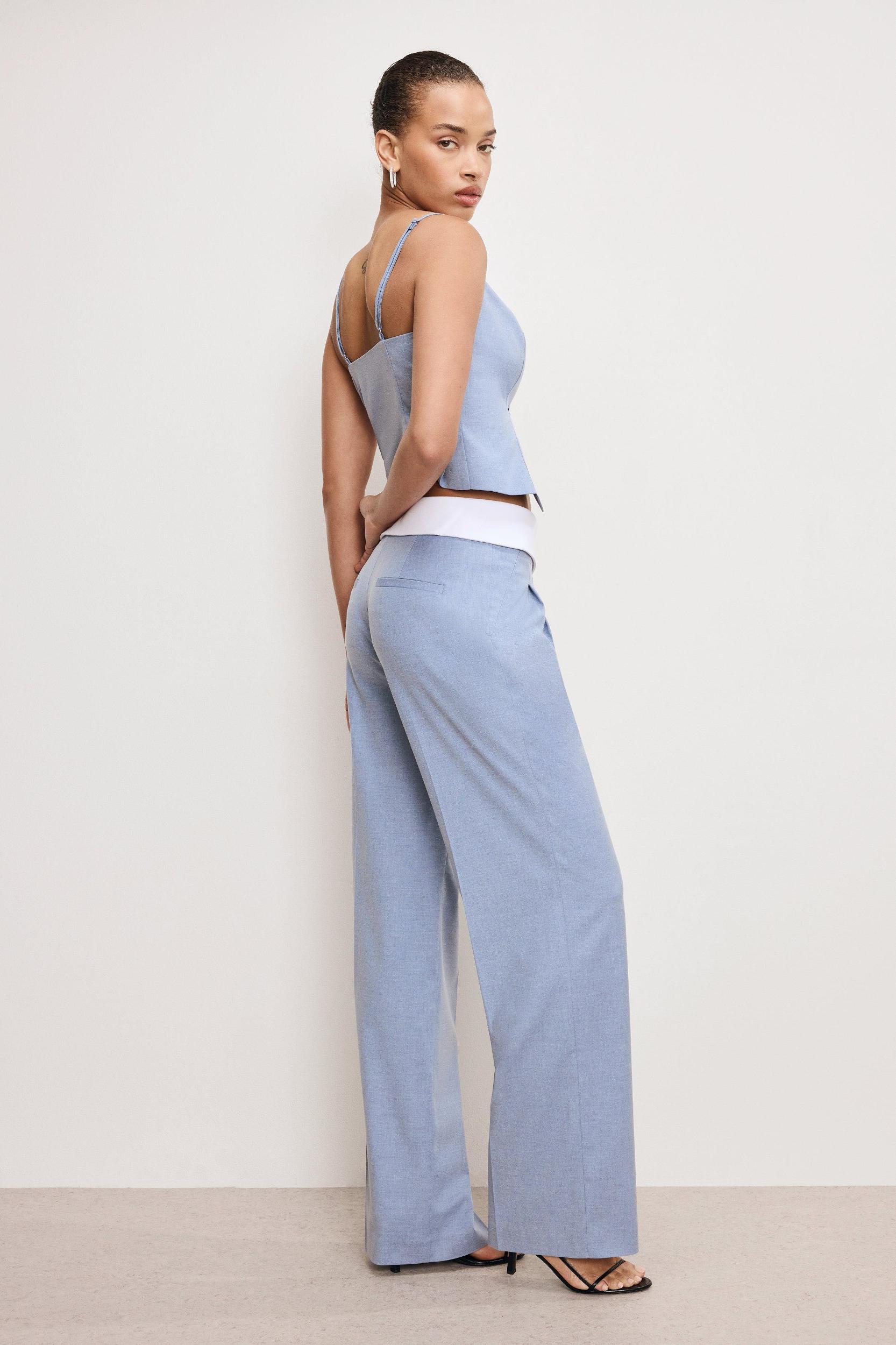 Our Twill Suiting Foldover Trouser Pant brings a sharp silhouette with a playful twist. Its foldover waistband adds just the right amount of detail to keep things interesting, no blazer required. Mid-rise Wide legs Front zip-fly closure Classic 5-pockets Gap-proof waistband Reinforced belt loops Tummy smoothing technology Medium blue wash Inseam: 26.5"