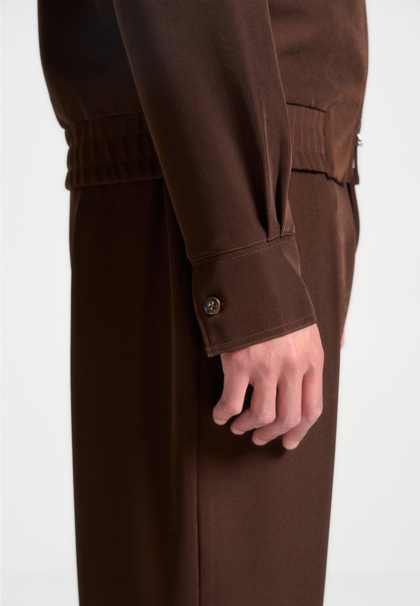 This Twill Tailored Cropped Jacket in classic brown features a structured and streamlined design. Made from high-quality twill fabric, it offers a polished and refined look. Perfect for professional settings or a sophisticated outerwear option for any ensemble. Stay on-trend with this versatile and timeless piece. Fitted Silhouette Twill Fabric Shirt Collar Front Left-Side Pocket Elasticated Waistband Marble Button Sleeve Cuff Tonal Embroidered Manière De Voir Eiffel Fabric: 96% Polyester 4% ElastaneAlways check the care label for wash instructions.