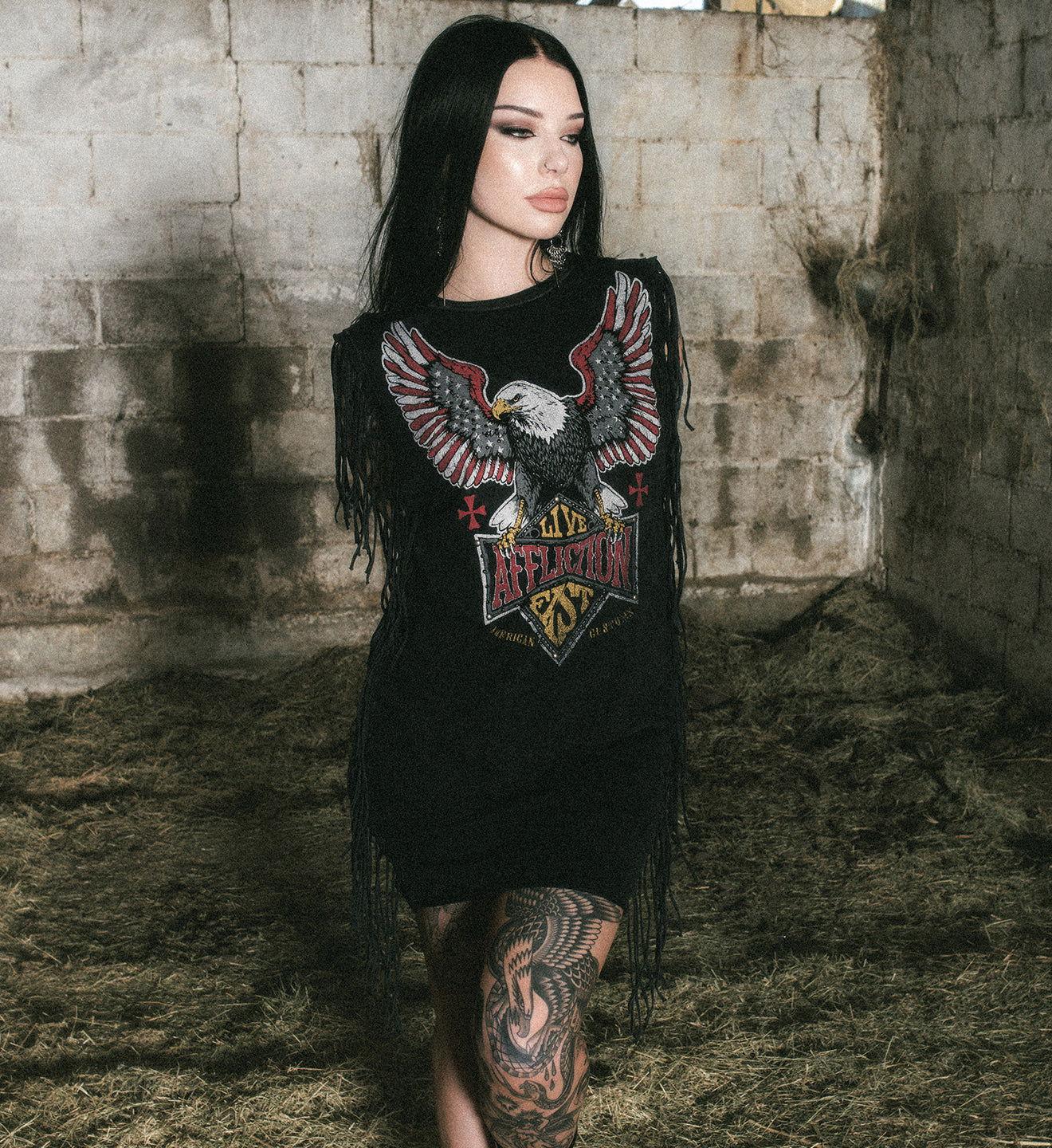 Affliction Women's Twin Turbo Fringe Dress 100% Cotton Fringe On Side Black Dome Studs On Front Art Model is wearing size Small