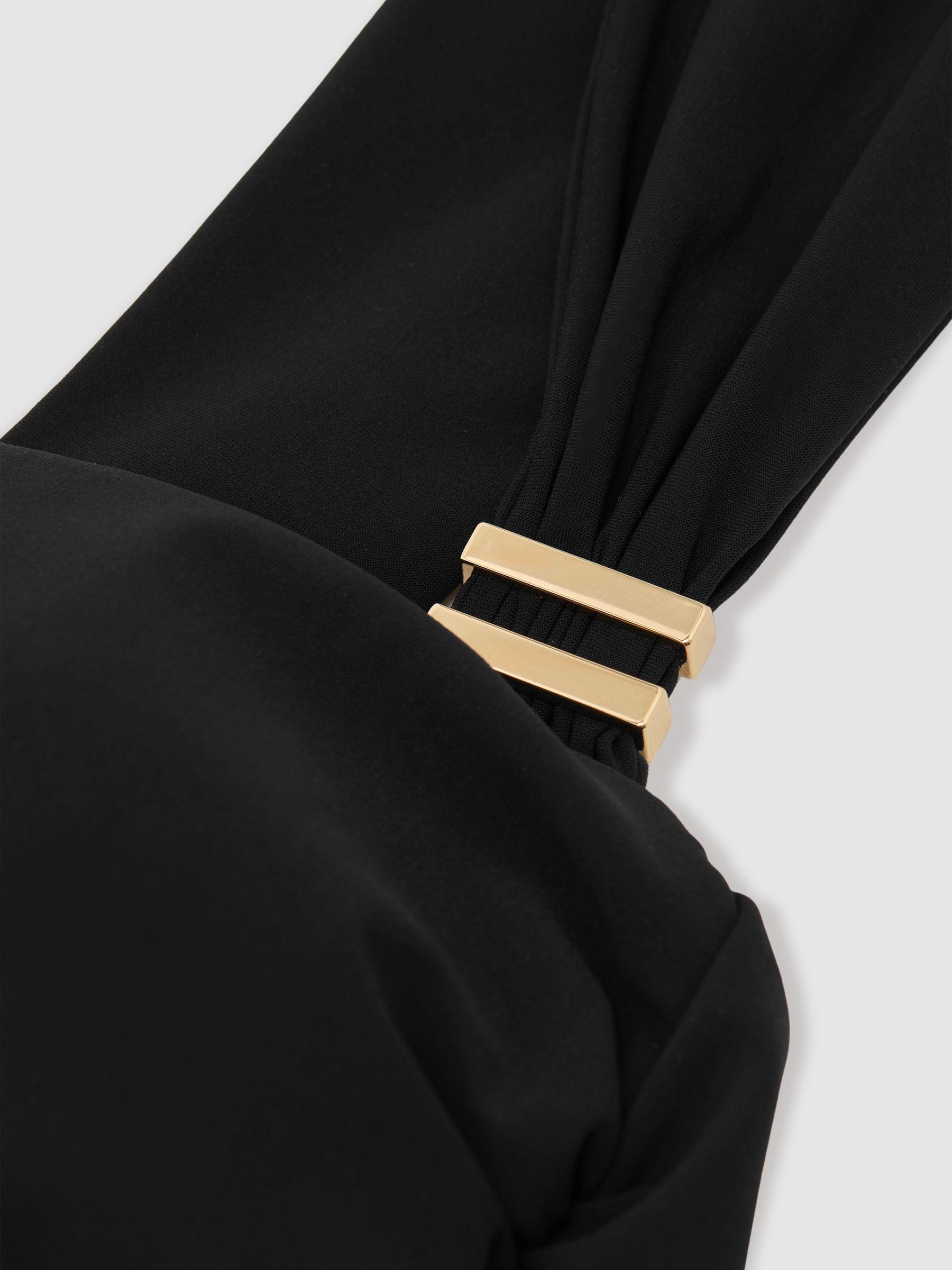 The Maisie bikini top is a bandeau style with a twist front and tapered shoulder straps. It wraps around the front and ties at the back, with gold-tone hardware lending a polished finish. Bandeau style Twist-front design Removable padding Tapered shoulder straps Gold-tone hardware Clasp and back tie fastening Matching bottoms available. The model is wearing a size 8. Measurements of Model: 5ft9 / 175cm.