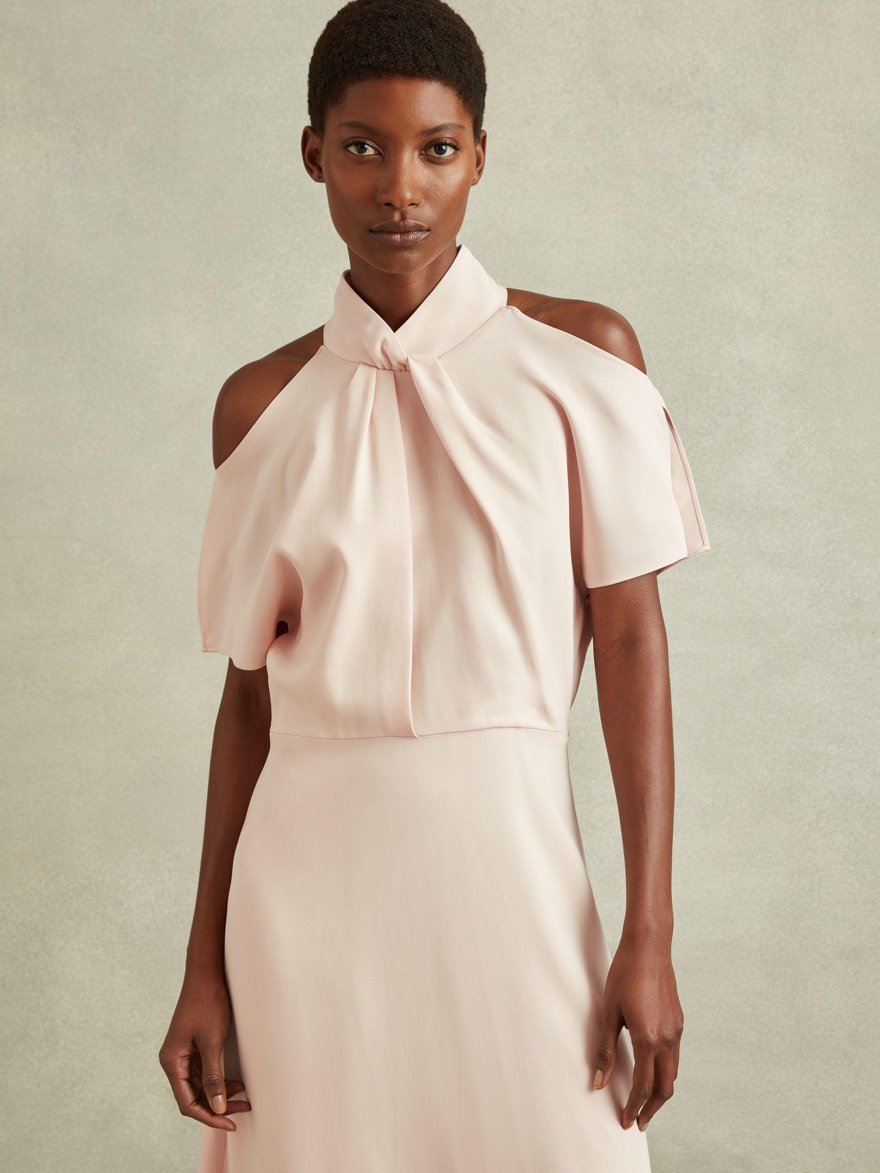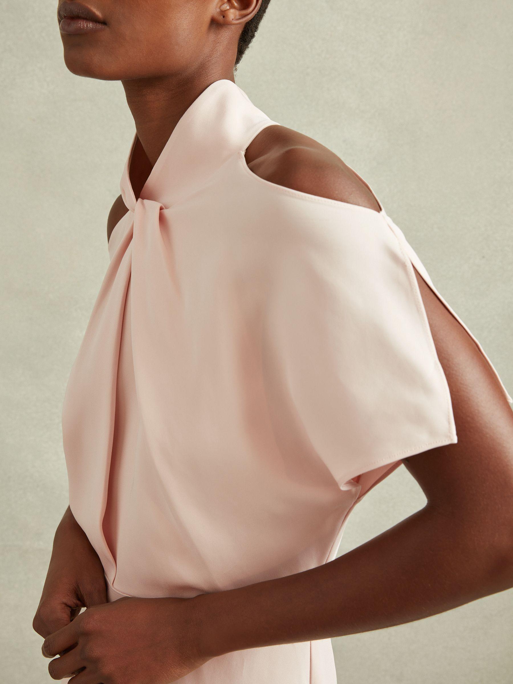 The Andressa dress hugs the waist, falling through to a dipped midi hem. Cut-outs and split sleeves flatter the shoulders and a twist-neck detail completes the style. Twist neck detail. Cut-outs to shoulders. Zip-closure to reverse. Midi length. Dipped hem. The model is wearing a size 8. Measurements of model: Height 5 9.5" / 176.53cm.