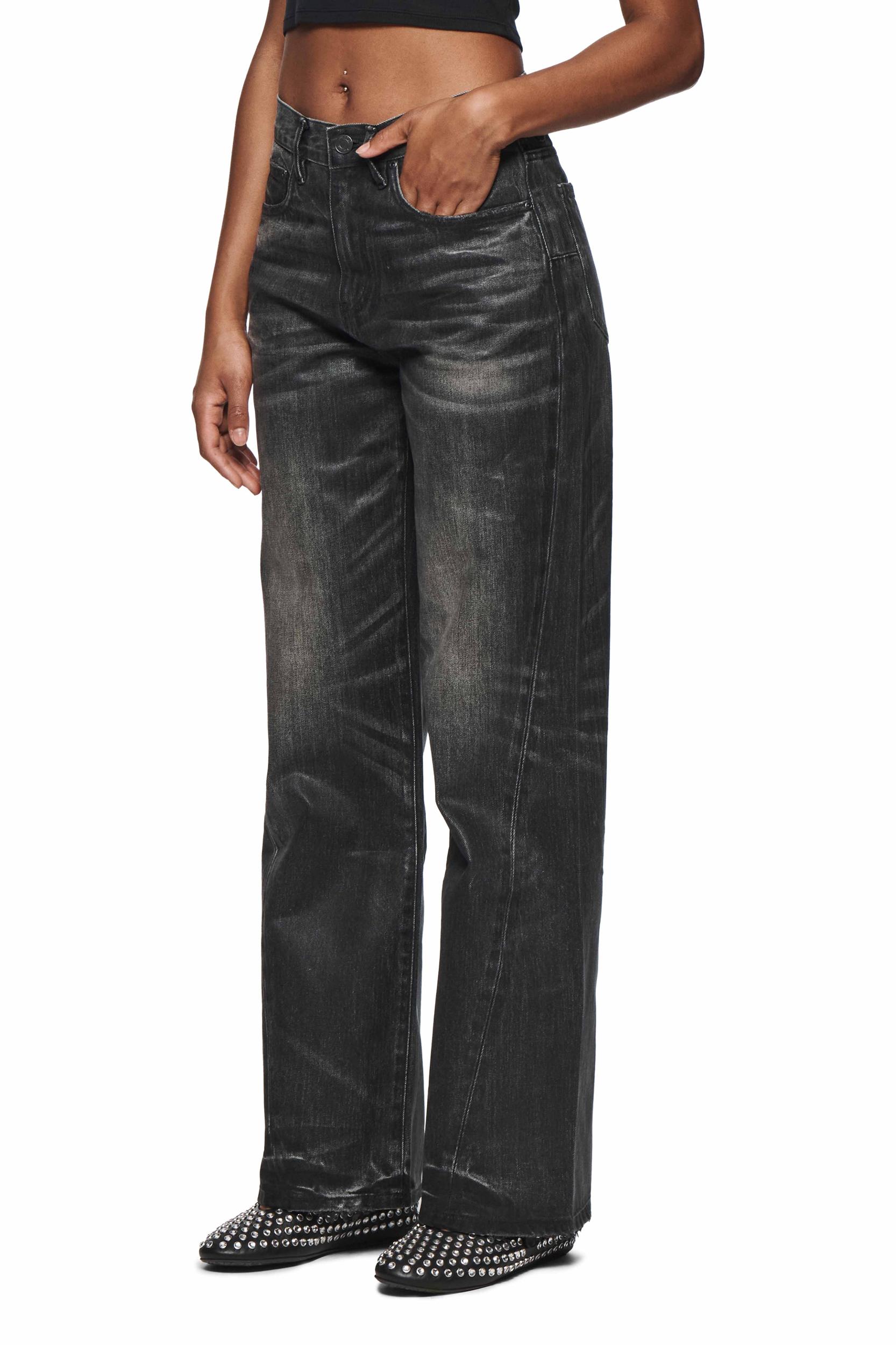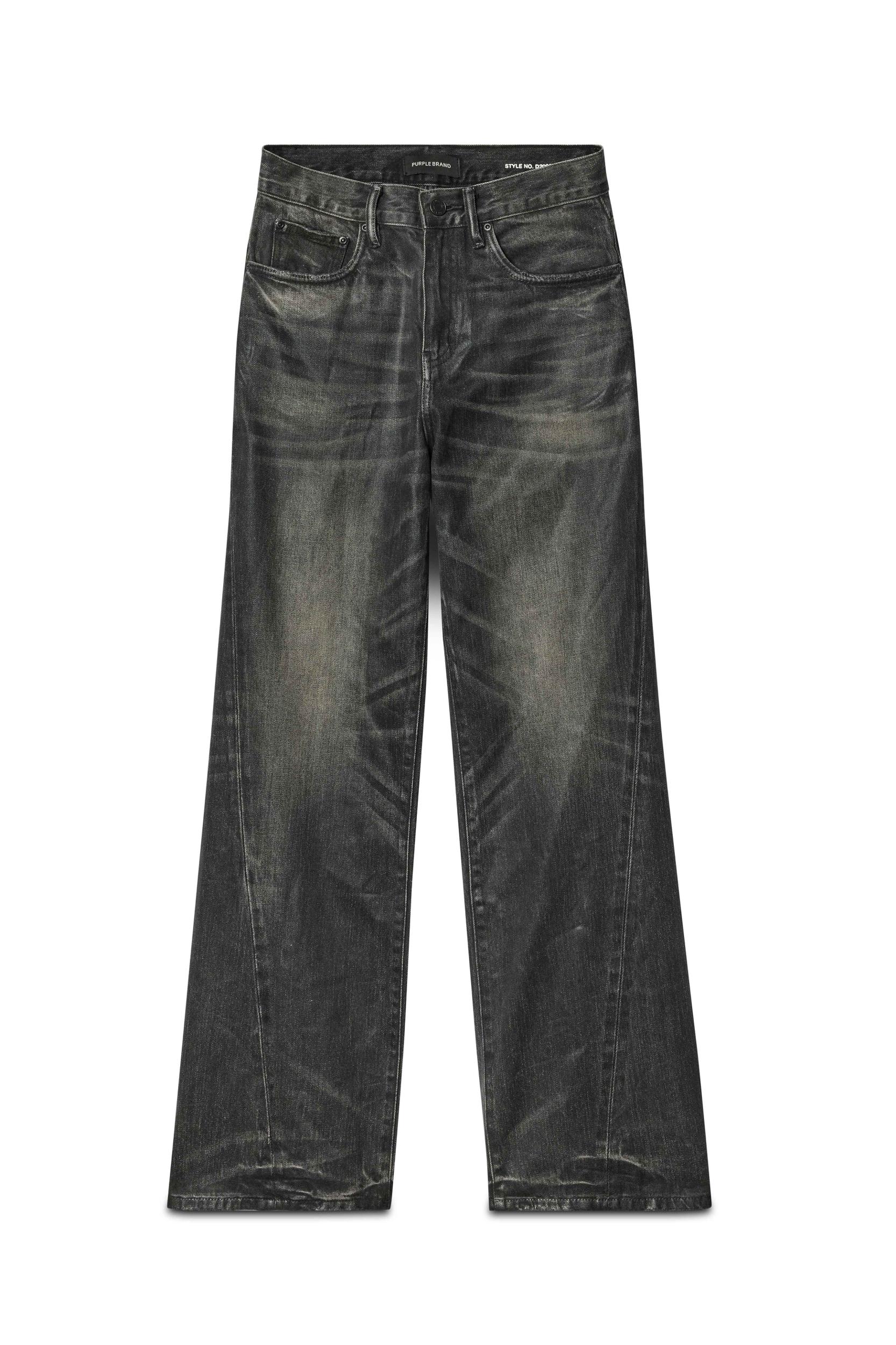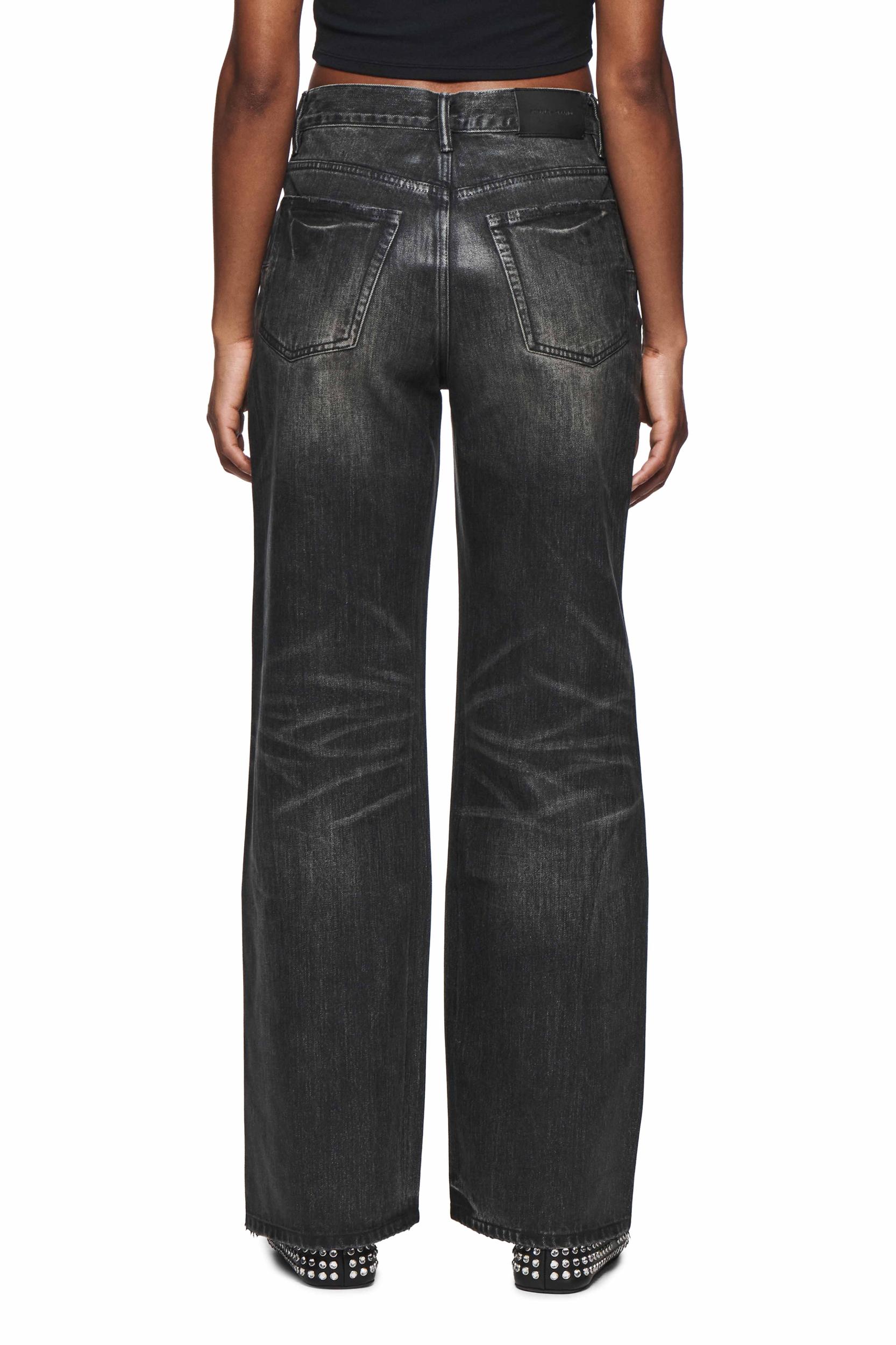 Crafted from premium black denim, this faded high-rise features a wide, baggy leg and twisted side seams. It has five pocket styling, reinforced belt loops, bar-tack stitching, chambray lining for a more comfortable fit, a custom Purple cowhide leather patch and signature hangtag branding. Fall Winter 2024 White Label 100% Cotton Coating Front Zipper Fly