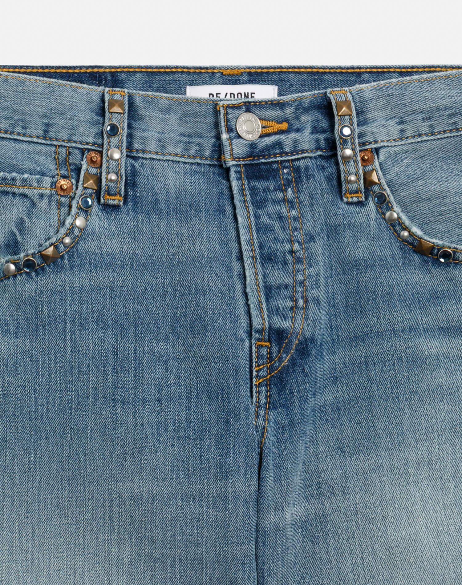 Our version of a 2000's classic bootcut with unique twist in the seams, sitting mid-rise and offering all our authentic classic touches. Features a 5 year worn wash on new heirloom all-season rigid fabric, artfully chosen mix metal studs, a classic button fly, a finished hem.