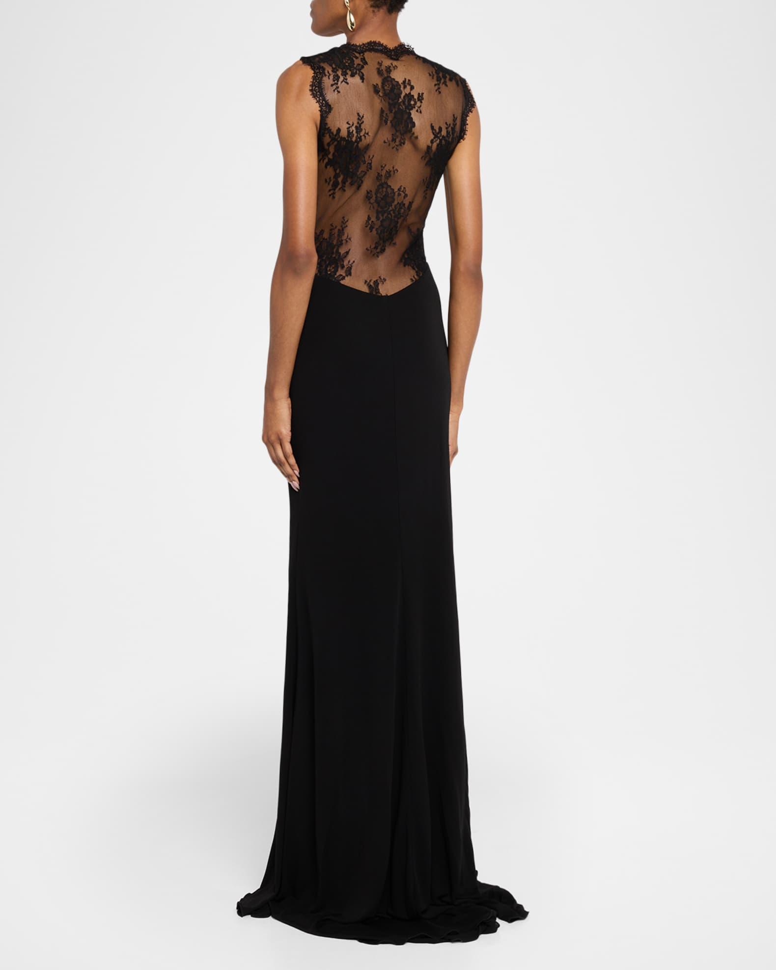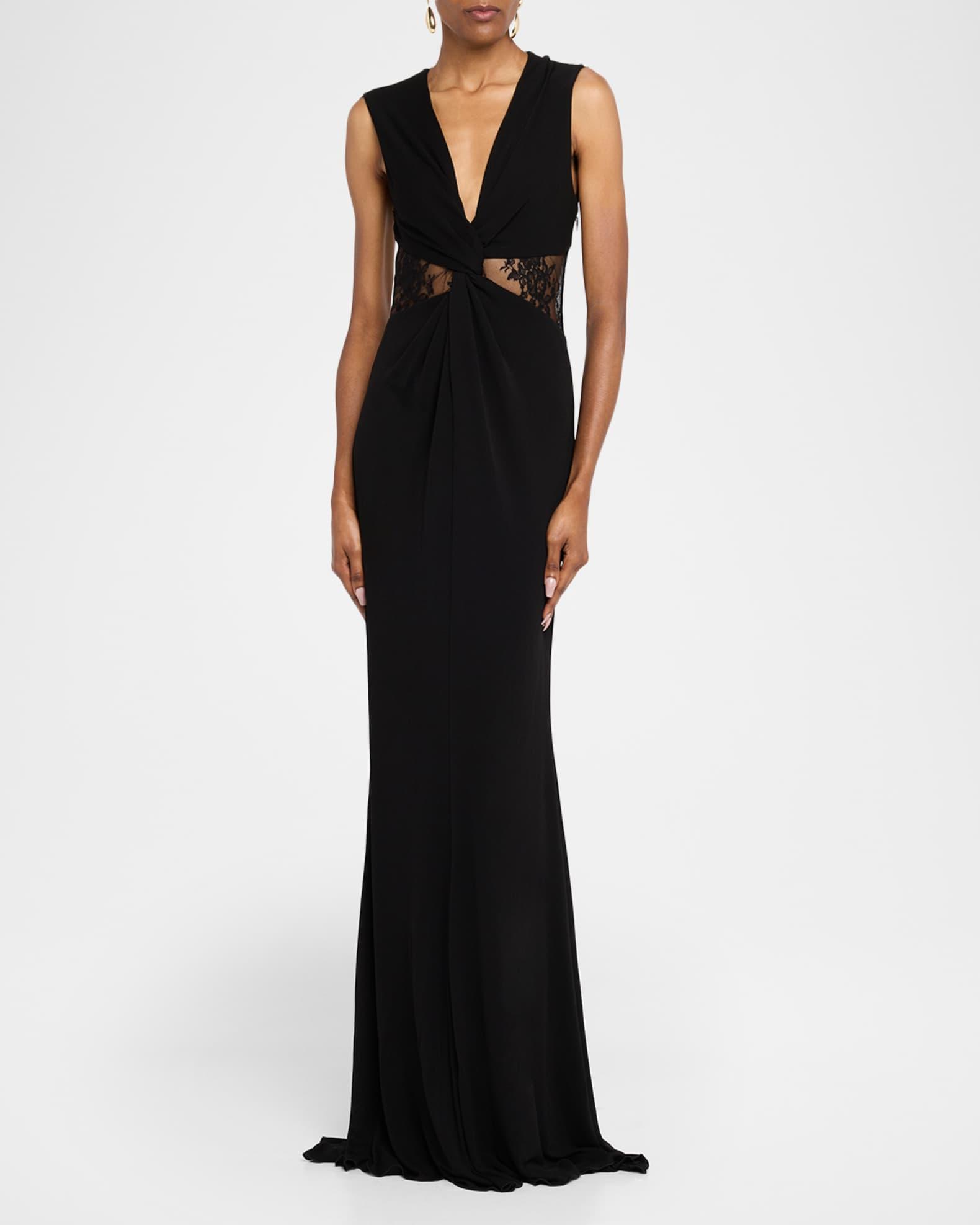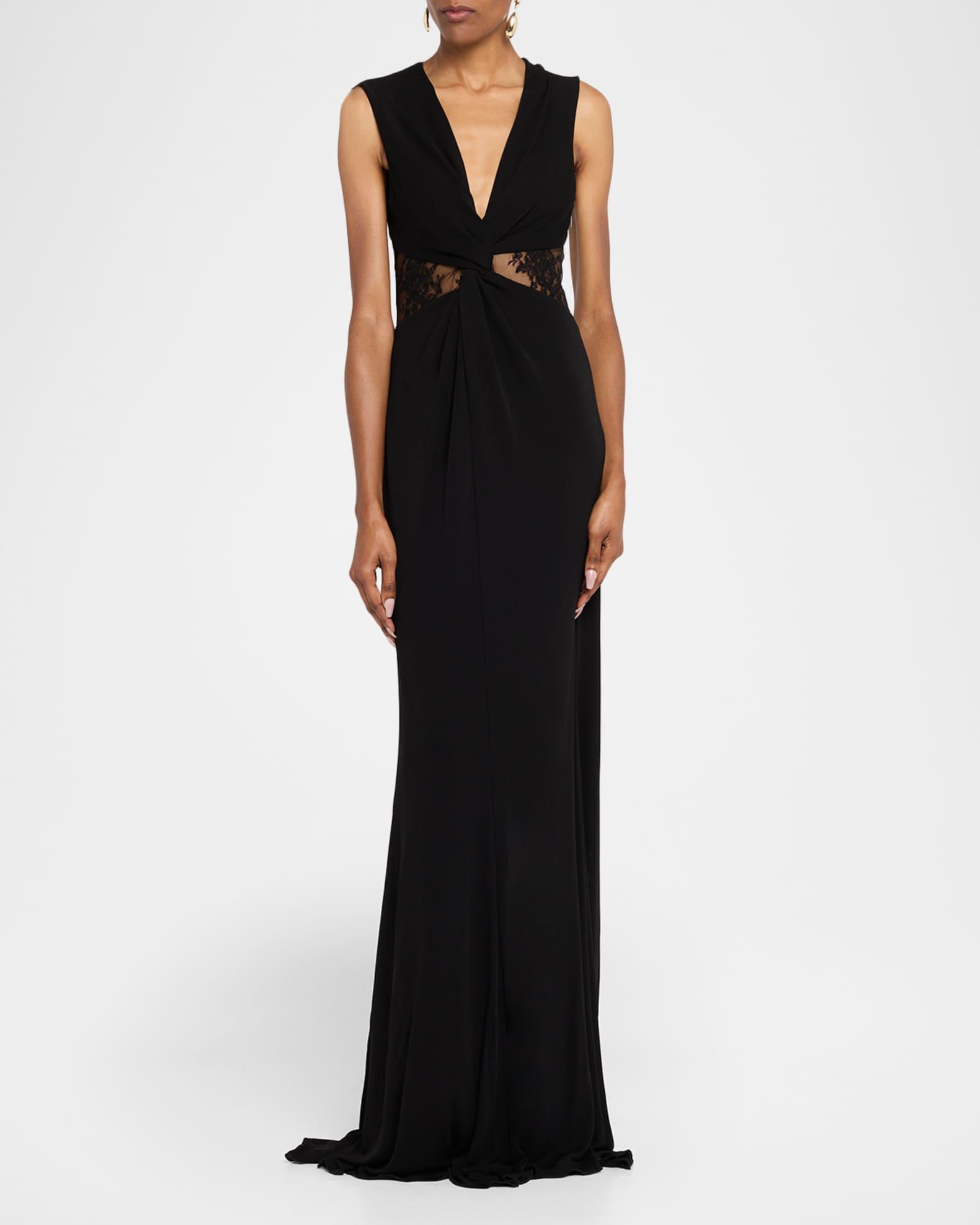 Roberto Cavalli gown featuring a twisted front, lace insets in the open back and waist cutouts Plunging neckline Sleeveless Trumpet silhouette Floor sweeping hem with a train Side zip Acetate/nylon/polyamide/cotton Lining: Nylon/viscose Made in Italy