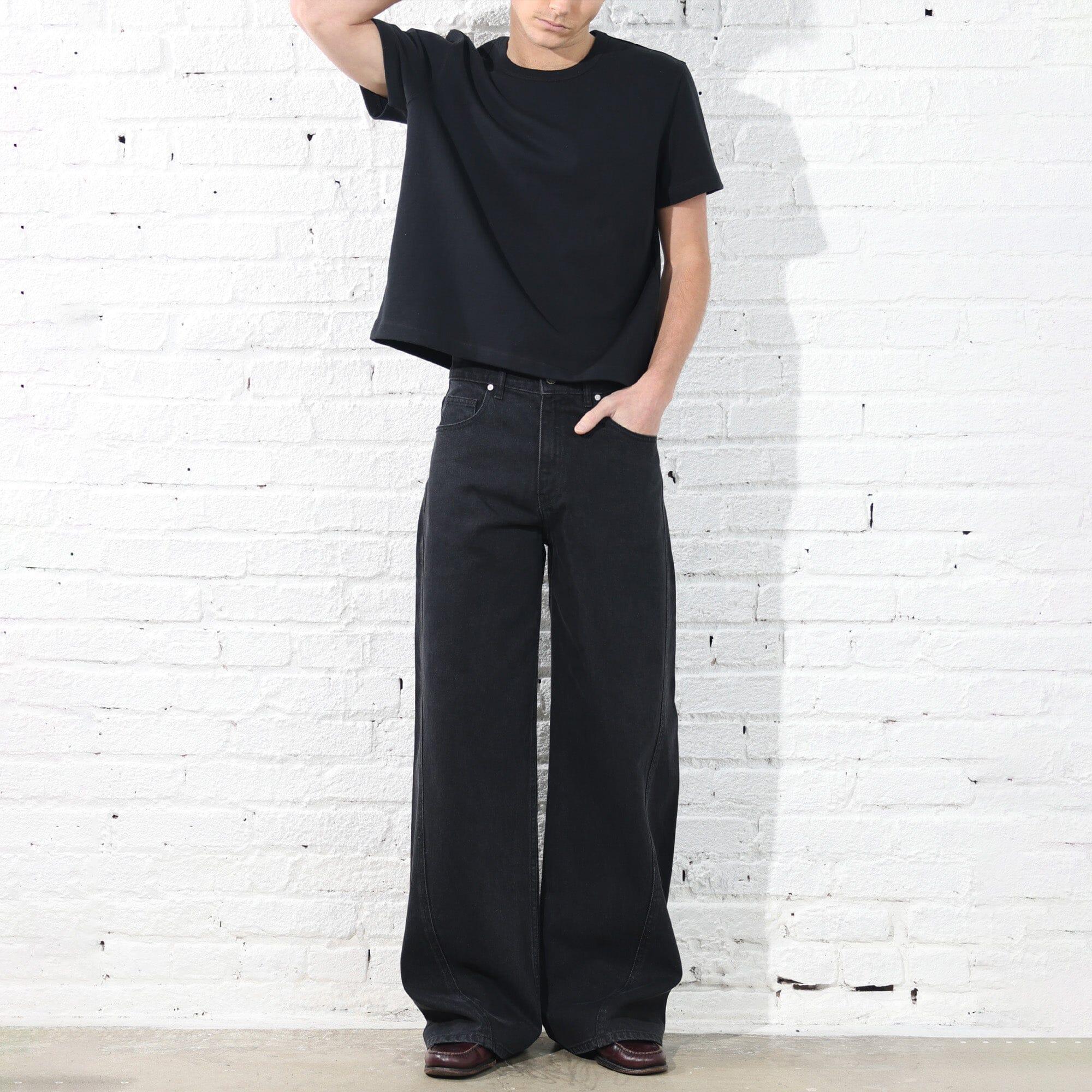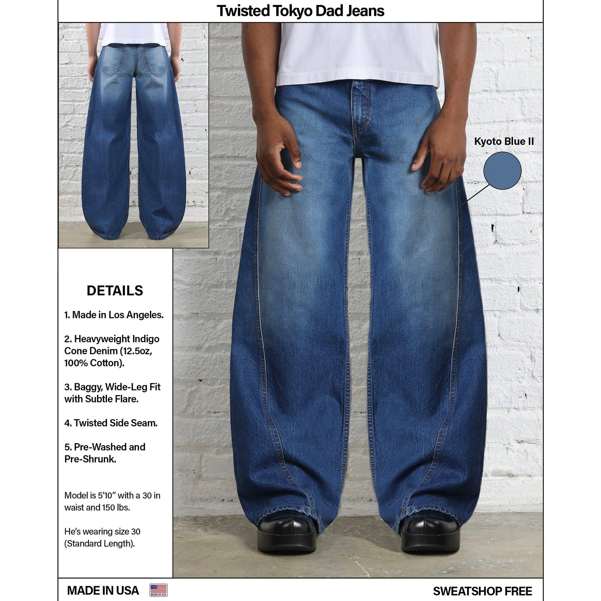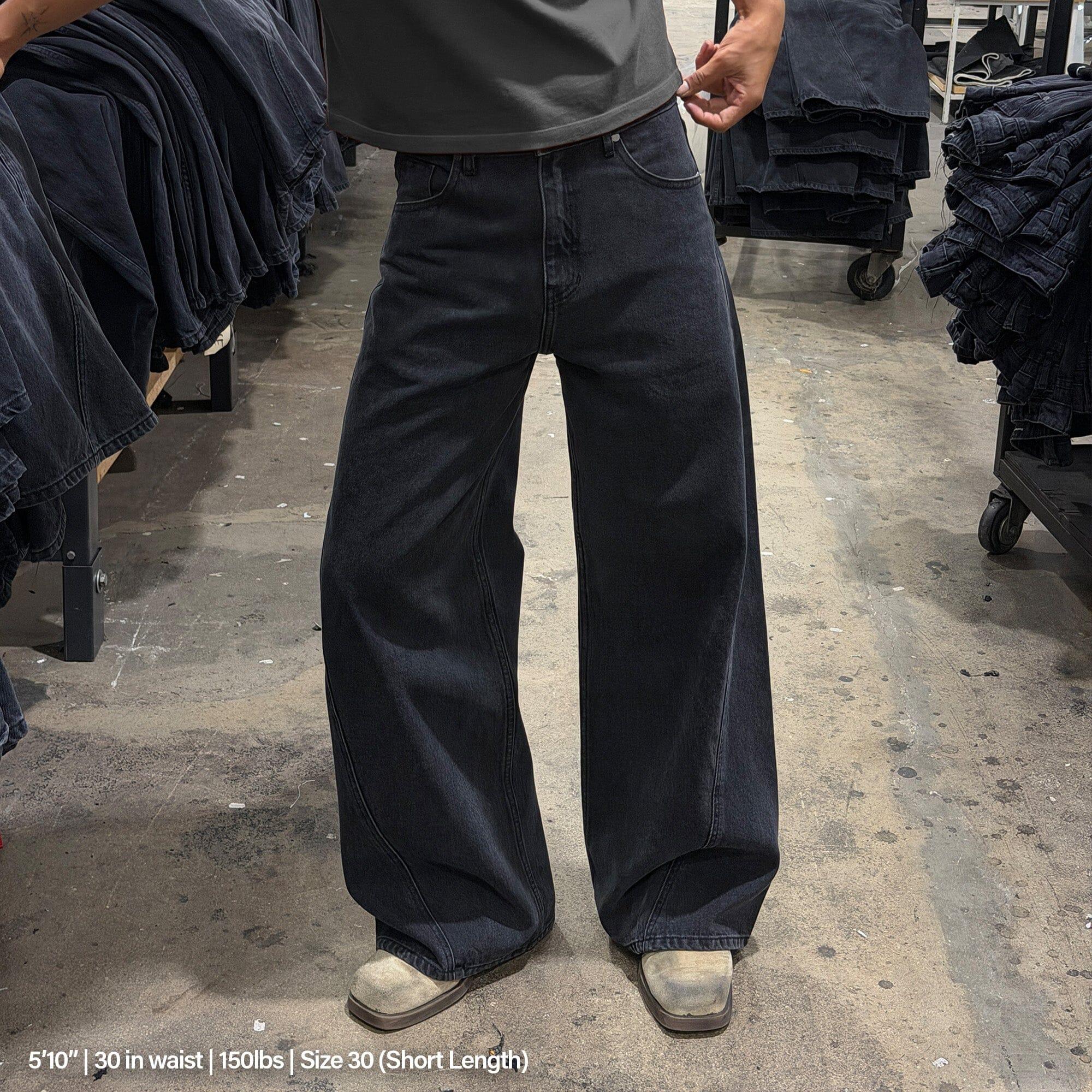 Details: Made in Los Angeles True Black Cone Denim (13 oz, 100% Cotton). Baggy, Wide-Leg Fit with a Subtle Flare. Twisted Side Seam. Available in Short (30 inch inseam), Standard (32 inch inseam), Tall (34 inch inseam) and Extra-Tall (36 in inseam) Lengths. Pre-Washed and Pre-Shrunk. _____ Made with Legendary Cone Denim ® This garment is cut from a structured 13oz True Black Cone Denim — one of the most revered mills in American denim history. It’s crisp, structured, and holds its shape like nothing else. You’ll feel the quality the second you put them on. No frills — just pure, heritage denim the way it was meant to be.