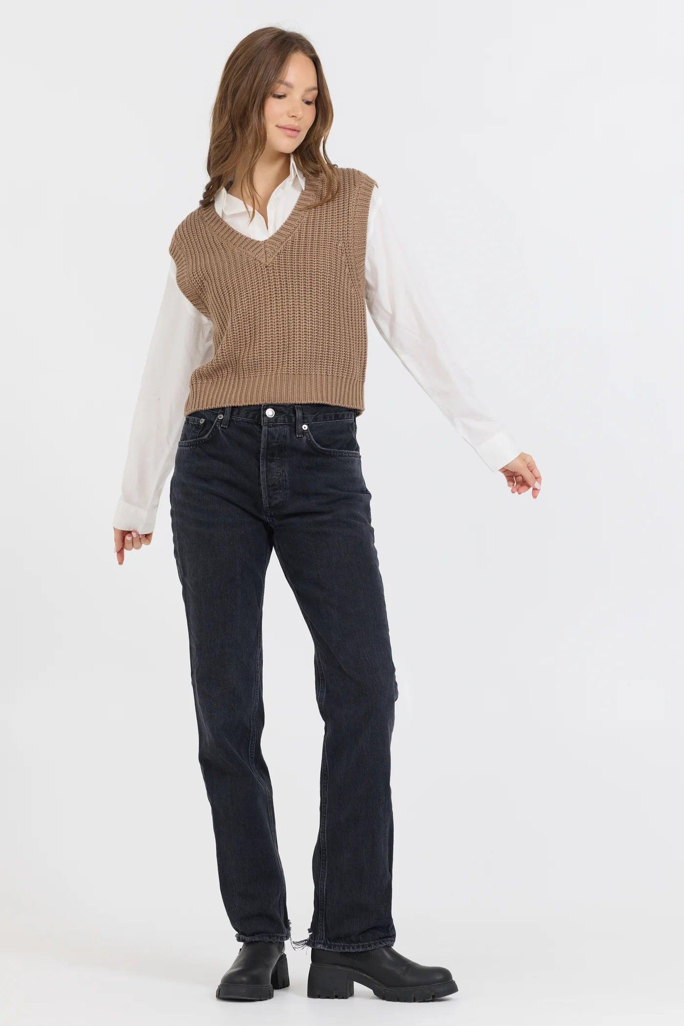 The Two Fer Cropped Sweater is a two-piece set featuring a cropped knit sweater and a cropped white collared button down. Can also be worn separately.