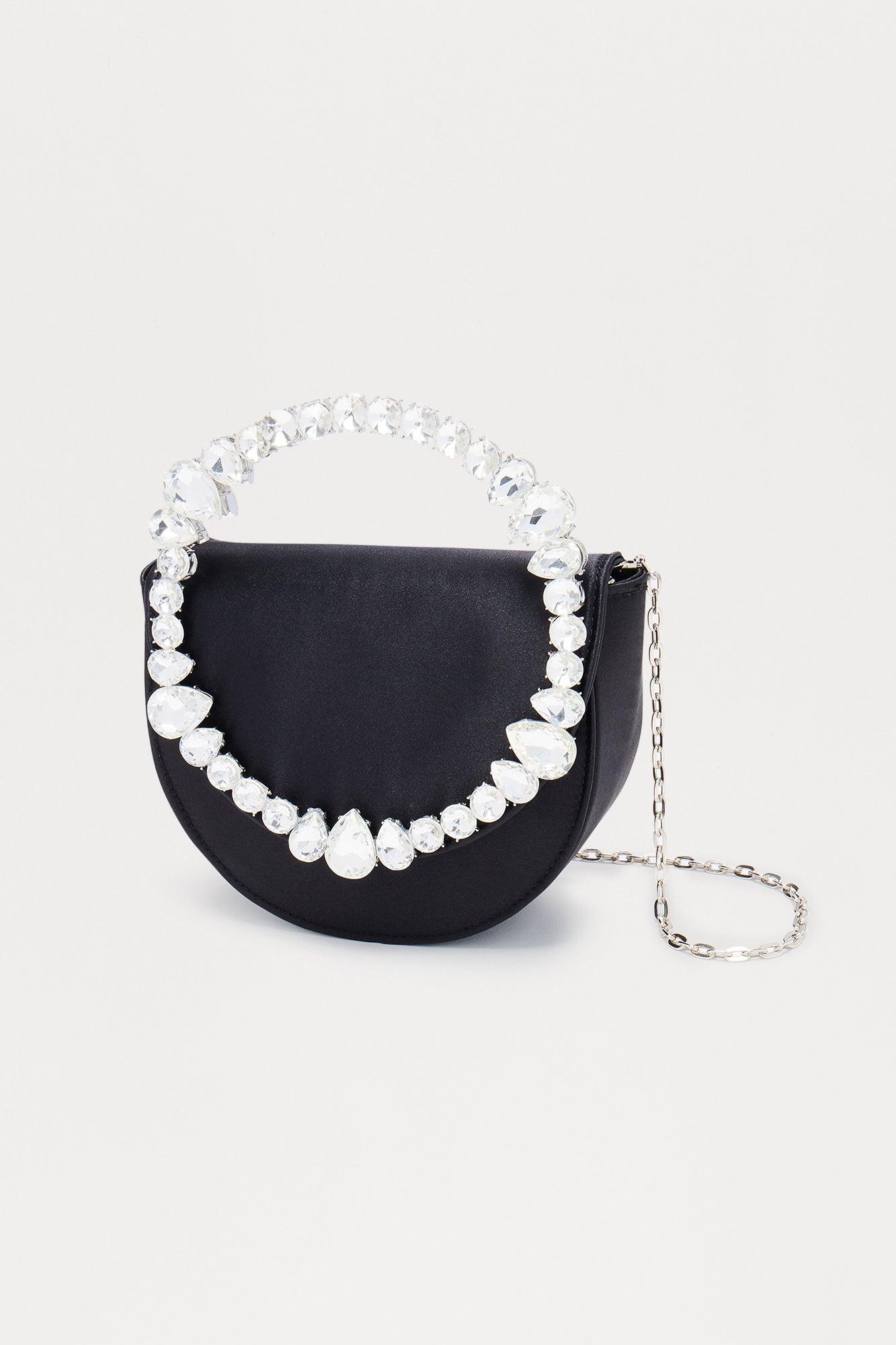 Available In Black. Clutch Satin Embellished Handle Imported California Proposition 65WARNING: Cancer and Reproductive Harm - www.P65Warnings.ca.gov.
