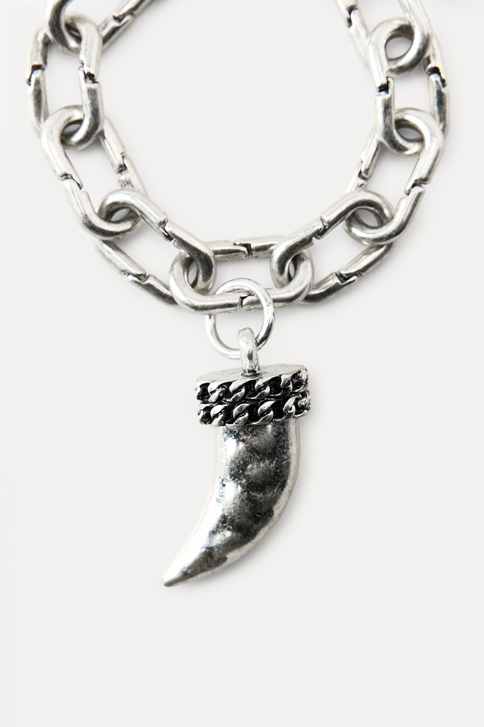 Long double metal link necklace of different lengths. Horn-shaped pendant. Lobster clasp closure.