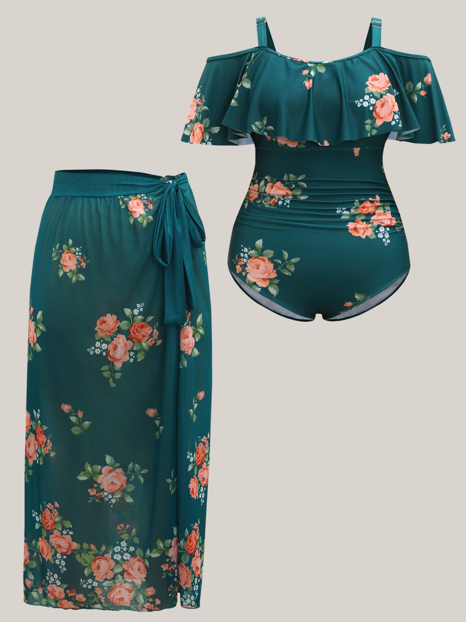 Two-Piece Floral Ruffled Knotted One-Piece, Sarong Female