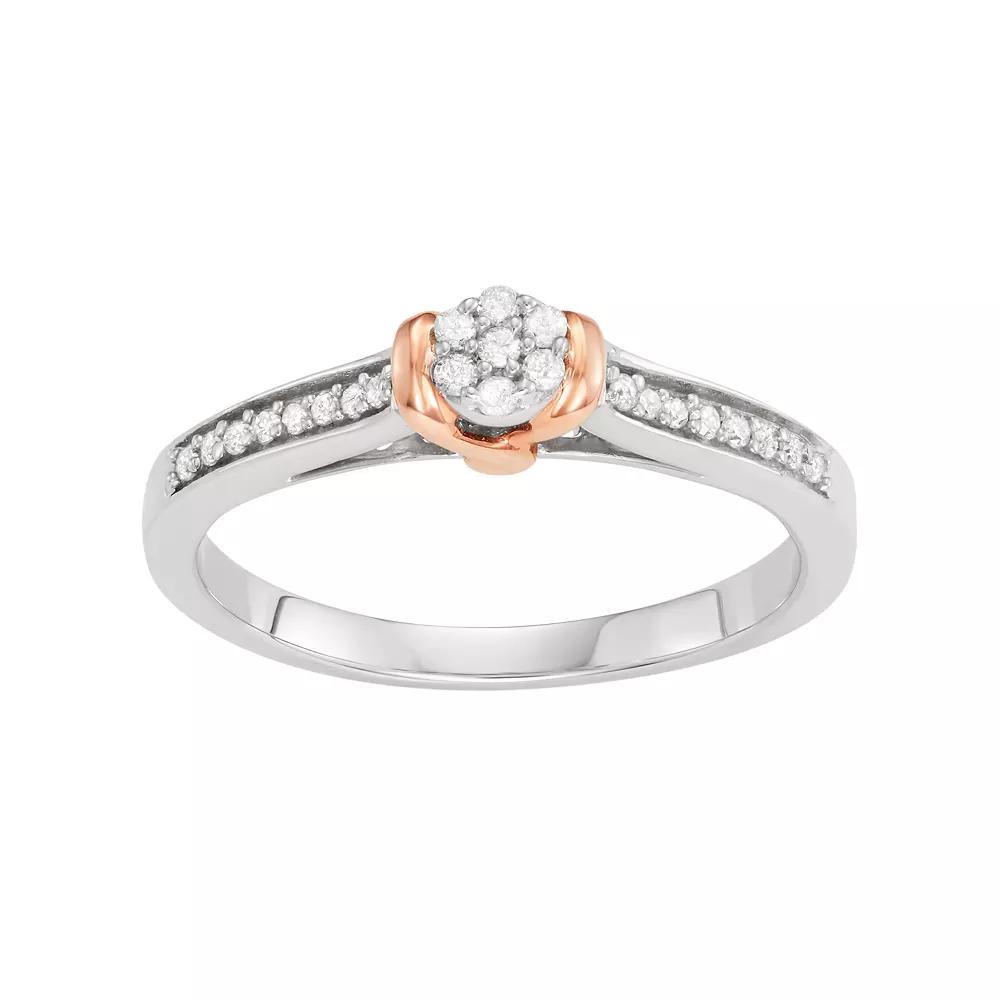 A cluster of round-cut diamonds serves as the focal point on this two-tone 10k white gold ring, while diamond accents add sparkle to the band. RING DETAILS Width: 0.1 in. Metal: 10k white gold Plating: white & pink rhodium Packaging: boxed DIAMOND DETAILS Total weight: 1/6 ct. Shape: round Color grade: I-J Clarity: I1-I2 Setting: prong Gemstones may have been treated to enhance their appearance. Special care may be required. Please visit our Gemstone Treatment & Special Care Guide for more information. Image(s) may be enlarged to show detail.Diamond weights are approximate. Diamond total weights may vary between .01 and .08 ct. Some diamonds have fewer than 17 facets. Size: 5. Gender: female. Age Group: adult.