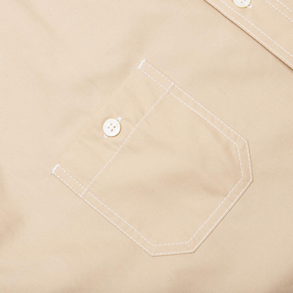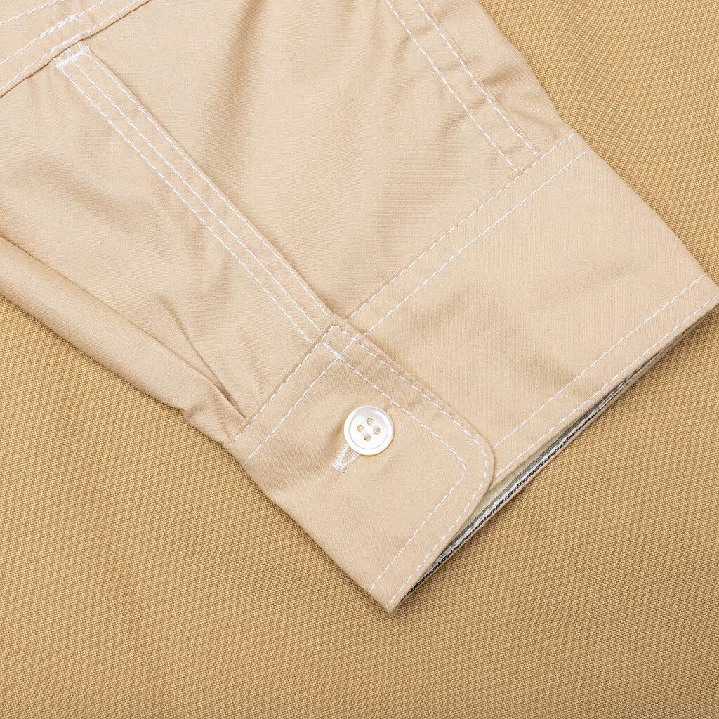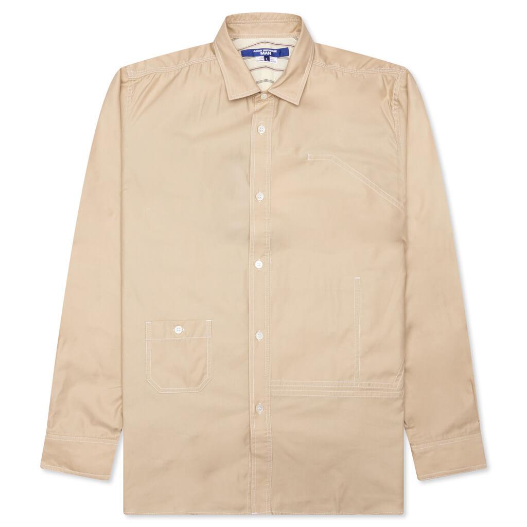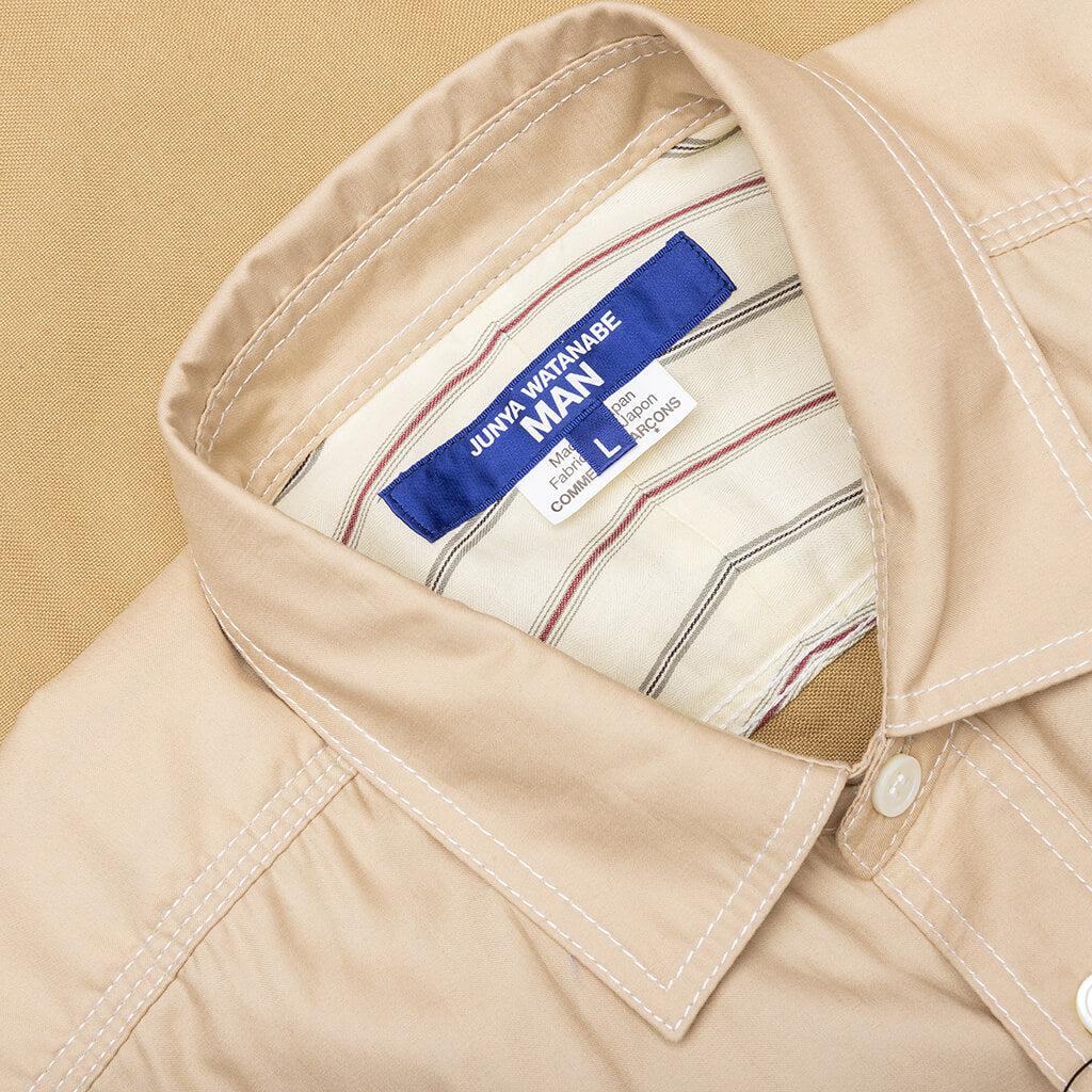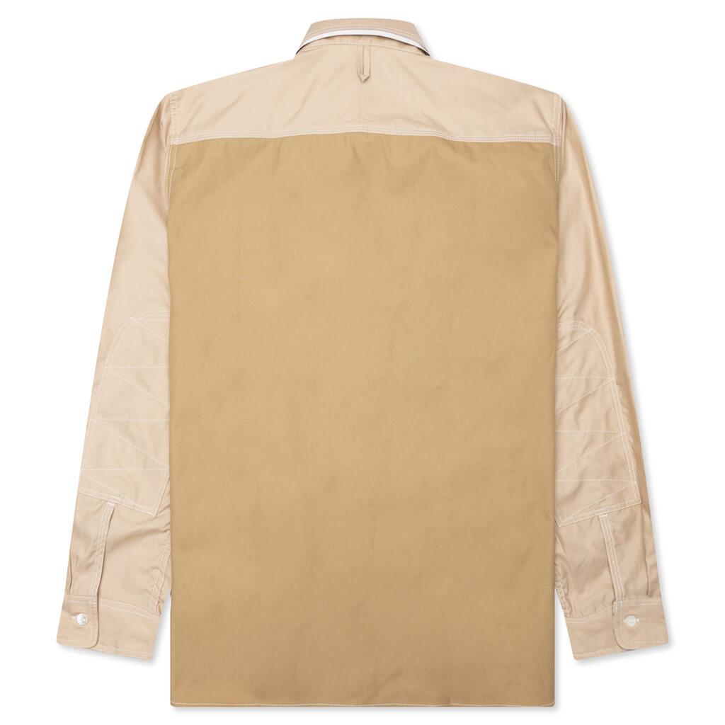 The Junya Watanabe MAN Two Tone Button Up Shirt in Beige showcases a thoughtful design with contrasting panels and fabrics. The front of the shirt features a beige textile fabric, while the back is adorned with a darker beige tone. Completing the look are two elbow patches, adding a refined touch to this dress shirt. Two-tone design with contrasting fabrics Elbow patches Button-up front Style No: WM-B017-051-1