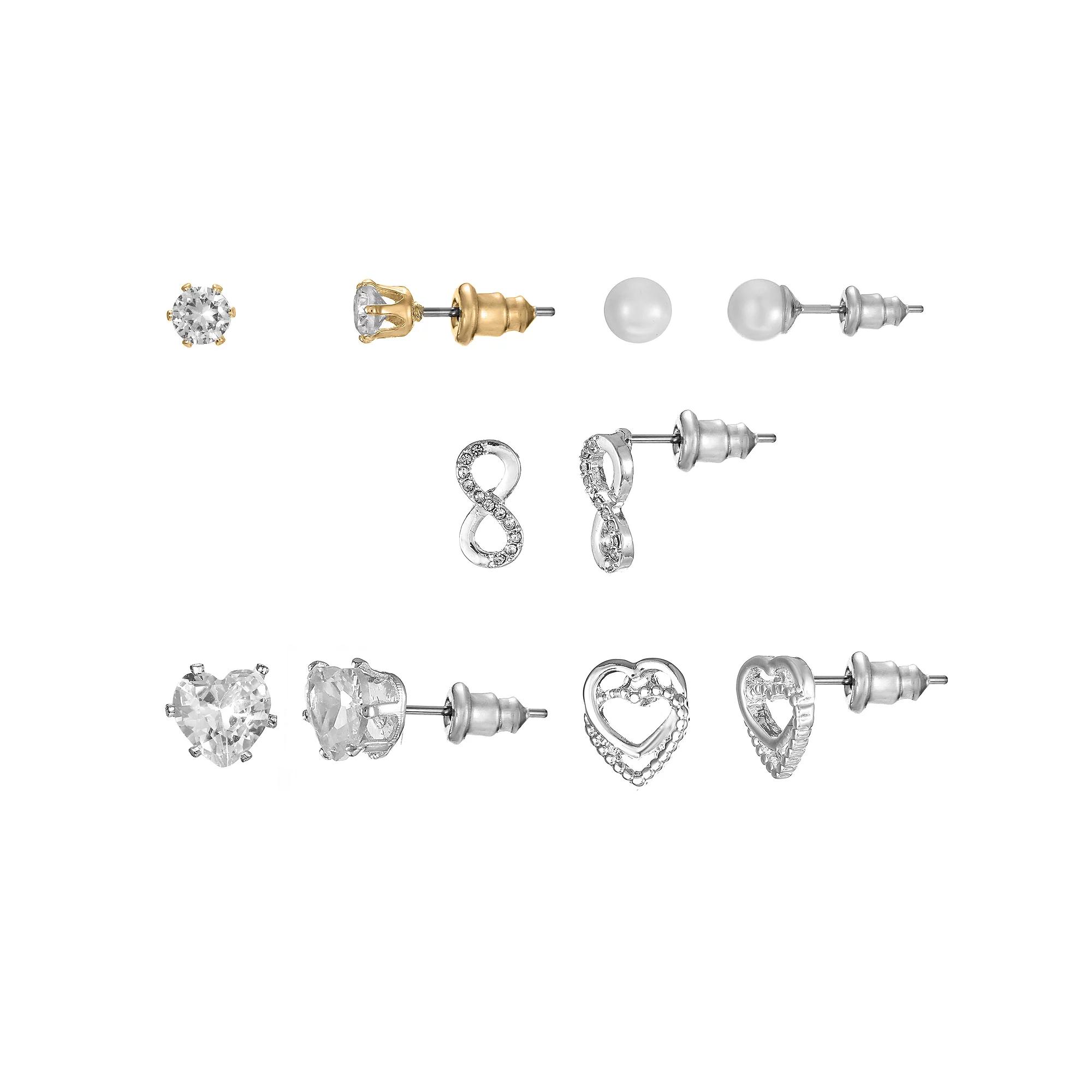 Spruce up your jewelry box with this lovely quintet of two-tone cubic zirconia and simulated pearl stud earrings. Click on this JEWELRY & WATCHES GUIDE to learn about fit, styles, materials and more! Spruce up your jewelry box with this lovely quintet of two-tone cubic zirconia and simulated pearl stud earrings. Click on this JEWELRY & WATCHES GUIDE to learn about fit, styles, materials and more! FEATURES Includes 5 pairs of earrings Length/diameter: 4.2 mm, 5.2 mm, 5.9 mm, 6.7 mm, 12.3 mm Backings: post Nickel free Metal: brass Plating: silver tone, gold tone Finish: polished Packaging: boxed ImportedSTONE DETAILS Stone type: cubic zirconia Total weight: 4 1/2 ct. Shape: heart, round Setting: prong Gemstones may have been treated to enhance their appearance. Special care may be required. Please visit our Gemstone Treatment & Special Care Guide for more information. Size: One Size. Color: Silver Tone Clear. Gender: female. Age Group: adult.