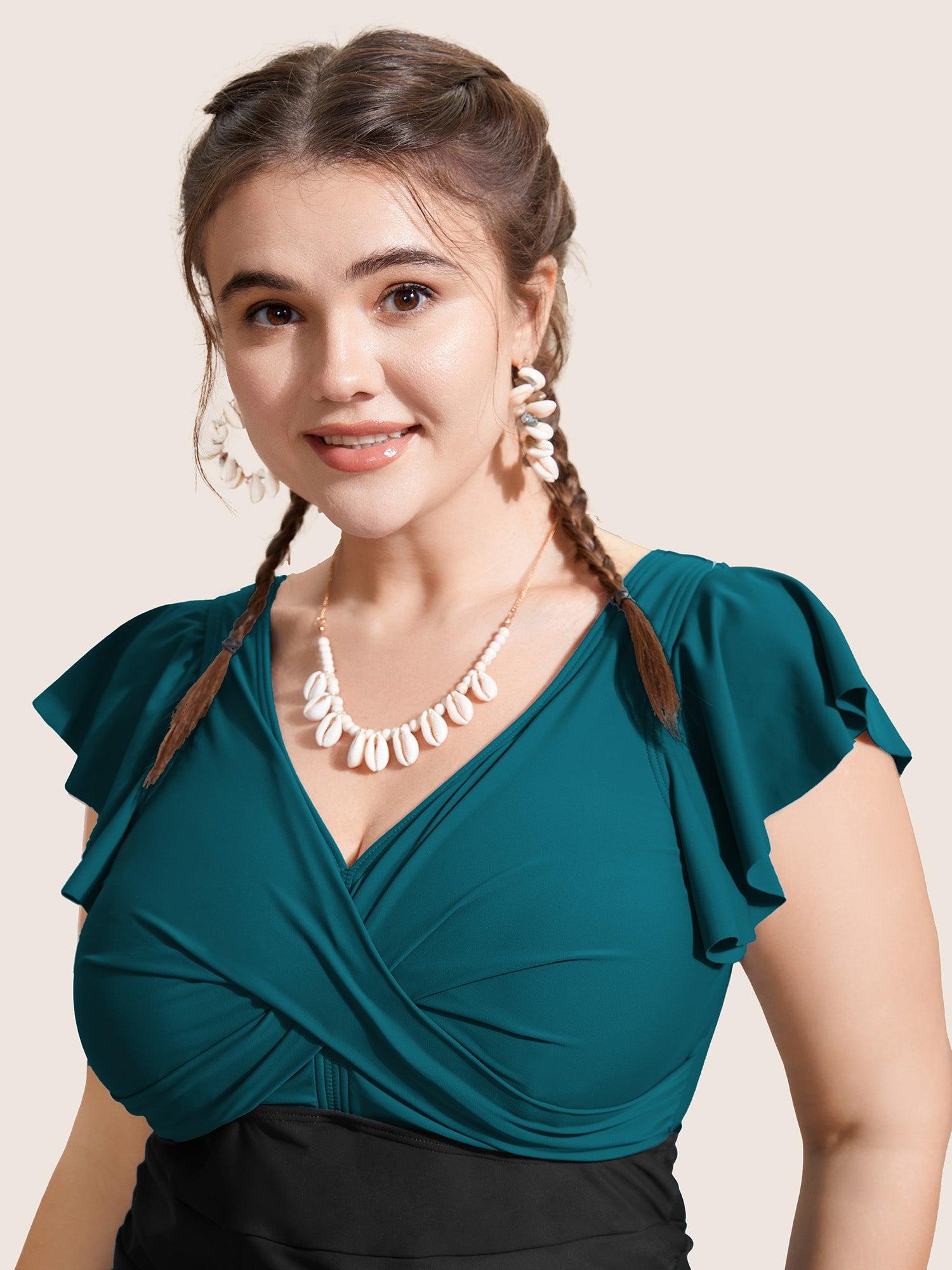 Shop Two Tone Gathered Ruffle Sleeve One Piece Swimsuit now and redefine your style with confidence at BloomChic. Tailored for mid and plus-size women. This trendy Swimwear Women, sizes 10-30. Color:Indigo,Cyan;Style:Beach Vacation;Cup Type:Removable cups;Neckline:V-neck;Sleeve Type:Ruffle Sleeve;Prints:Geometric & color block;Details:Twist, Ruffles, Contrast, Gathered;Pocket:No-pocket;Belt:No-belt;Chest pad:Removable Padding;Lining:Lining;Closure Type:Non