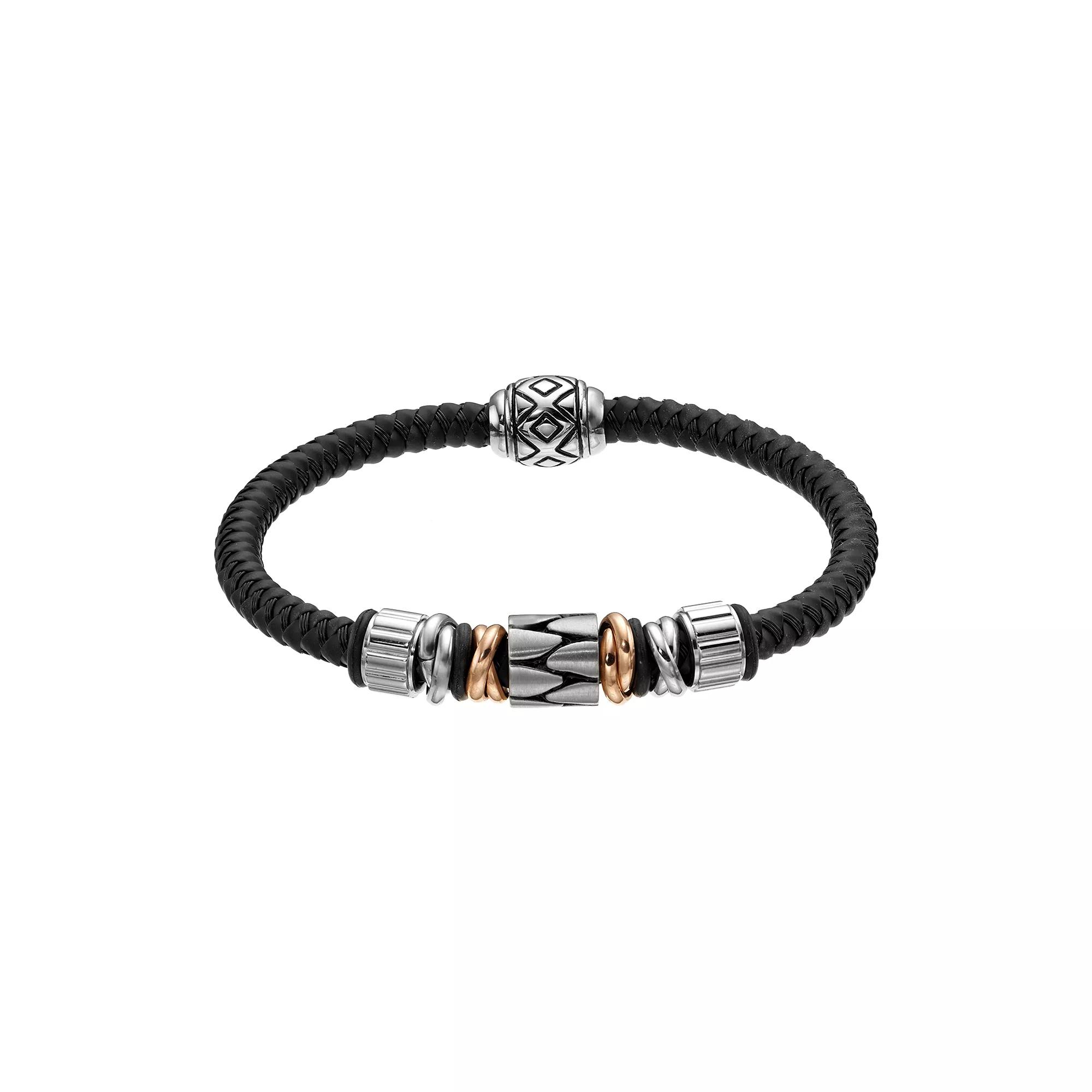 Textured beads and a leather band give this men's stainless steel bracelet edgy style you're sure to love.BRACELET DETAILS Length: 8.25 in. Closure: magnetic Metal: stainless steel, rose gold-tone stainless steel Size: 8.5". Color: Black. Gender: male. Age Group: adult.