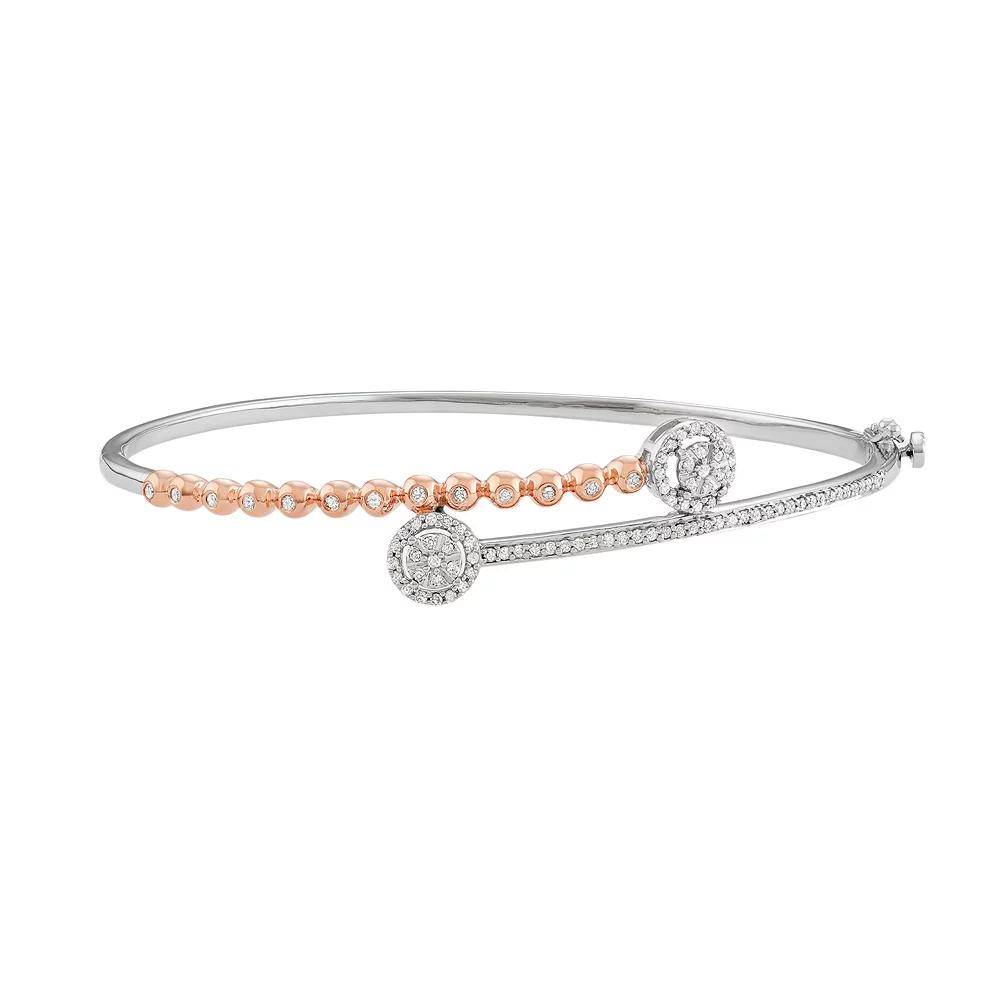 Adorned with illuminating round-cut diamonds and an eye-catching bypass design, this two-tone bangle bracelet is sure to garner compliments.BRACELET DETAILS Length: 7.25 in. Clasp: box Metal: sterling silver Plating: rhodium, 14k rose gold Finish: polished Packaging: boxed DIAMOND DETAILS Total weight: 1/2 ct. Shape: round Color grade: H-I Clarity: I1-I2 Setting: prong, bezel Gemstones may have been treated to enhance their appearance. Special care may be required. Please visit our Gemstone Treatment & Special Care Guide for more information.Image(s) may be enlarged to show detail.Diamond weights are approximate. Diamond total weights may vary between .01 and .08 ct. Some diamonds have fewer than 17 facets. Size: One Size. Color: White. Gender: female. Age Group: adult.