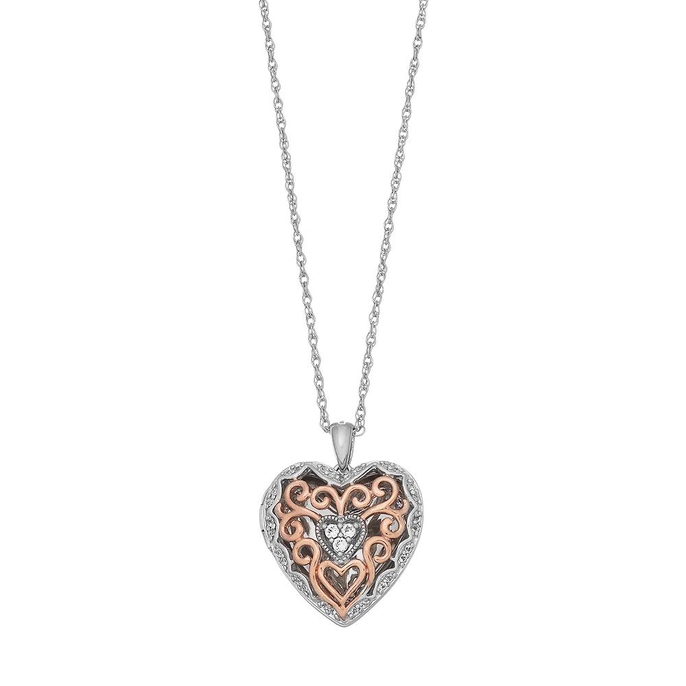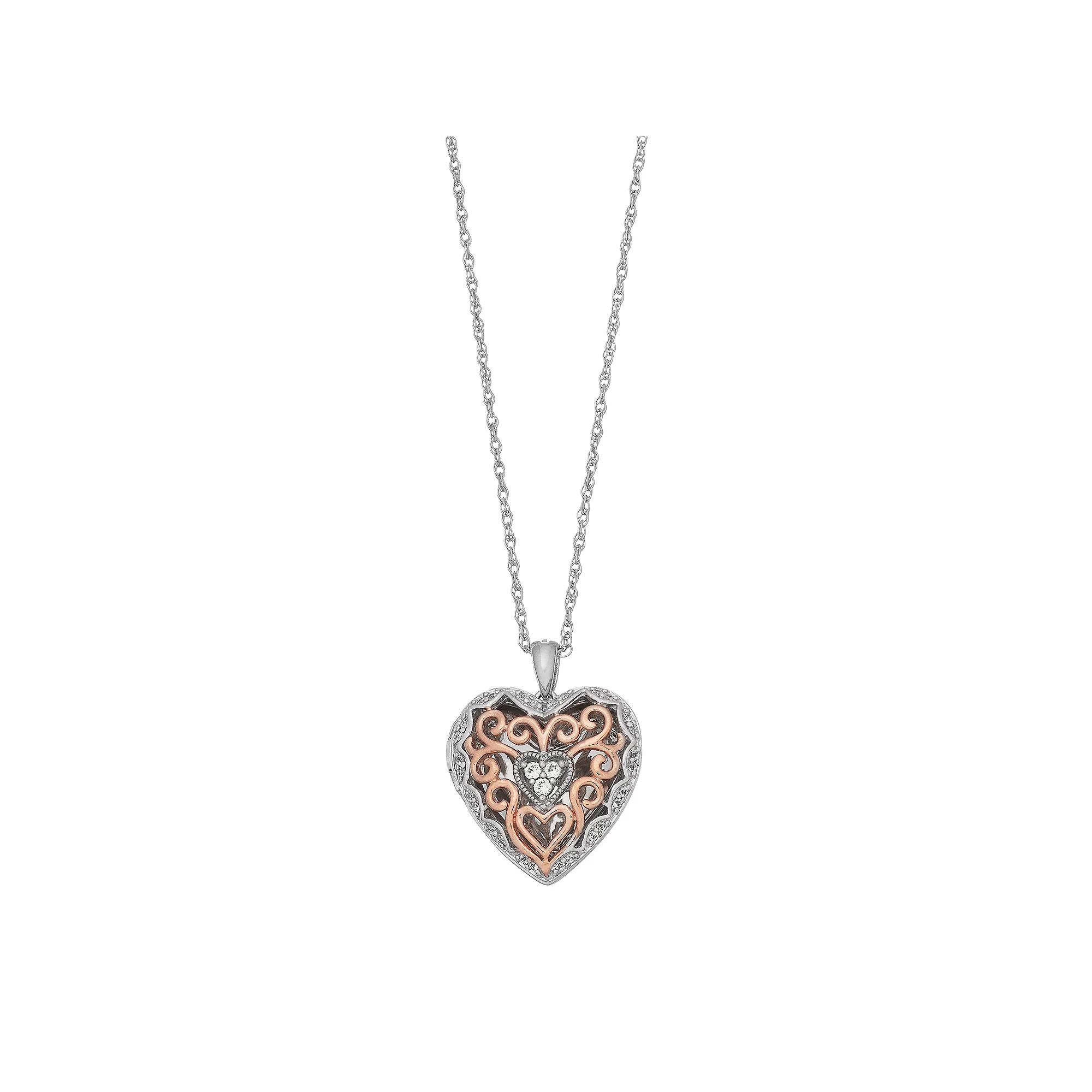 Embellished with filigree details and lab-created white sapphire accents, this two-tone sterling silver heart locket is sure to enamor. LOCKET DETAILSLocket size: 0.91L x0.71WChain length: 18 in.Chain type: ropeClasp: spring-ring clasp Metal: sterling silverPlating: 14k rose goldFinish: polishedPackaging: boxedSTONE DETAILSStone type: lab-created white sapphireTotal weight: 1/5 ct.Shape: roundSetting: prongGemstones may have been treated to enhance their appearance. Special care may be required. Size: 18. Gender: female. Age Group: adult.