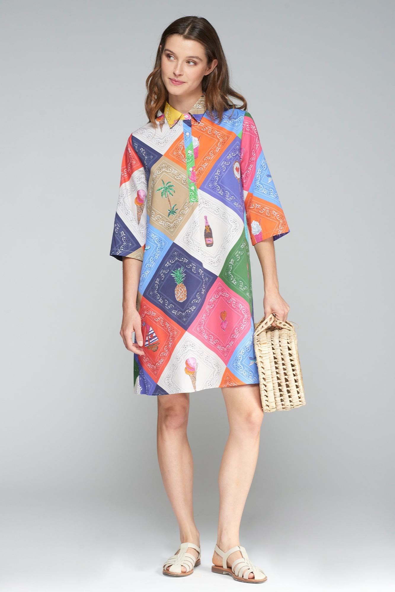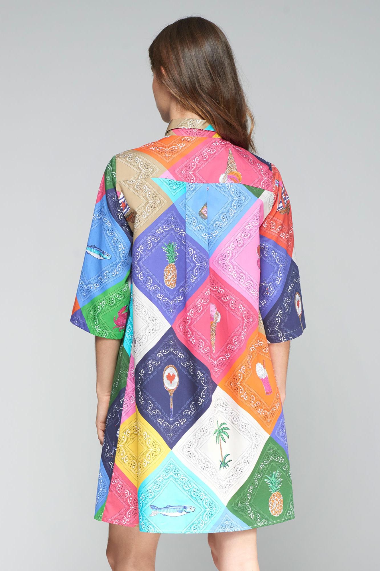 Short dress with multicolored bandanas print. Three-quarter sleeve. Shirt collar. Buttoning with white shirt buttons. 100%COTTON