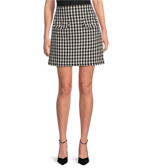 From tyler boe, this skirt features: Woven fabrication Check print High rise Front fringe pockets Pairs back to Tommy jacket Lined Back zip closure Approx. 18.5" length Polyester Machine wash Imported.