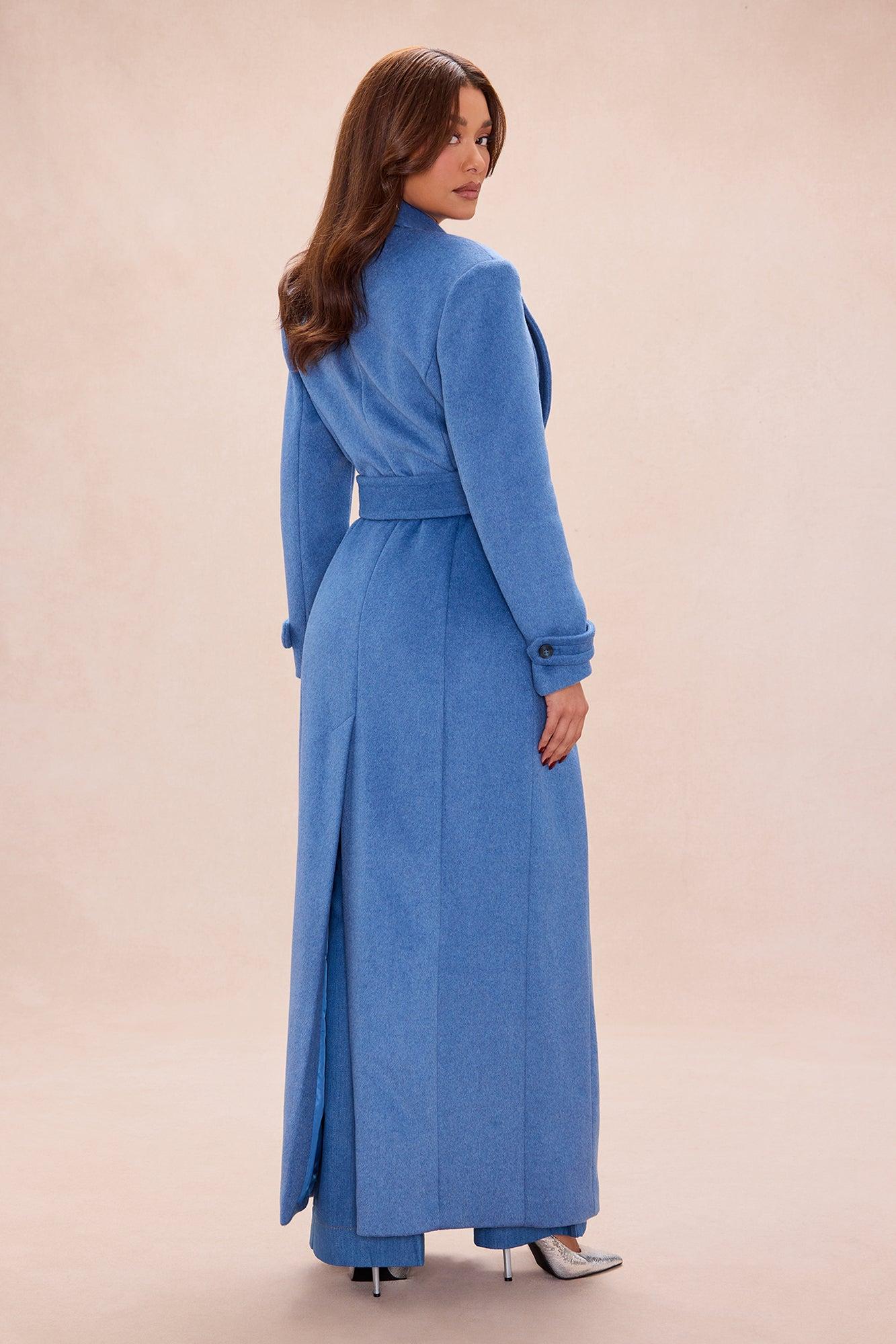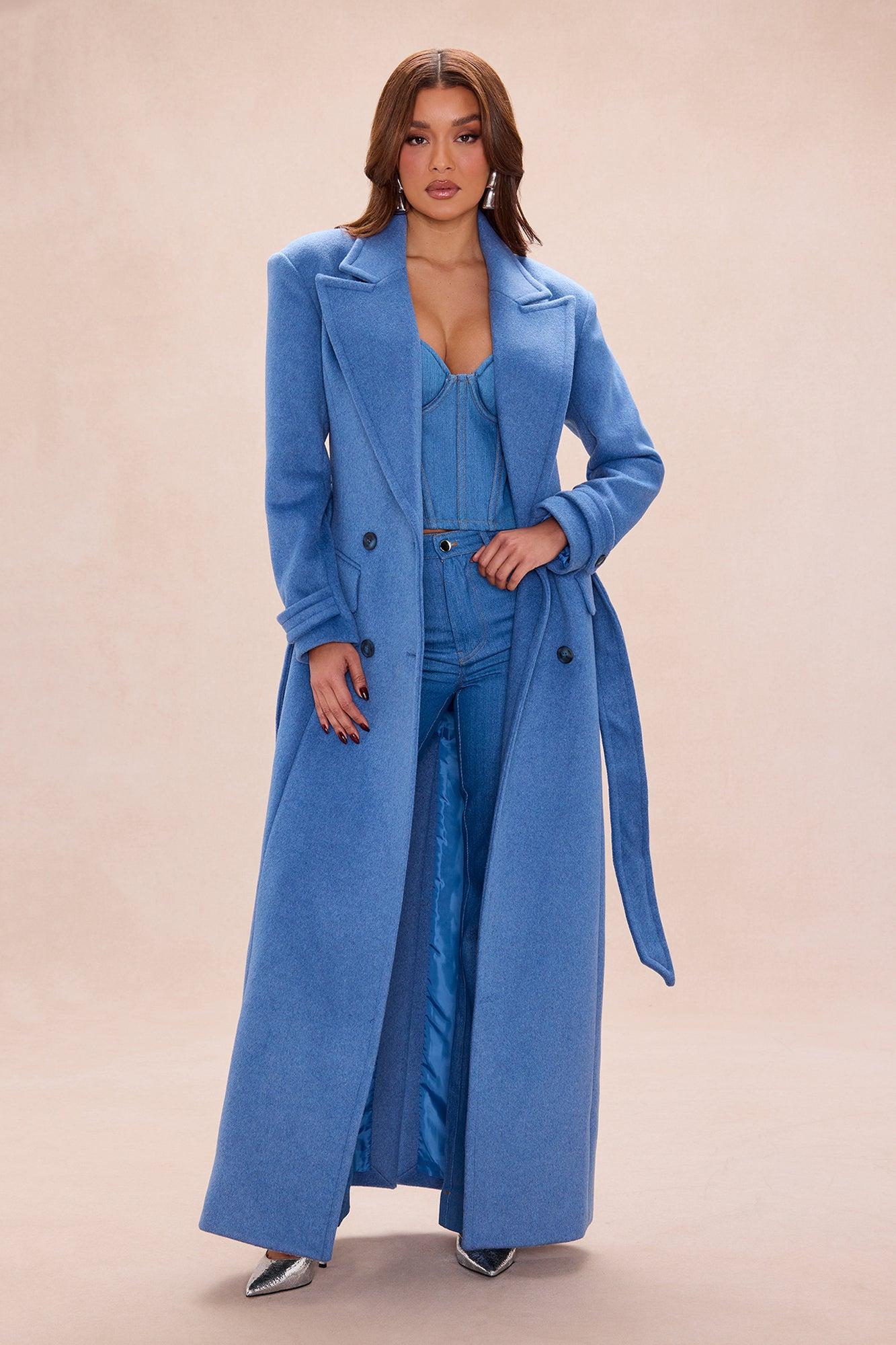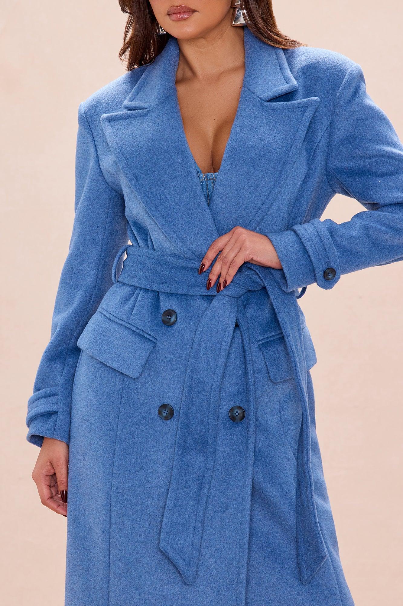 Available In Brown And Denim. Wool Blend Coat Long Sleeve Shoulder Pads Collared Tie Waist Belt Faux Pockets Double Breasted Front Button Closure Back Slit Lined Non Stretch Shell: 60% Polyester 30% Wool 10% Other Lining: 100% Polyester California Proposition 65WARNING: Cancer and Reproductive Harm - www.P65Warnings.ca.gov.