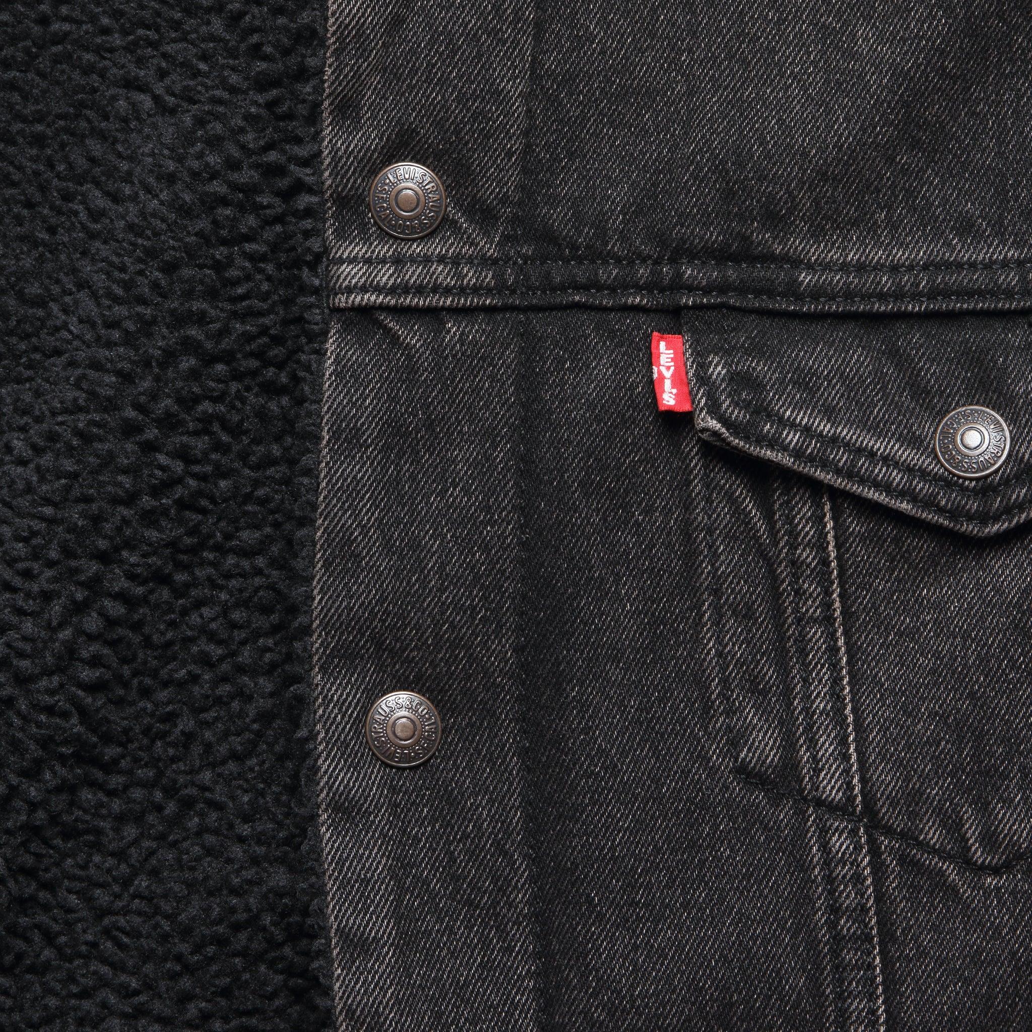 Inspired by from their iconic 1967 Type III trucker jacket, the updated details on this sherpa-lined trucker make it a cozier counterpart to the original. The classic sherpa lining and collar, paired with hardwearing, non-stretch cotton denim give it a vintage-inspired look that’s winter-ready. Type III Trucker design Non-stretch cotton denim Vintage black wash Sherpa lining and collar Two side welt pockets & two flap chest pockets with snaps Snap front placket and cuff closures Relaxed fit that runs true to size We recommend taking your normal size Materials: Body: 100% cotton | Sherpa lining and collar: 100% polyester | Sleeve lining: 100% polyamide The following measurements are for size Medium: Chest: 45” | Shoulder: 18” | Sleeve: 33 ½” | Length: 26”