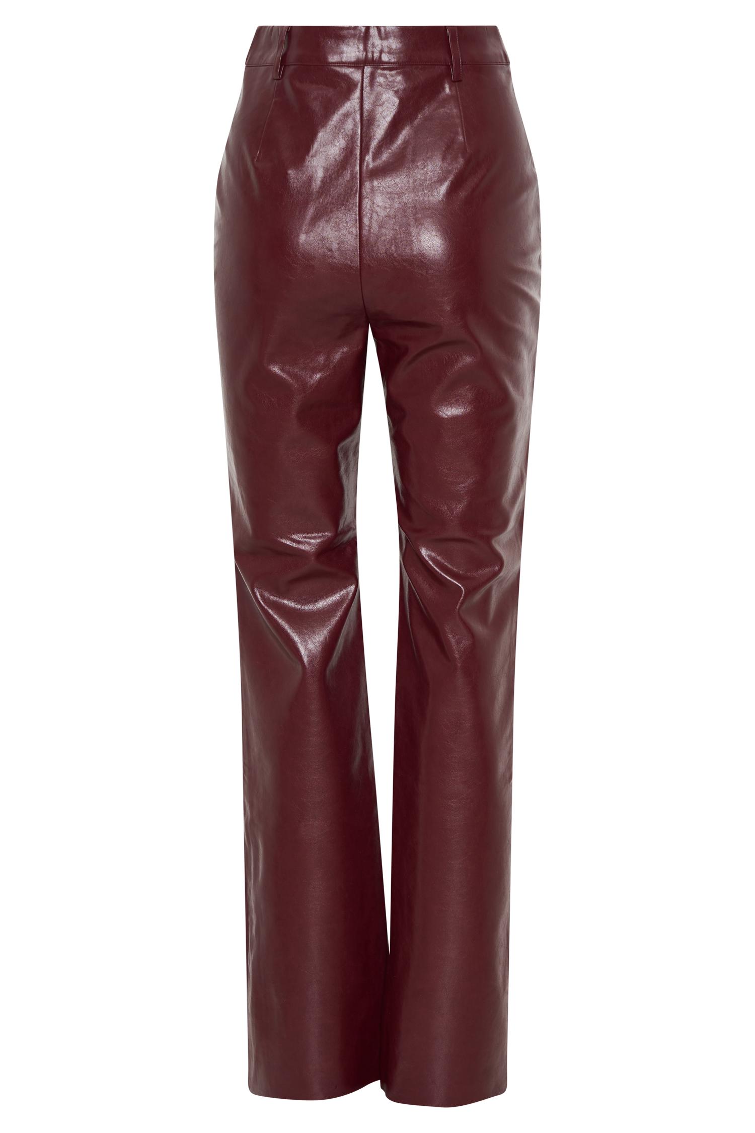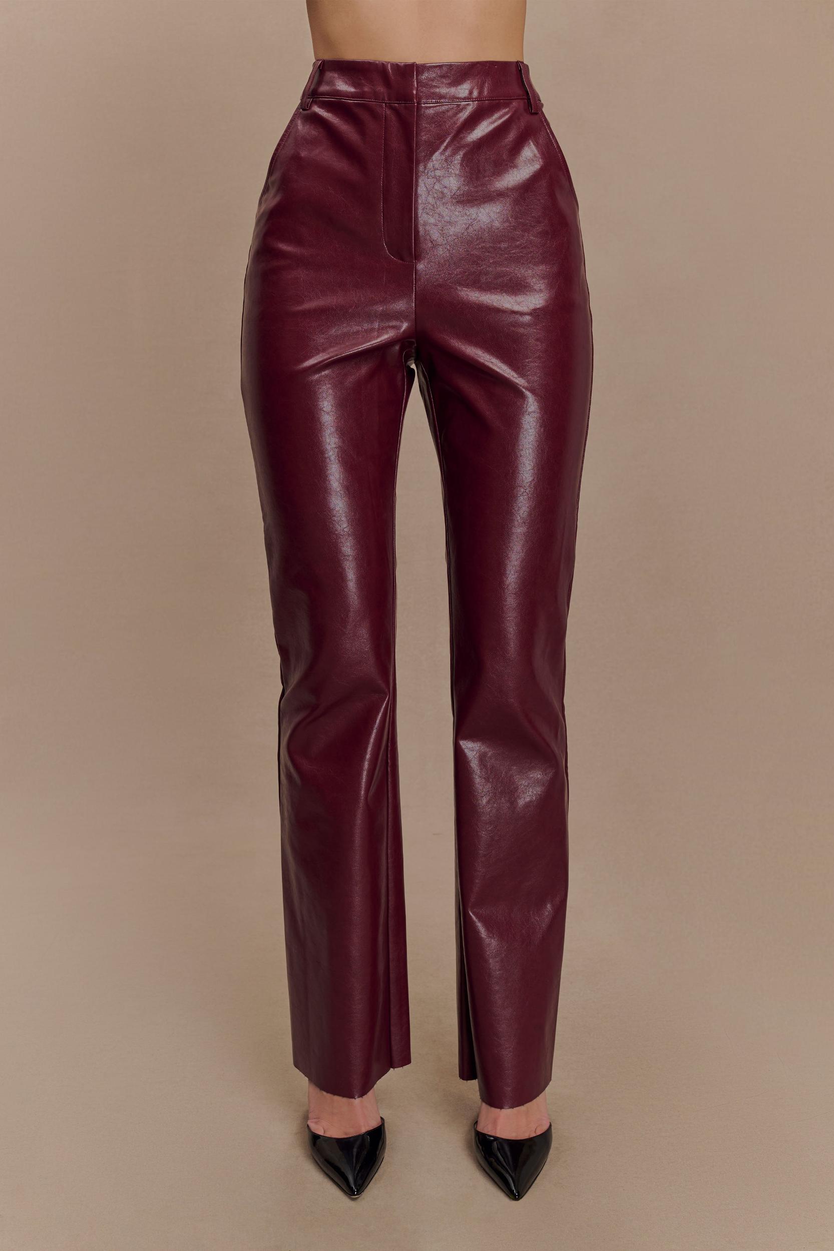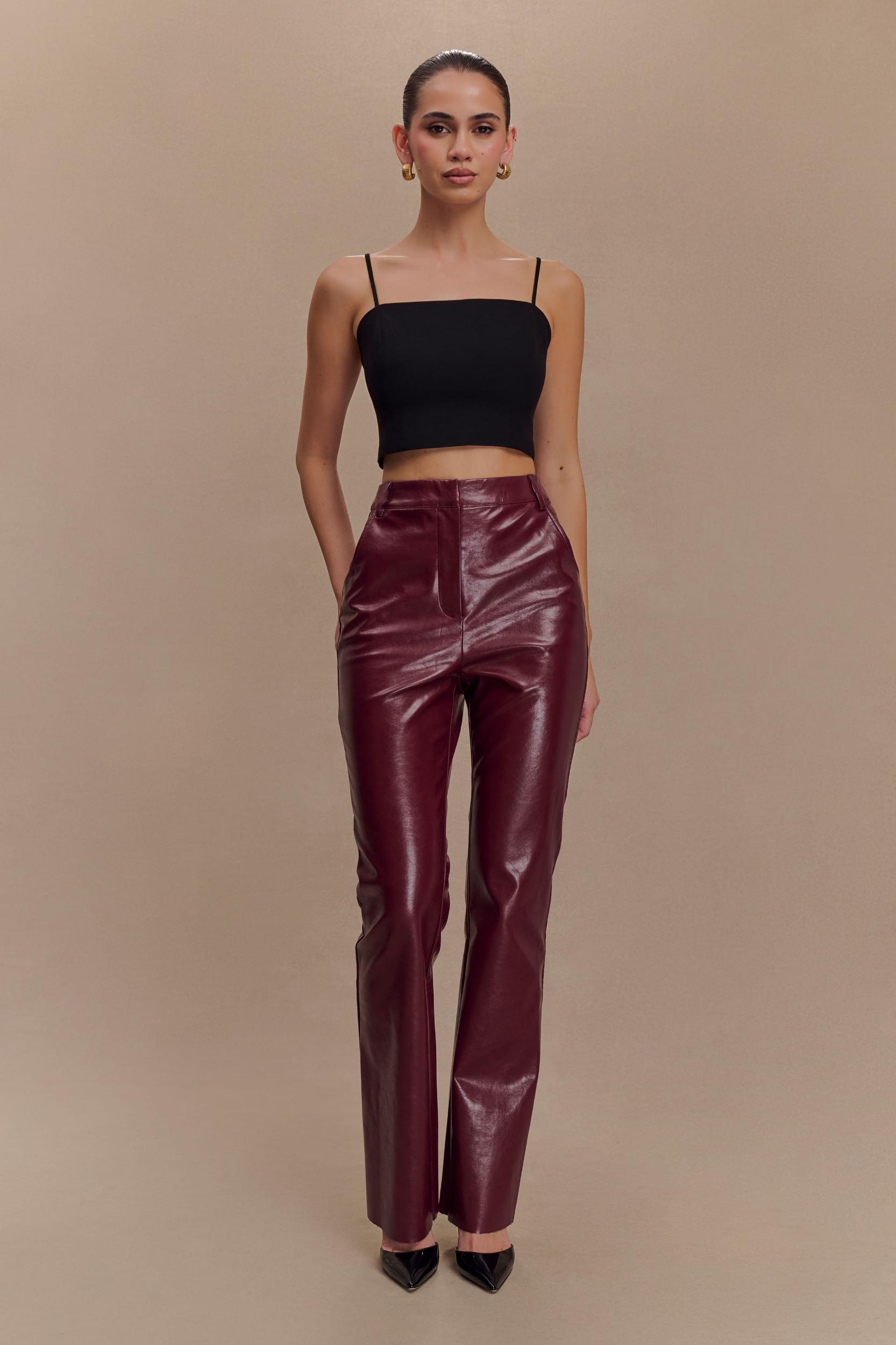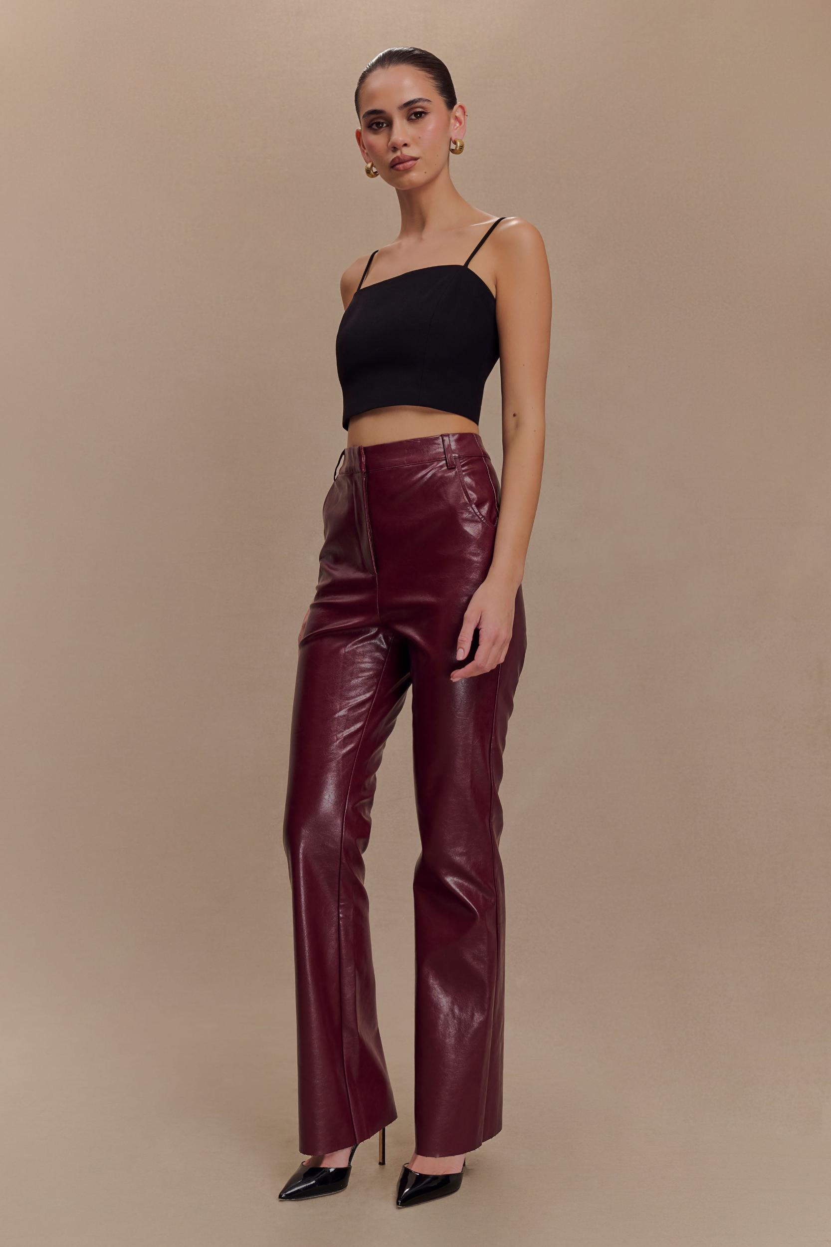 Our TYRA pants are here for making moves and stealing hearts. These pants are crafted from a soft PU leather fabric and feature a tailored high waist and straight leg fit that will flatter your legs. Finished with a lapped zipper and a hidden button at the waist, these pants snatch you in and hug your hips. Finally, the raw hem adds that edgy detail that will update your whole look. These pants are essential for your closet for creating effortless looks from day to night. Please note - these will stretch with first wear.