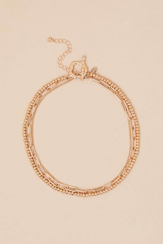Every jewelry box needs an effortless layered look like this shiny gold-toned necklace that features three different designs. A strand of shiny gold beads, followed by a paper clip chain, creates a chunky silhouette for a trendy touch, while a final sleek chain link draws the eye in. A hammered-like toggle clasp creates an eye-catching focal point to the must-have design.