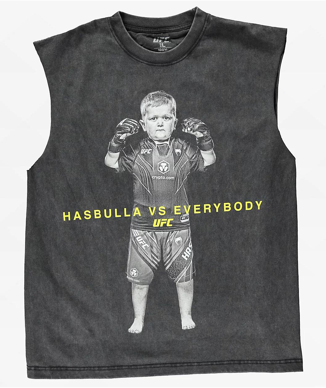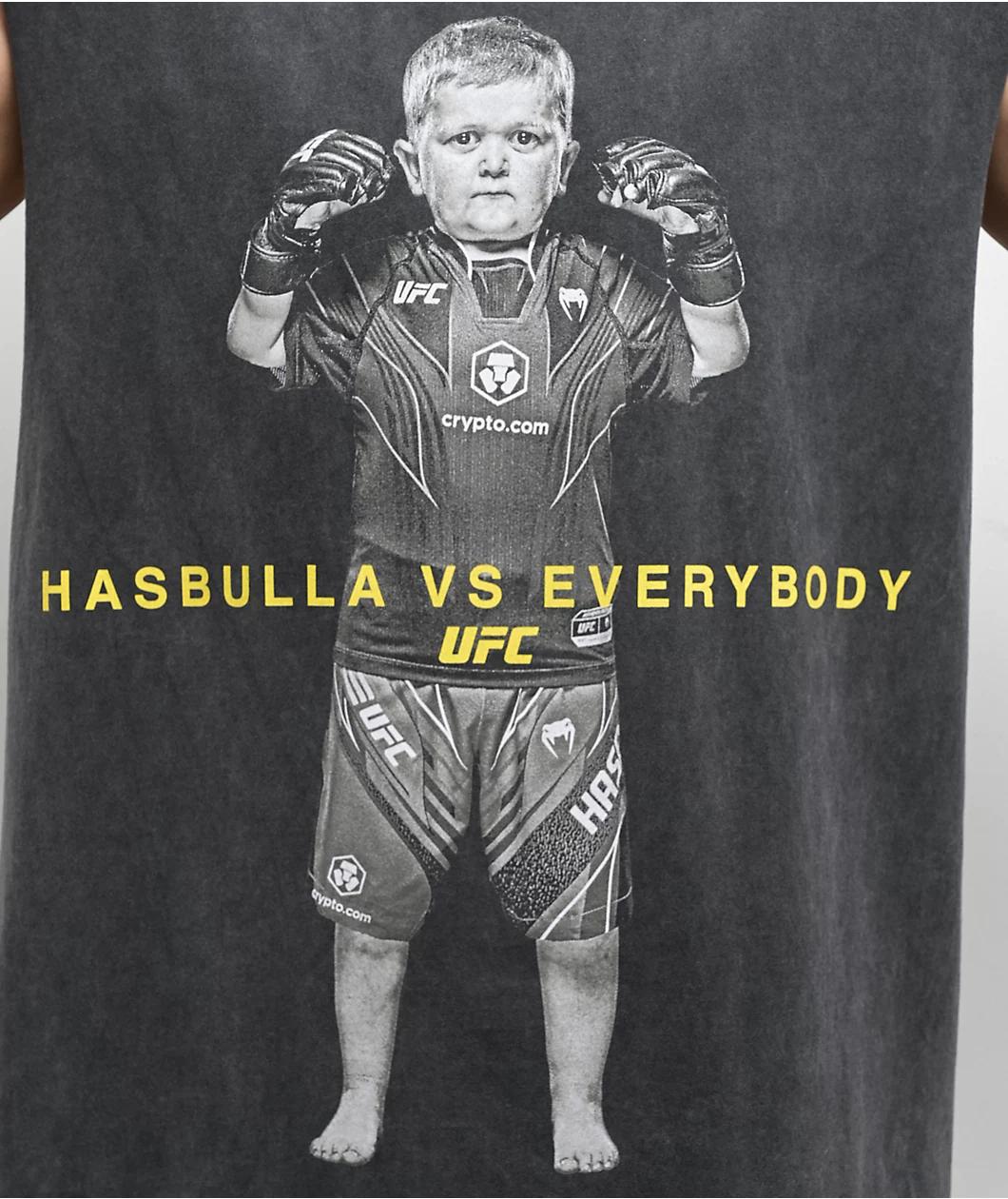 Presented by the UFC in a washed black cotton build, the Hasbulla Lone Wolf tank top arrives with a printed graphic on the front and unfinished arm openings for a DIY cut-off aesthetic. Showcasing the 22 year old social media influencer on the front