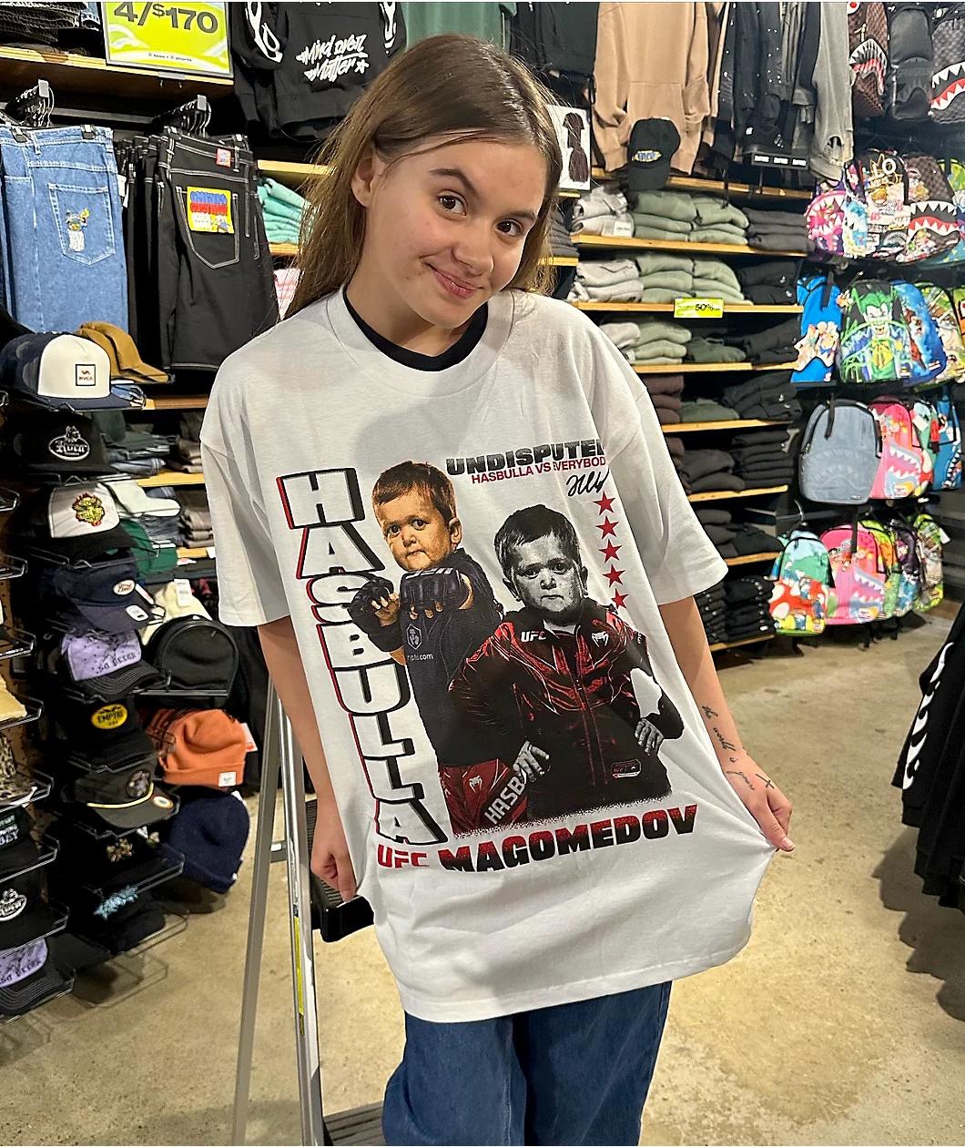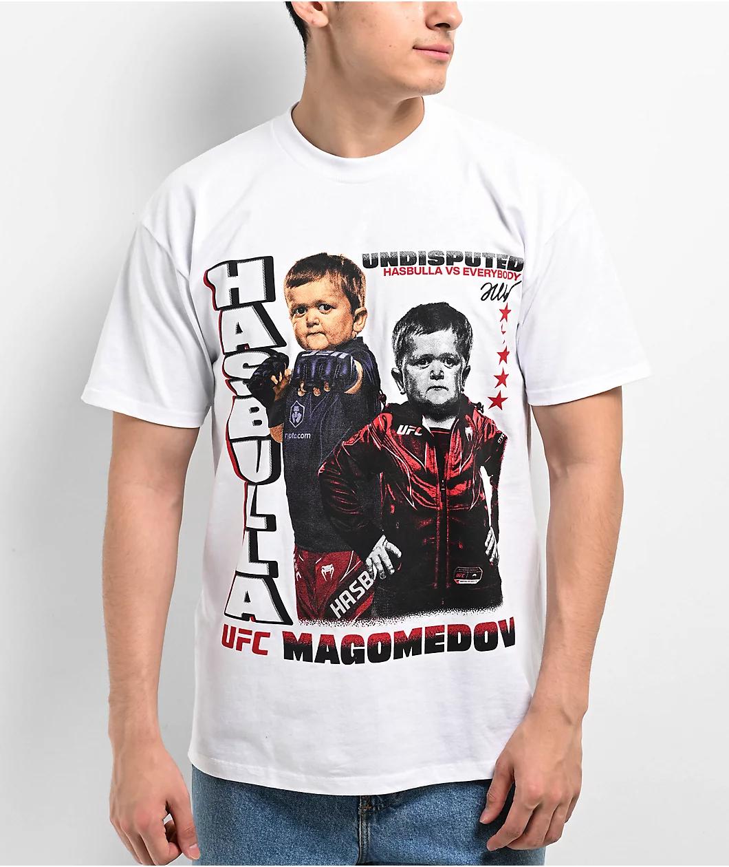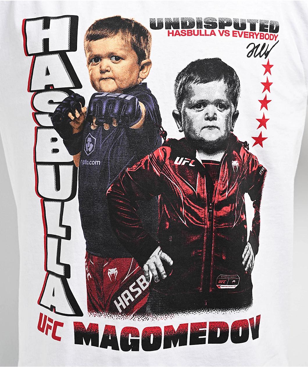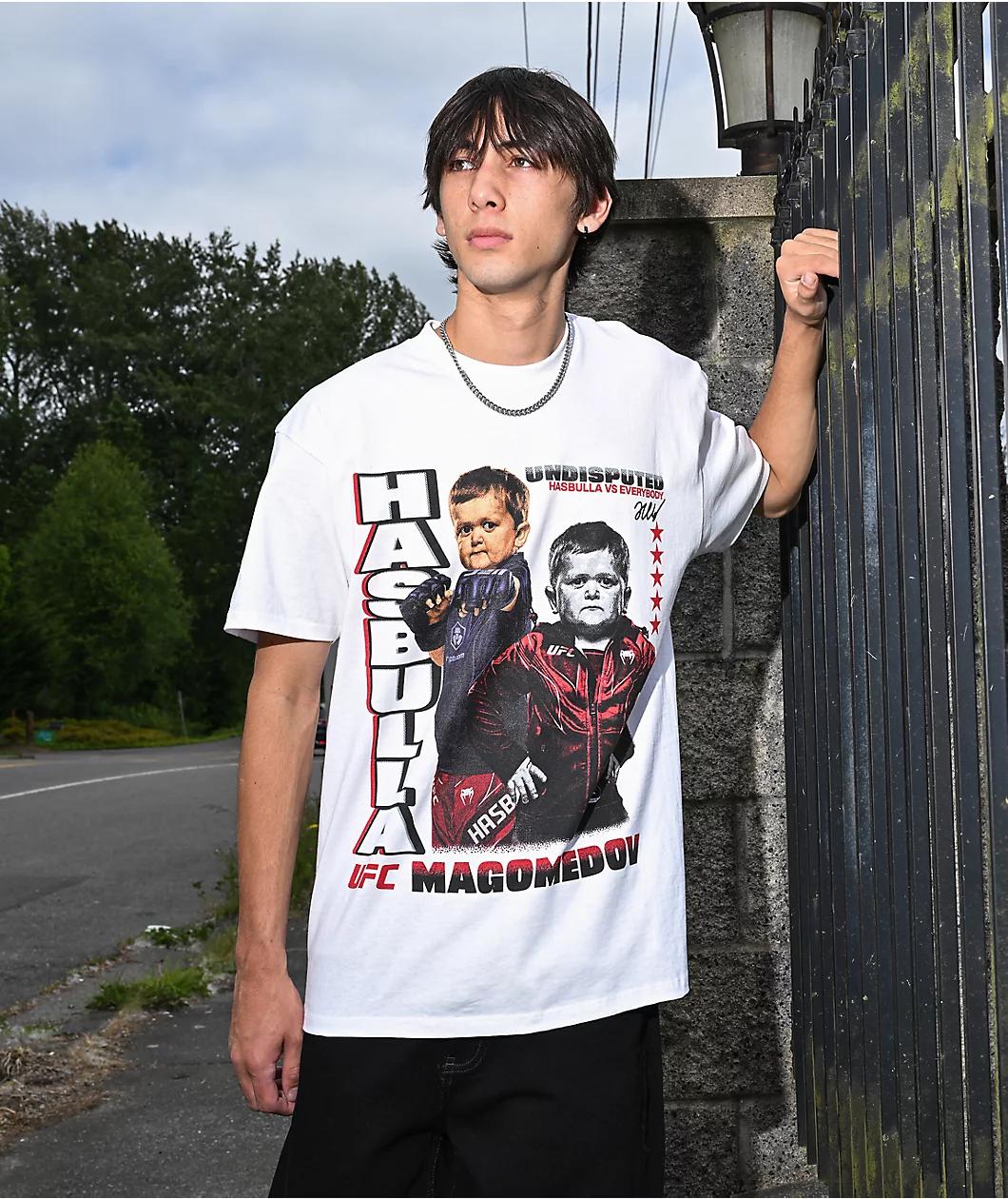 Made famous on social media by the UFC, the Hasbulla t-shirt arrives in a crispy white colorway with a 100% cotton construction and a printed graphic on the front. A Russian cultural phenomenon in his twenties, Haschbullah Magomedovich Magomedov is p