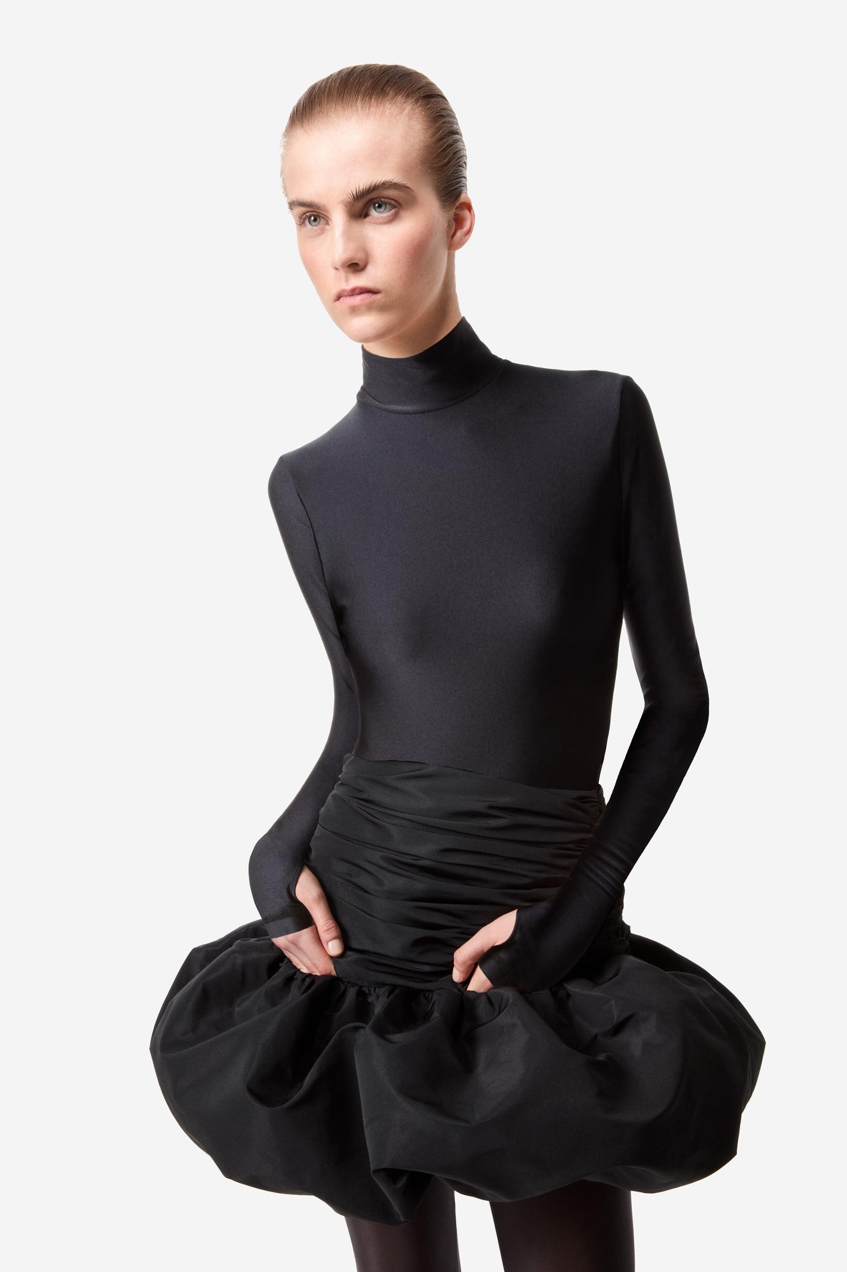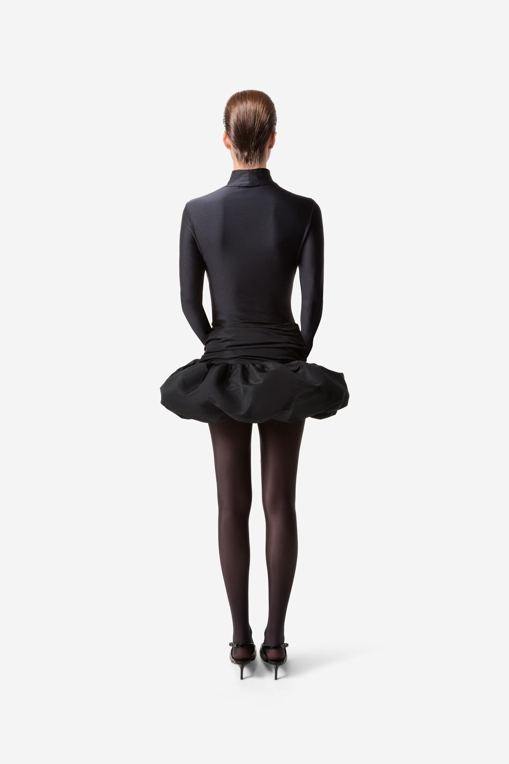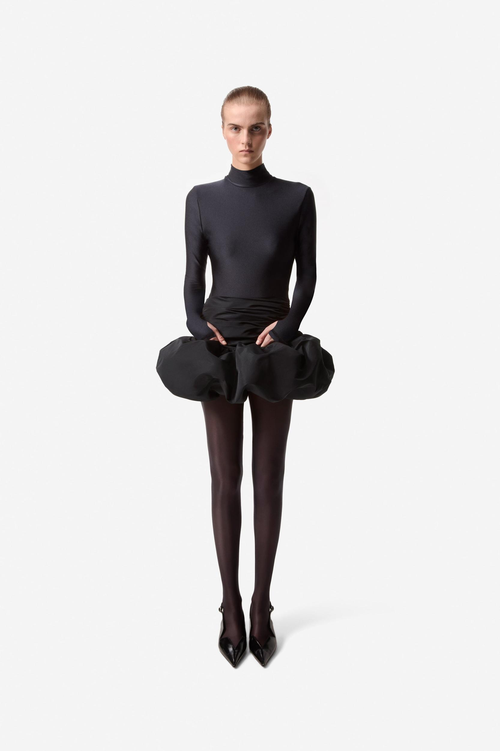 Black puffball mini dress.Coperni’s Fall 2024 collection draws inspiration from science fiction, alluding to space exploration and alien lifeforms. This ruched mini is a futuristic twist on a puff-hemmed bubble skirt with intricate folds and draping around a ring of thick fabric which hovers like a little UFO above the thighsDetailsBlackCOPJ65F3013100% PolyesterMade in BulgariaSize and Fit