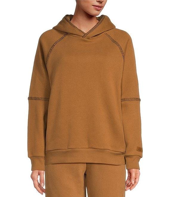 From UGG, this hoodie features: Cotton fleece fabrication Hooded neckline Long sleeves with rib knit cuff Side seam pockets Whipstitch detail on seams UGG® leather license plate label on wearer's left sleeve Standard fit Straight rib knit hemline Pullover construction Approx. 28" length Cotton/recycled polyester Machine wash/tumble dry Imported