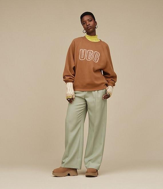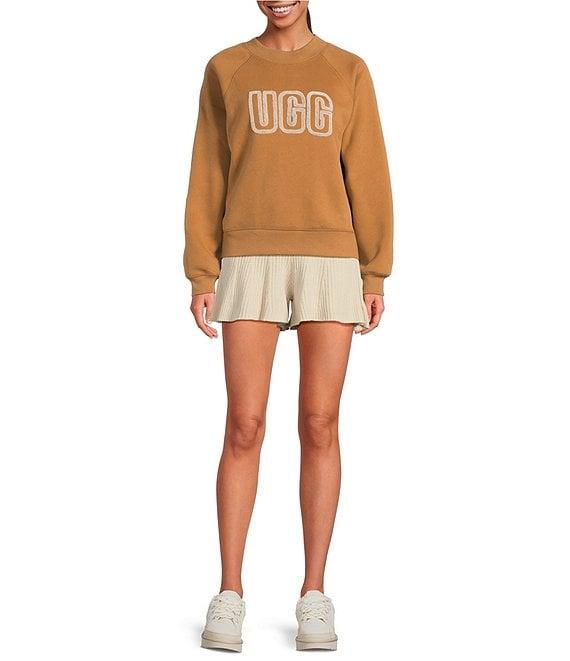 From UGG®, this sweatshirt features: Knit fabrication Crew neckline Long sleeves UGG® Font applique in Chenille knit yarn Rib knit neckline, cuffs, and hem Pullover construction Approx. 24" length Cotton/polyester Machine wash cold/tumble dry low Imported.