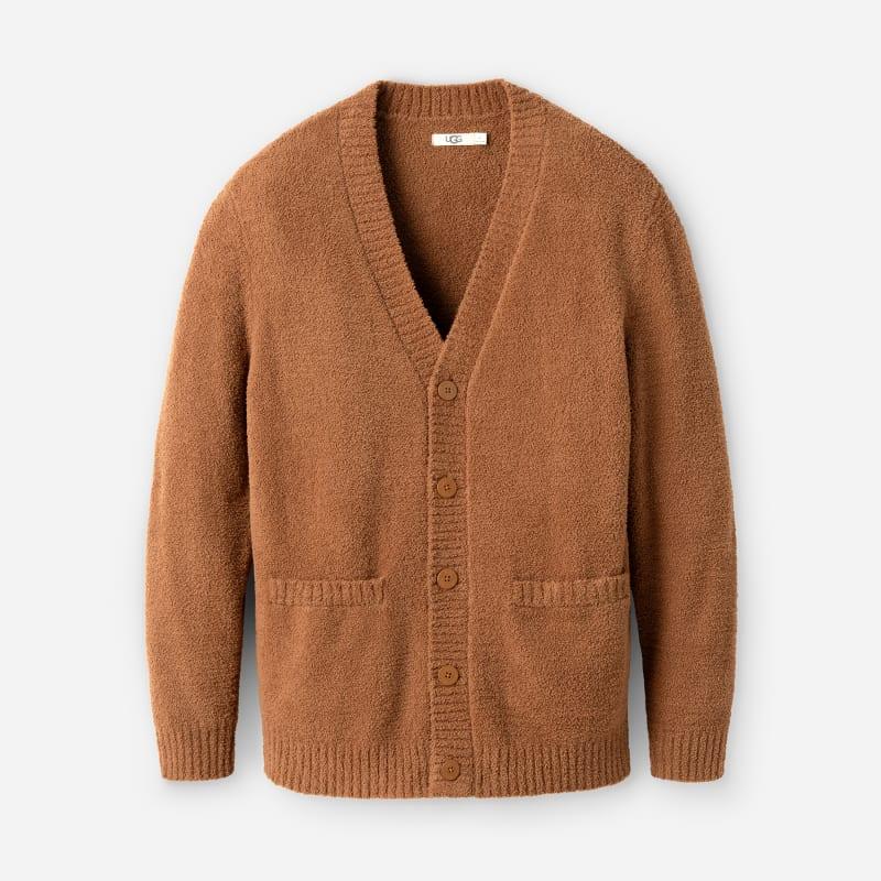 Nobody lounges better than the Lowry Cardigan. With ribbed details, front patch pockets, and our 100% recycled Cozy Knit, youll rearrange your weekend plans around where you can wear the Lowry (HINT: its everywhere). V-neck cardigan. Cozy Knit - 100% Recycled Polyester. Front patch pockets. Rib cuff, hemline, front band, and pocket opening. Button closure at center front. UGG logo buttons. The UGG Logo woven flag label on wearers left pocket opening. 29 inch HPS Length [Size M]. Imported. UGG Mens Lowry Cardigan Cozy Knit Cardigans in Chestnut, Size XL