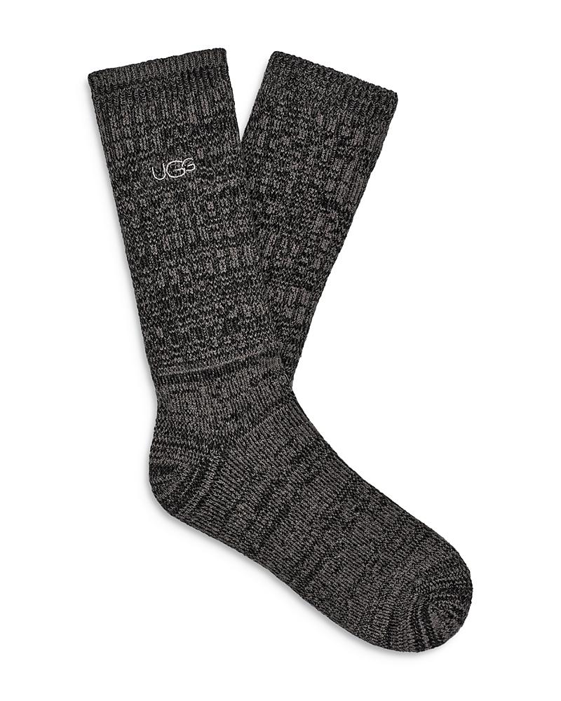 Made from a soft rib knit, this cozy crew sock is designed for a slouchier fit, offering premium relaxation that's perfect around the house. 99% Polyester/1% Elastane. 11 inch height. Cozy crew sock. Packaged with hanger and belly band. Sock size: 10-13. Fits shoe sizes: 8-13. UGG Men's Trey Rib Knit Slouchy Crew Polyester Socks in Black