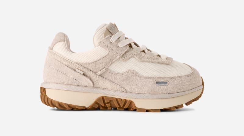 Classic sneaker style done the UGG way. You already know our Retro Fi Low will deliver maximum comfort. It has a molded foam footbed from recycled materials and a responsive sugarcane EVA midsole. Infused with elements from our heritage, the Retro Fi Low features Twin Seam detailing, a mixture of genuine suede and recycled textiles and our Sun Logo Shape tread. Weve also added grooves along the rubber outsole for superior flex and mobility. Textile made with 100% recycled polyester fibers, Suede, Classic boot inspired TPU heel stabalizer upper. Perforated Tongue, Reflective details, The Twin Seam detailing. Recycled polyester laces. Textile Lining made with 90% Recycled Polyester, 10% Spandex, Textile lining (45% recycled polyester, 55% polyester). Sockliner textile made with 100% recycled polyester. Molded foam footbed, Poured PU footbed incorporates at least 50% bio-based content. Sugarcane EVA midsole. Rubber outsole, Outsole flex grooves for flexibitliy and a lightweight feel. The UGG Logo, embossed. RN 88276. UGG Womens Retro Fi Low Textile/Recycled Materials/Suede/Synthetic Sneakers in Ceramic, Size 10