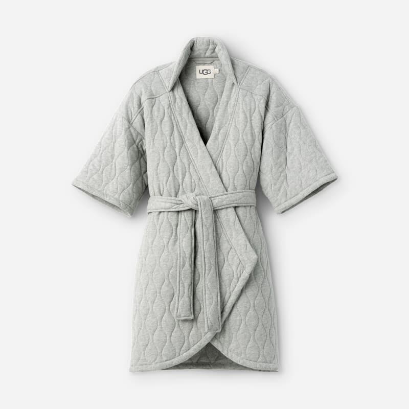 The Zellwood Quilted Wrap gives BCE: Big Cozy Energy. With soft quilting made from Responsible Cotton, a Recycled Polyfill that adds just the right amount of warmth, and a self-belt closure, this wrap is ready for travel days and lounge sessions. Quilted quarter sleeve wrap. 100% Cotton. Made from Responsible Cotton. 100% Recycled Polyester fill. Adjustable placket neckline. Self belt. Embroidered Graphic UGG Font on wearers back neck. 37 3/8 inch Center Back Length [Size S]. Imported. UGG Womens Zellwood Quilted Wrap Cotton Robes in Grey Heather, Size XS