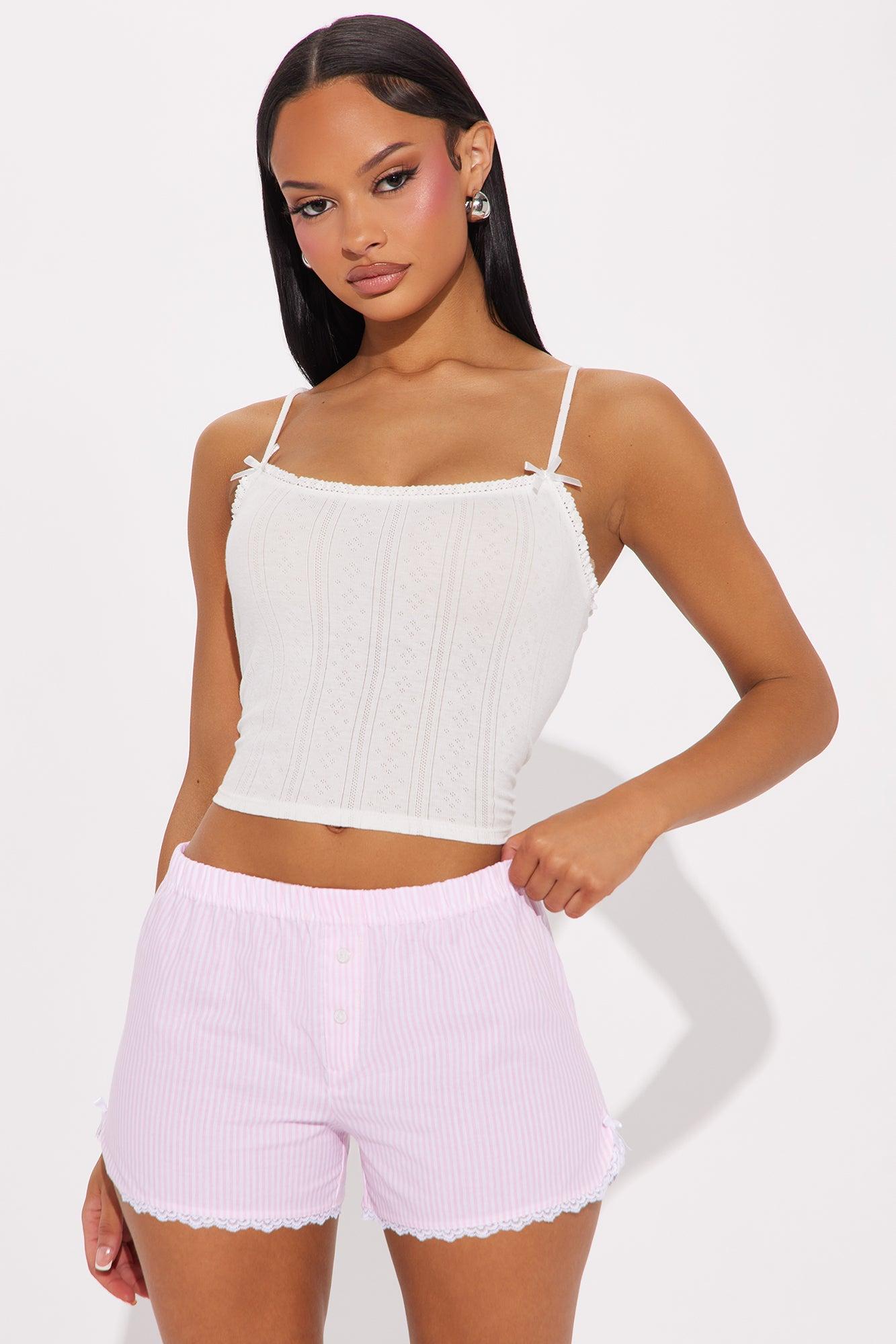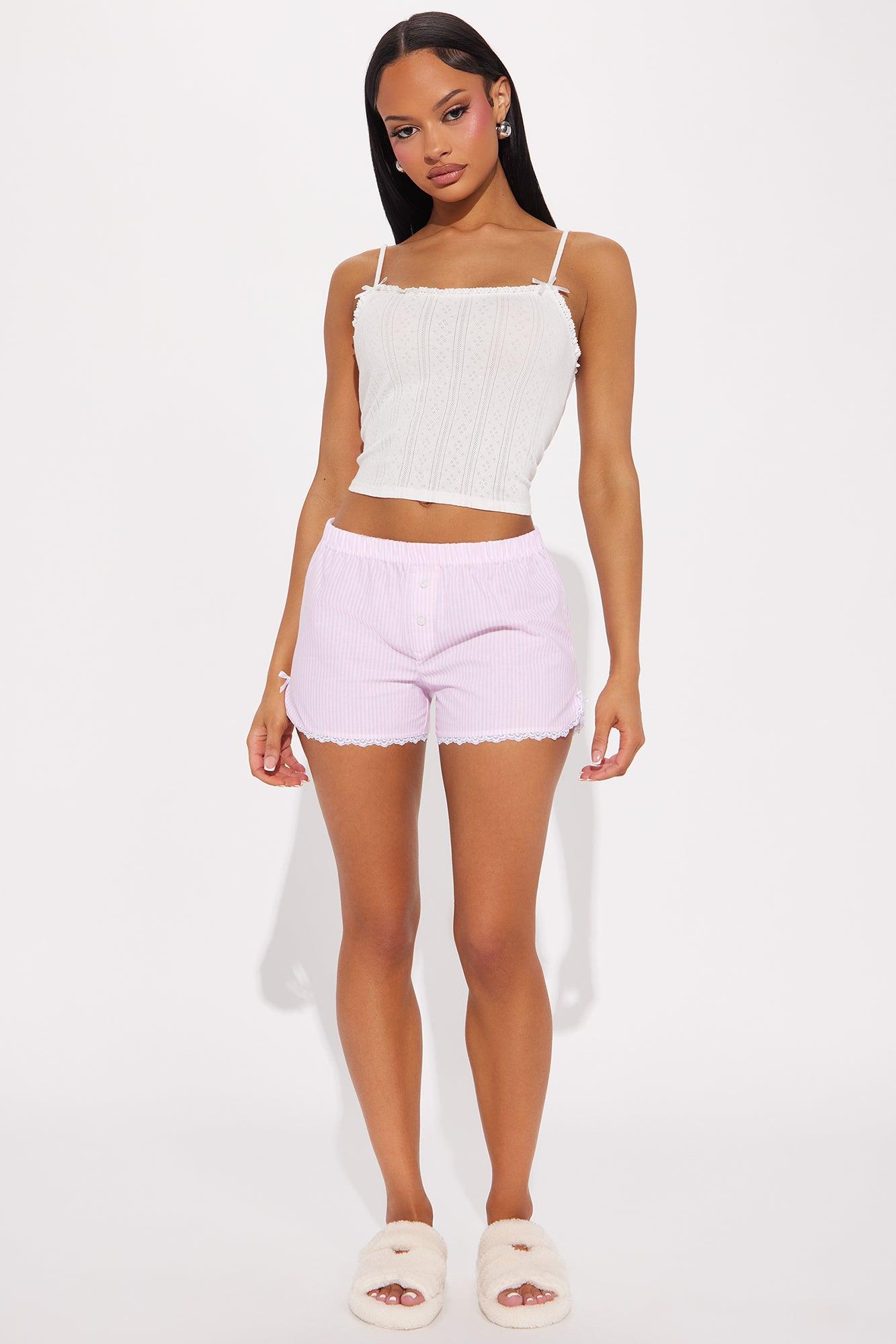Available In Pink. PJ Boxer Short Elastic Waistband Button Up Detail Lace Trim Bow Non Stretch Final Sale 55% Cotton 45% Polyester Imported
