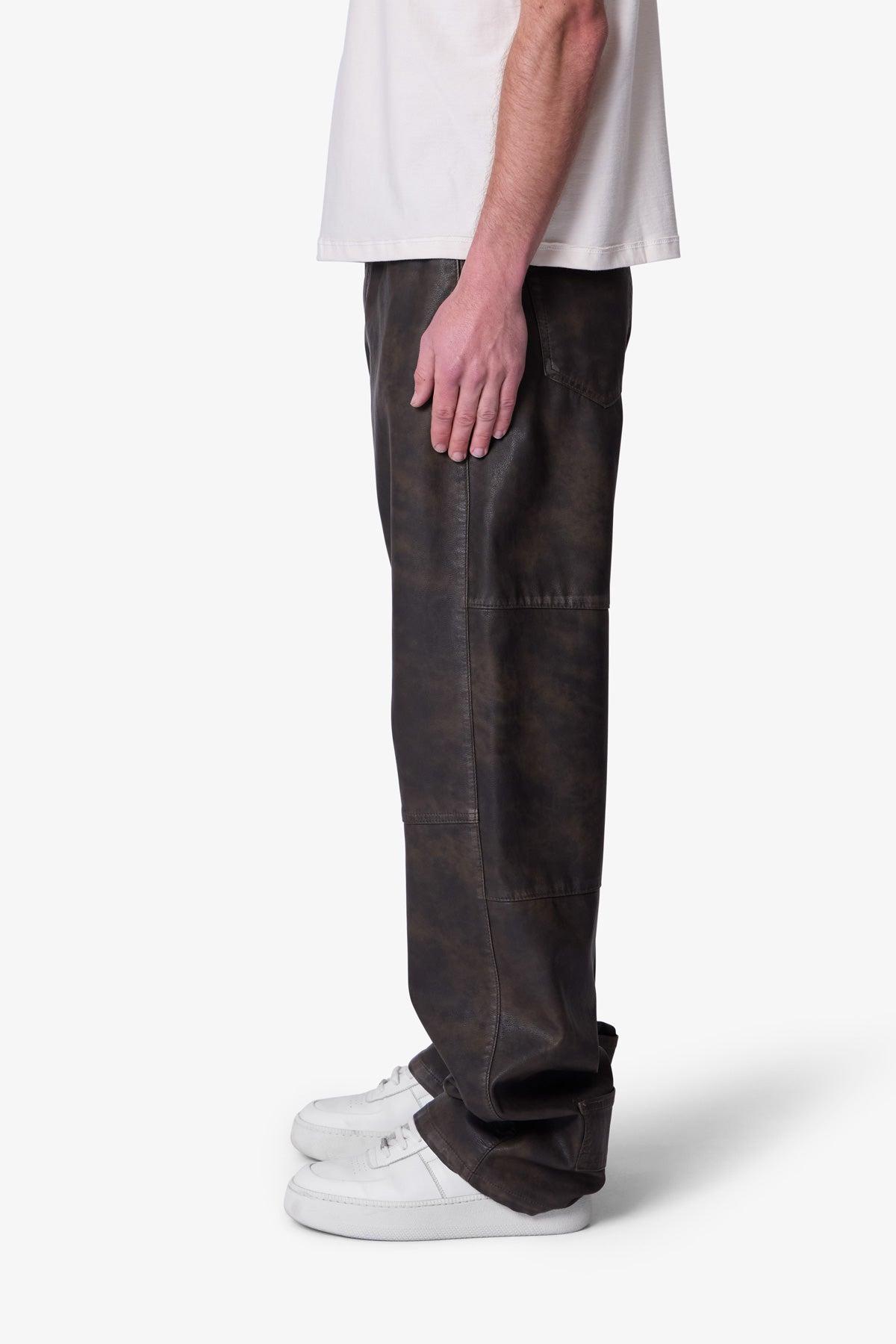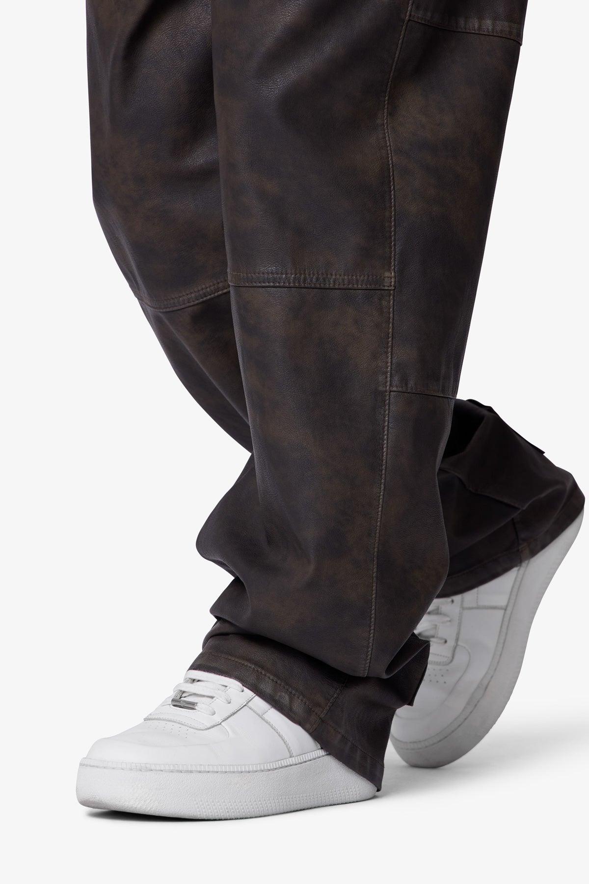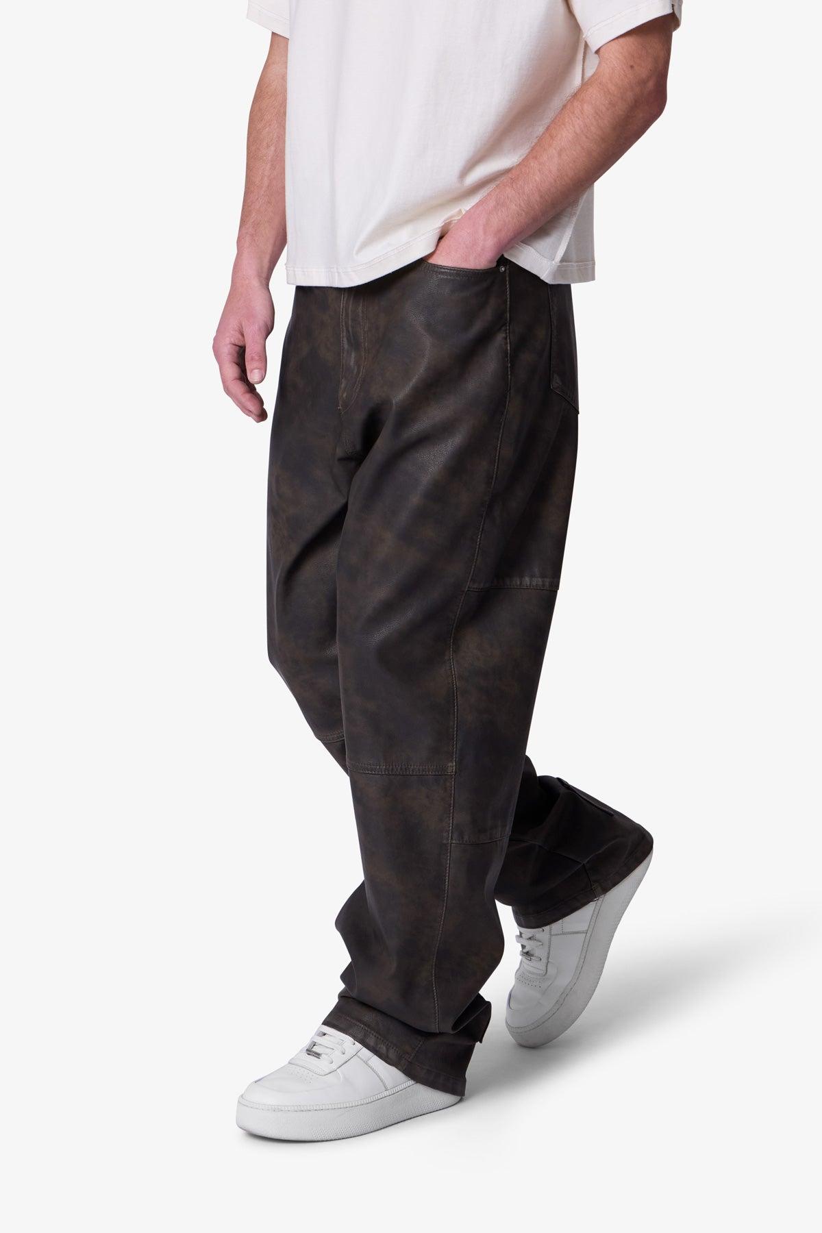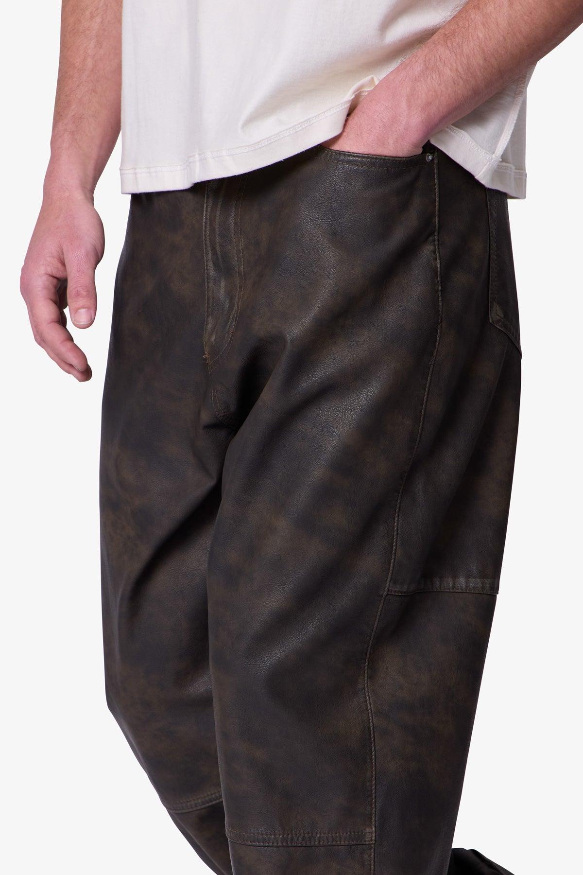 Cut in an exaggerated baggy silhouette, this pant is constructed from marbled faux leather for a distressed, worn-in appearance. Features include a multi-panel design, five-pocket layout, and standard belt loops. details Ultra baggy fit Marbled faux leather 45% polyurethane 55% polyester Multi-panel construction 5-pock