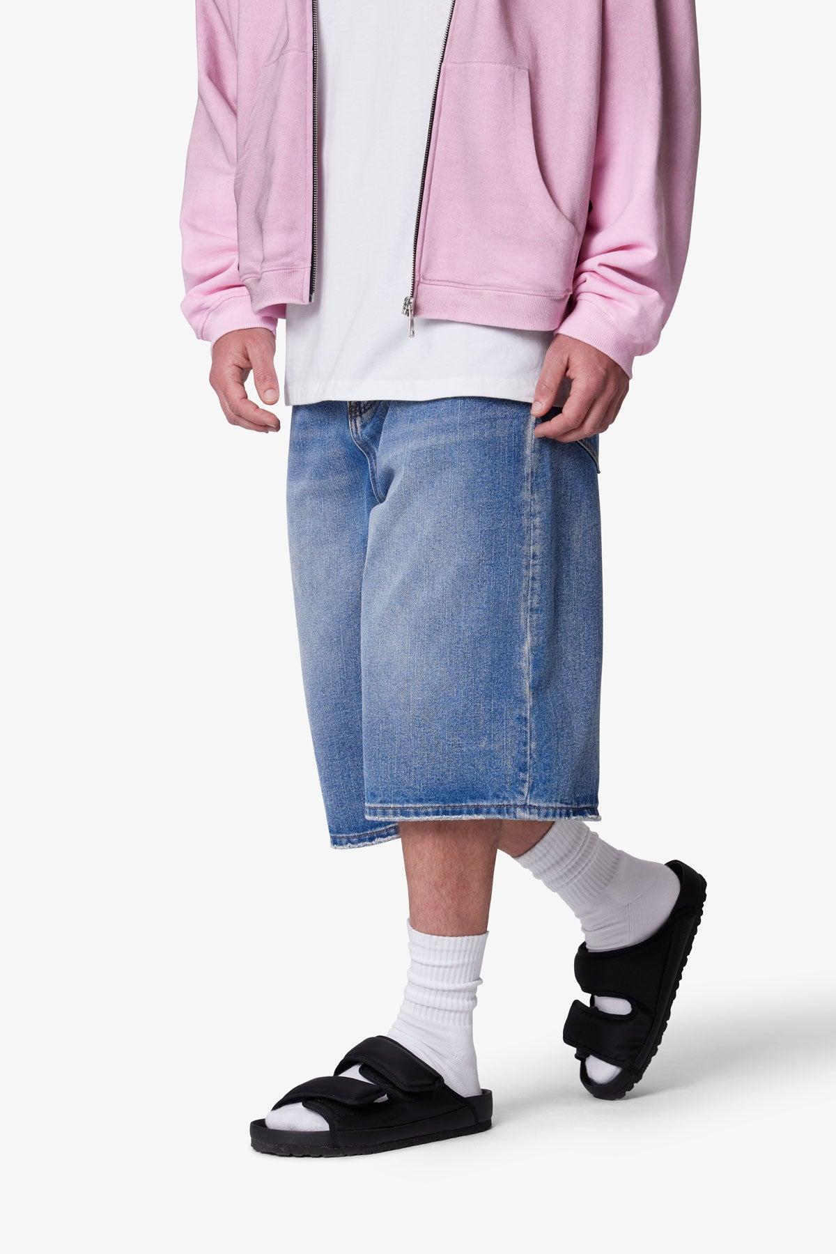 Constructed from a cotton-poly blend, these denim shorts feature a vintage blue wash with subtle front whiskering and fading. Designed with a baggy, wide leg fit and a finished hem with light distressing. Includes a classic five-pocket layout, standard belt loops, and a front button fly. details Baggy, wide leg fit 89%