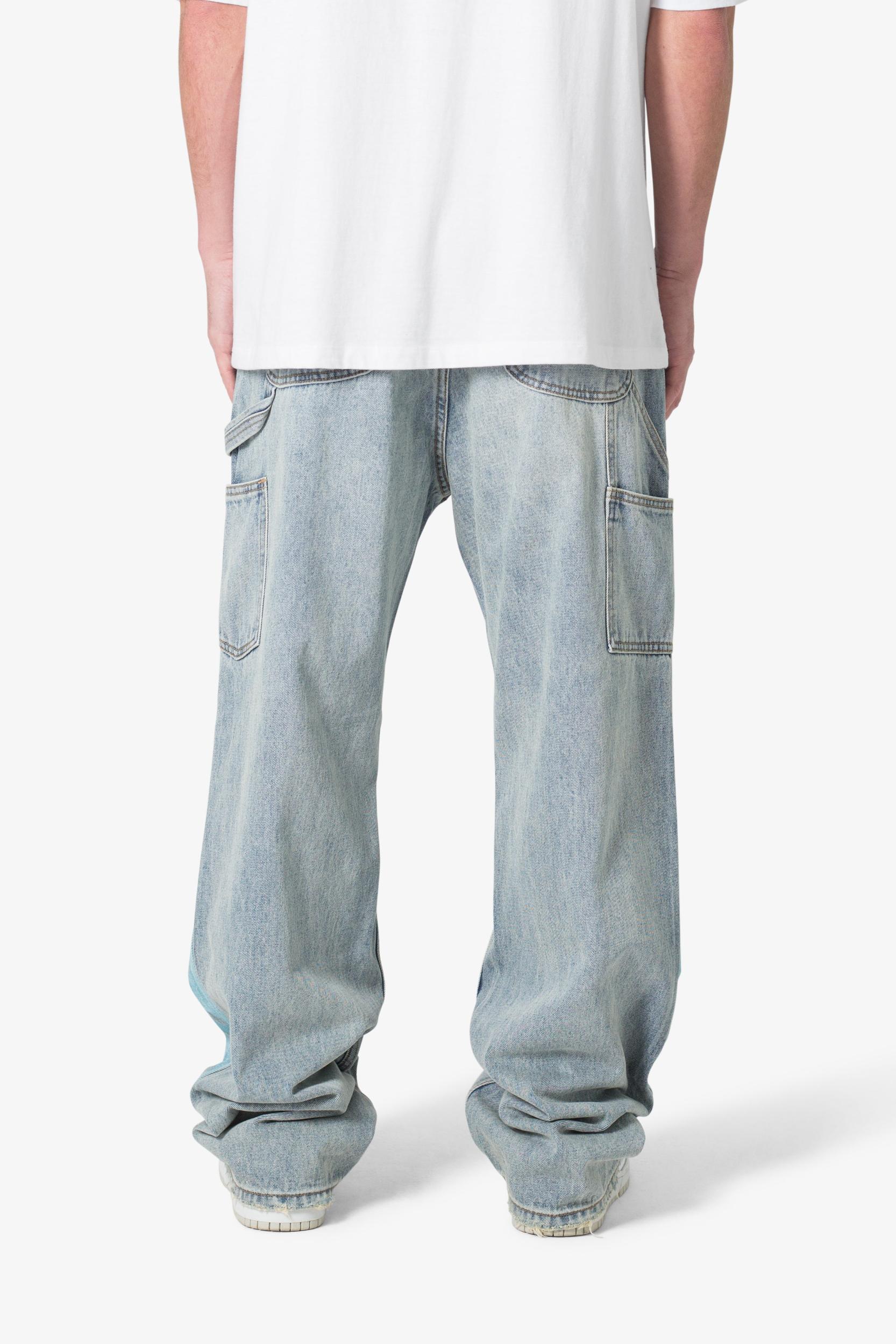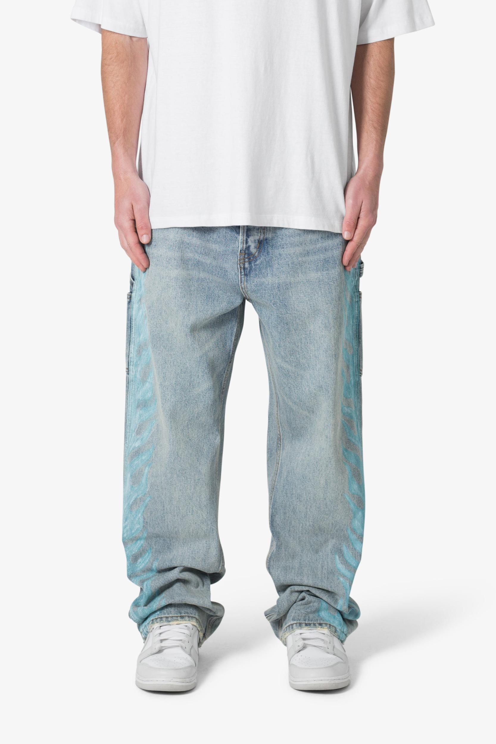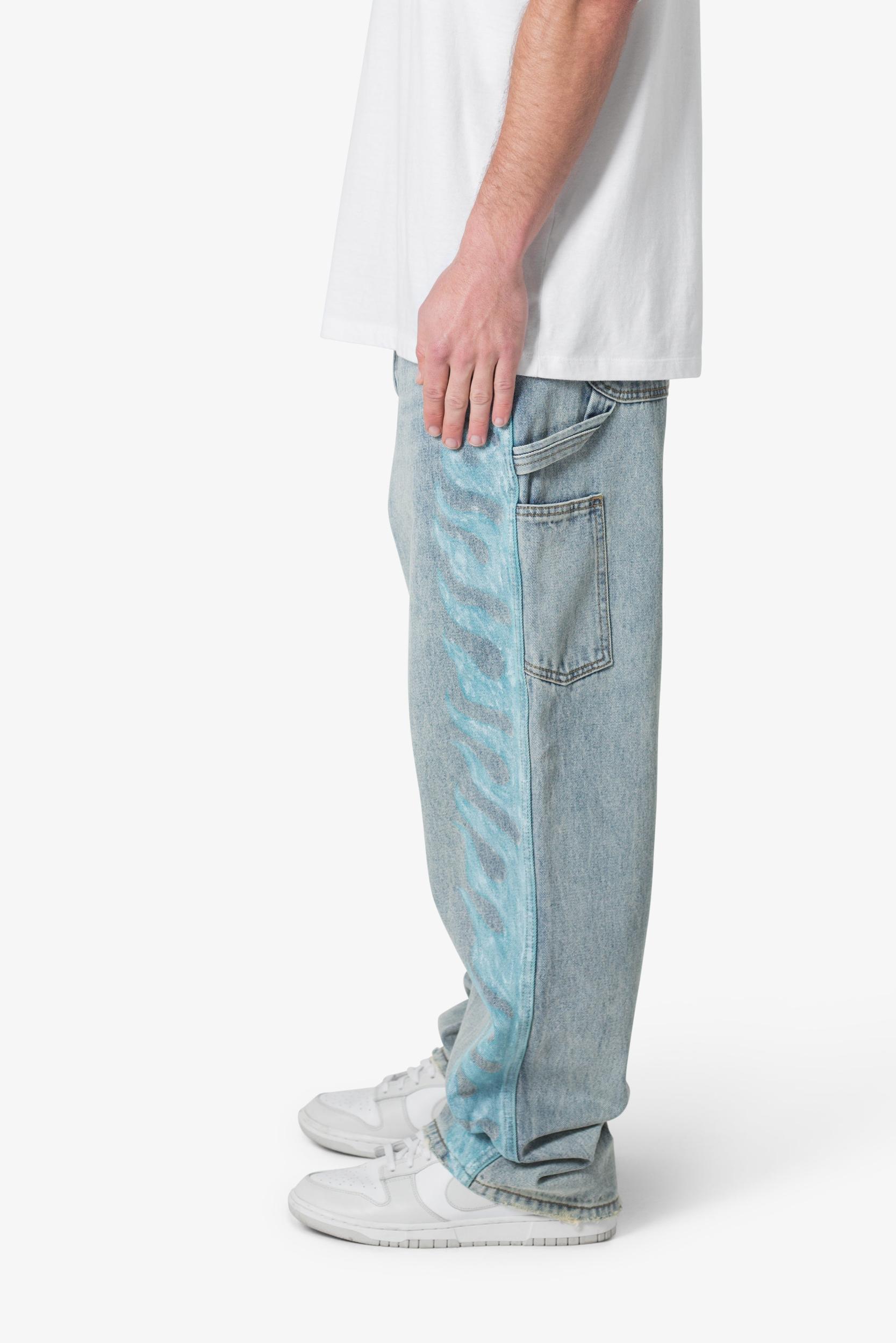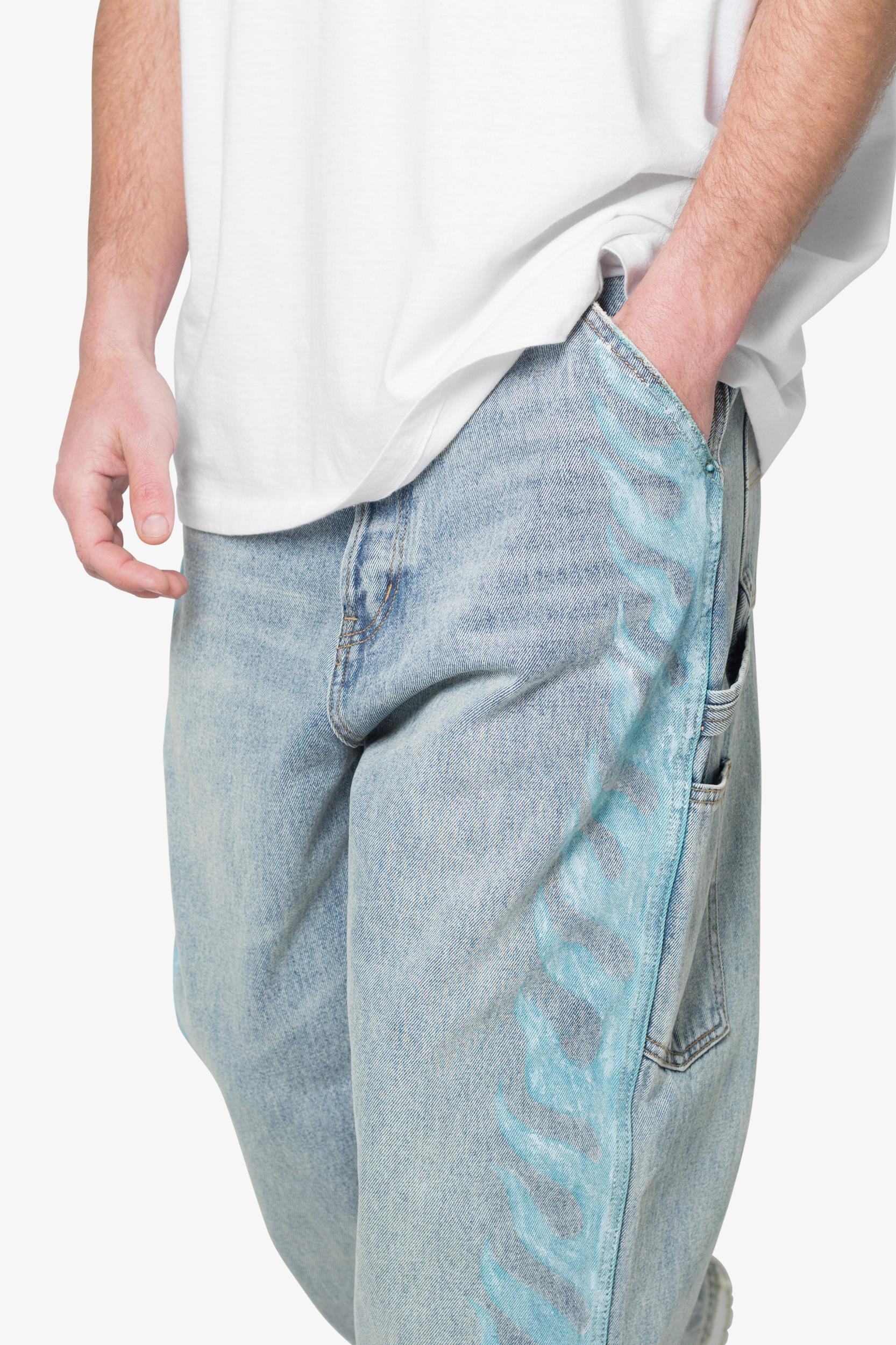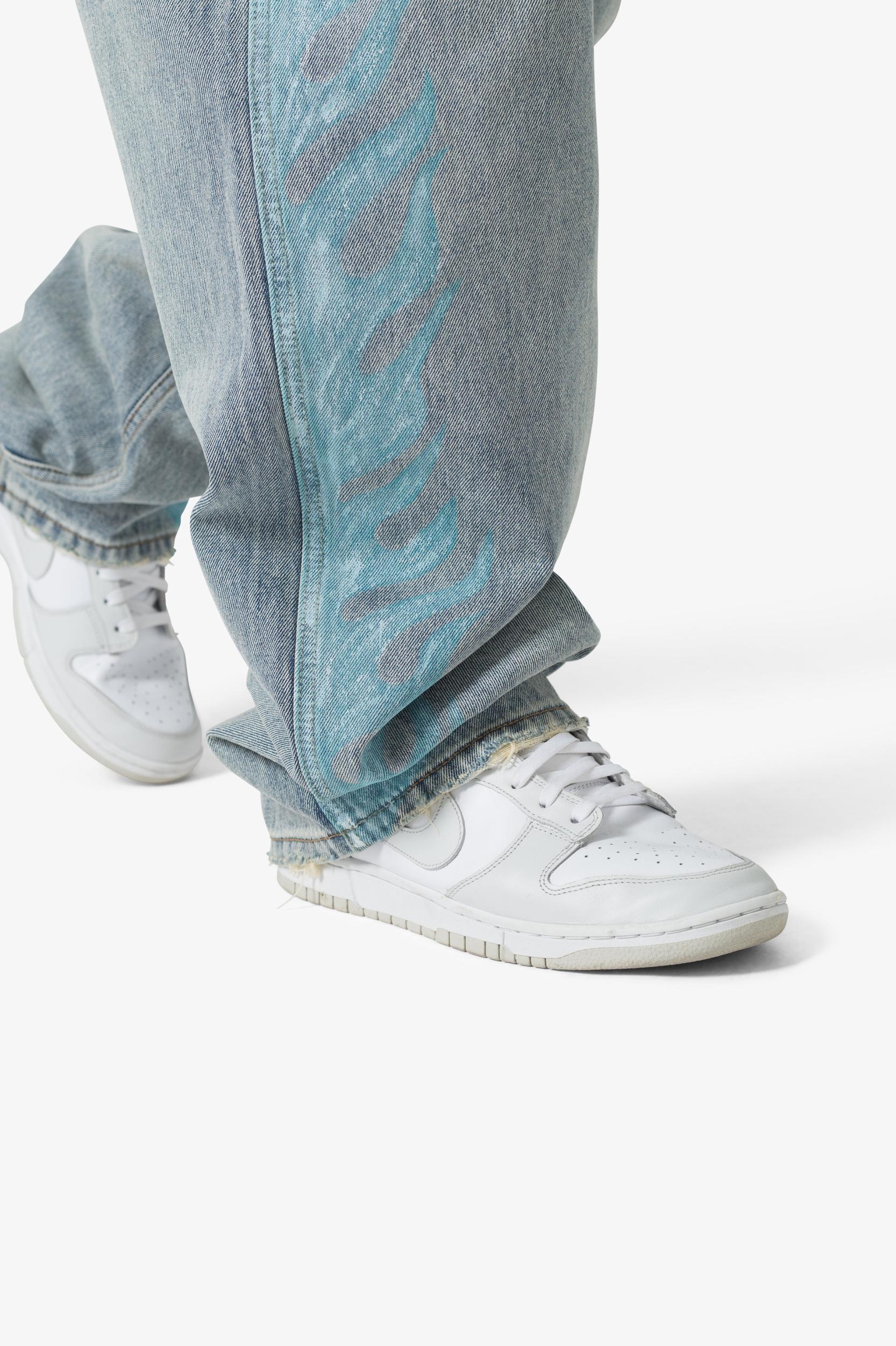 the Ultra Baggy Flame Denim are designed with a new oversized ultra baggy fit, constructed from denim with a light vintage wash, tonal flame artwork up both outseams, featuring standard five pocket denim details, and finished with a button placket. details ultra baggy fit throughout painted details 100% cotton extende